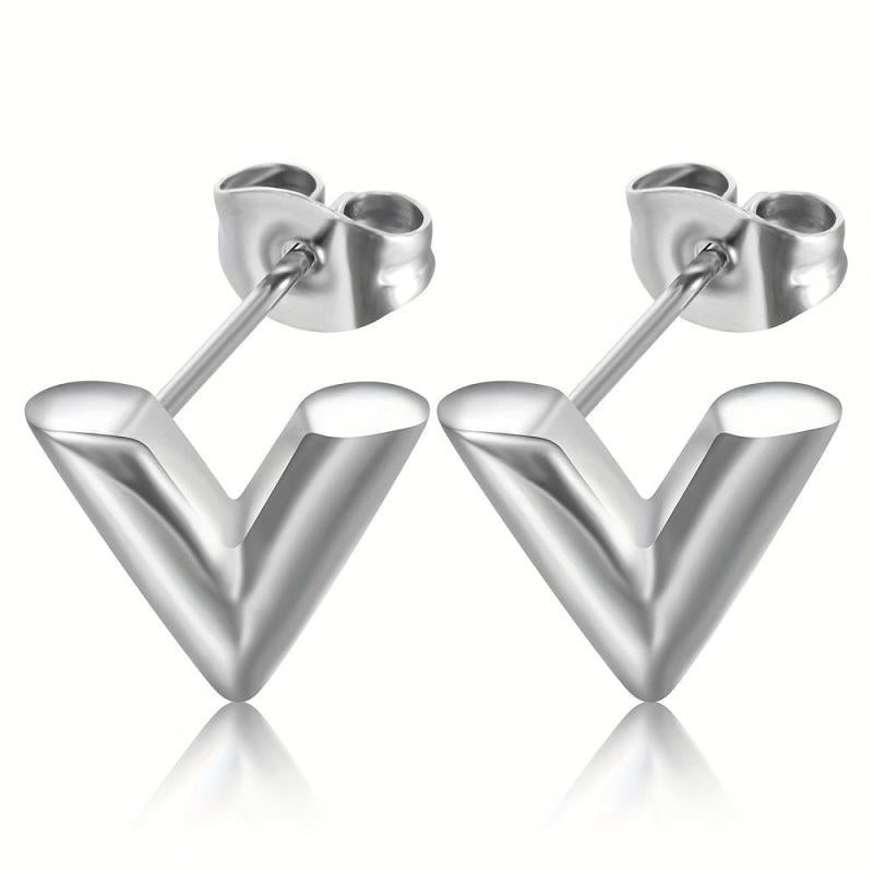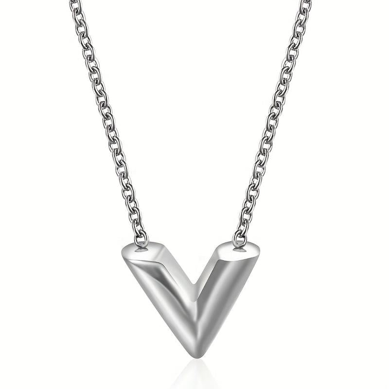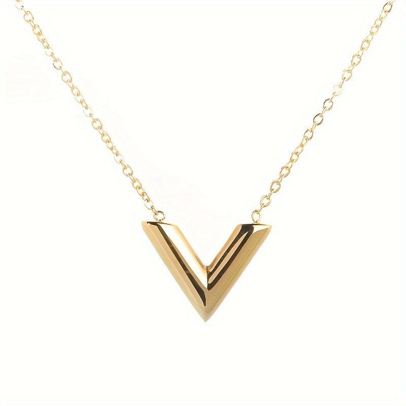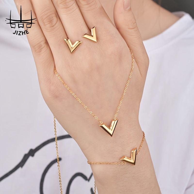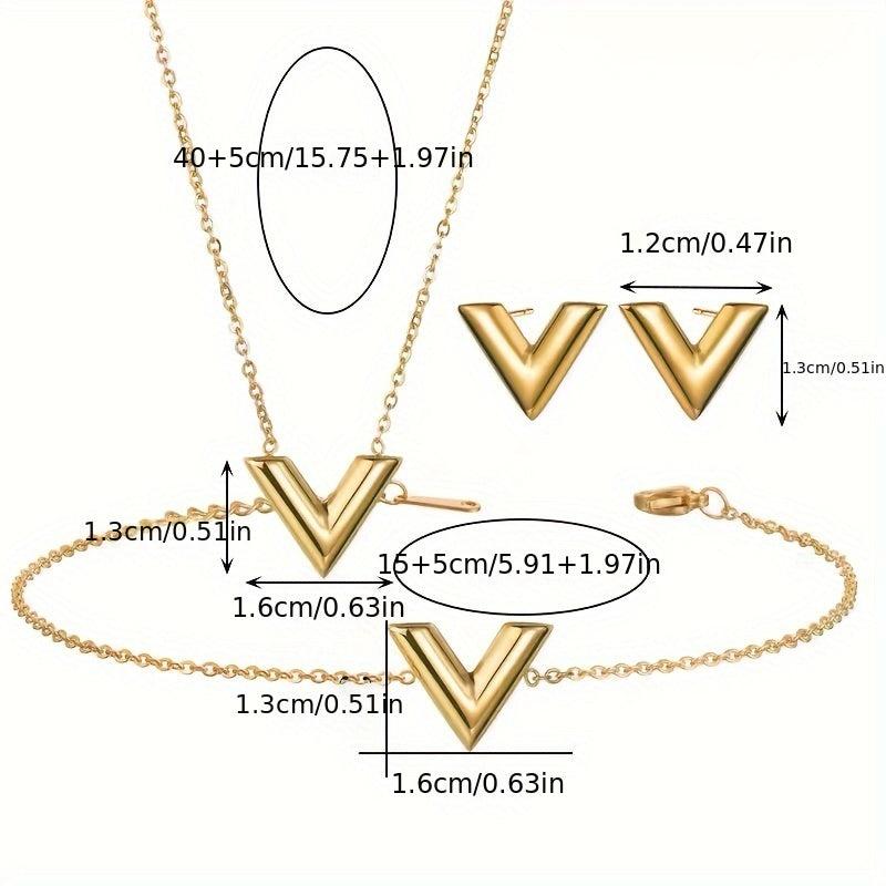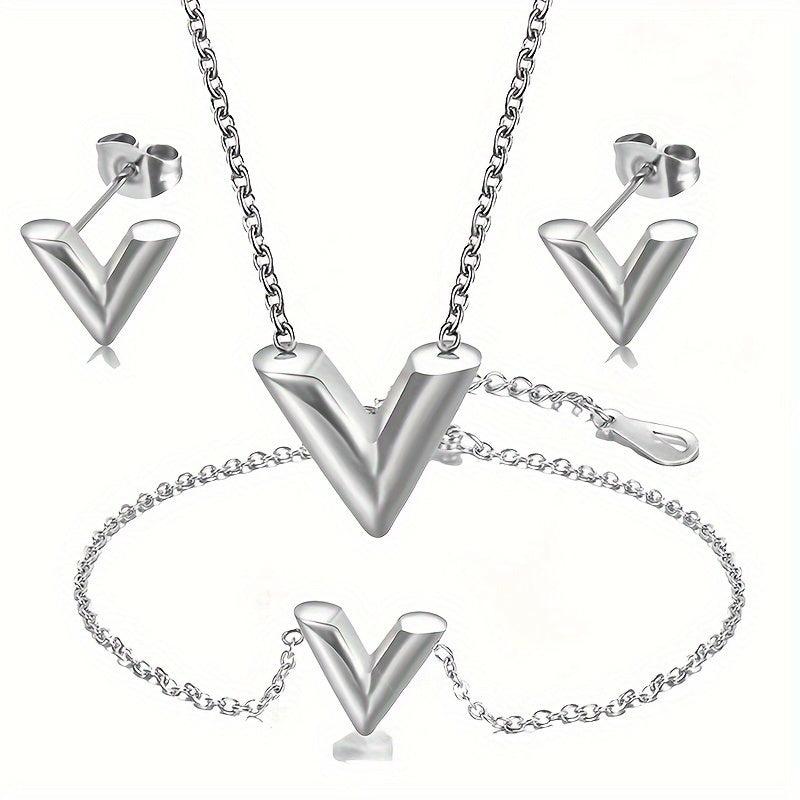 Elegant set featuring silvery stainless steel letter V pendant necklace, earrings, and bracelet. Perfect for parties, banquets, and dancing. Golden style with low allergy potential.