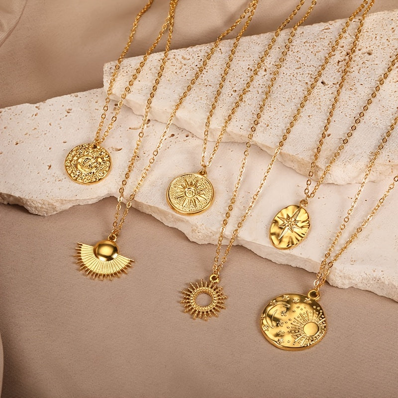Elegant pendant necklace designed with various shapes, crafted in 18K plated metal. This versatile neck chain is a perfect addition to your jewelry collection.