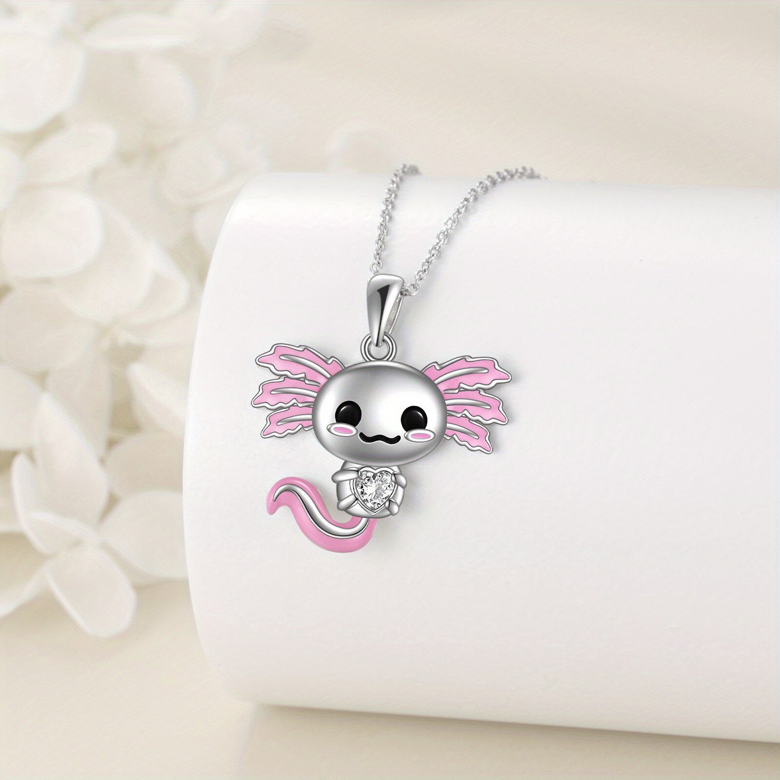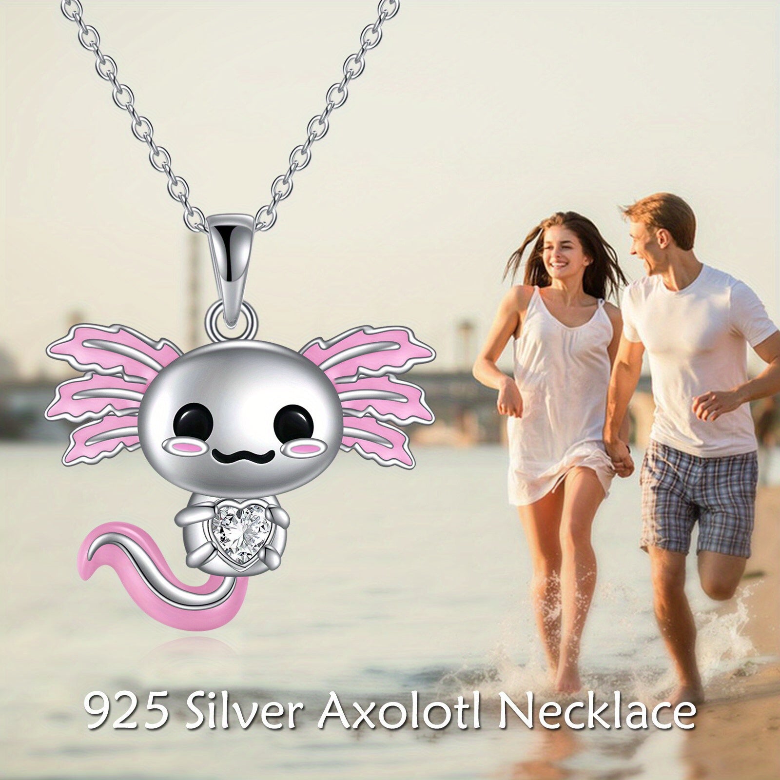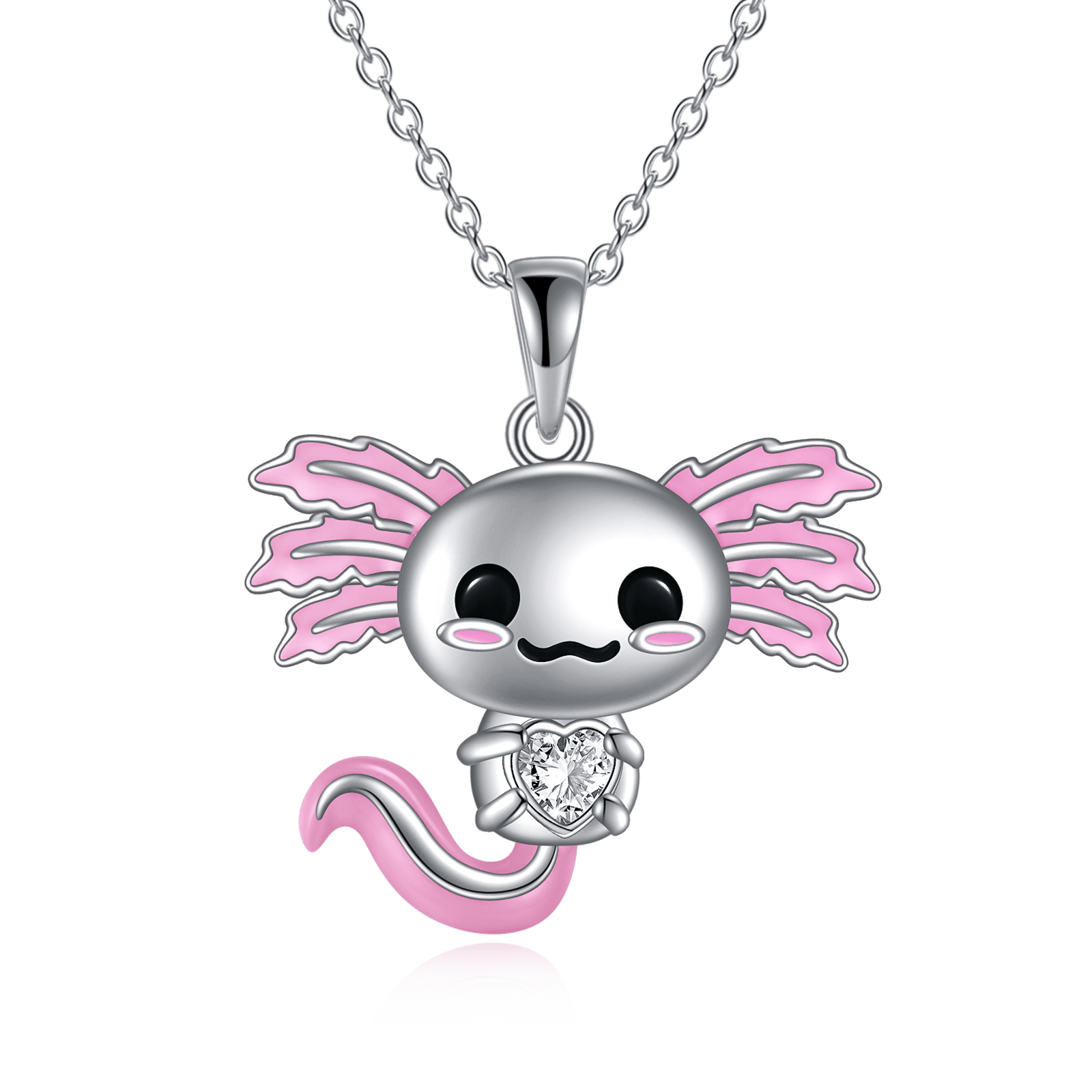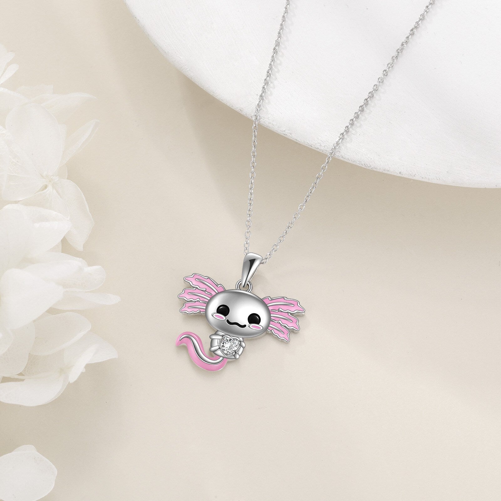 This sterling silver axolotl necklace is a charming accessory for women and girls. Crafted from high-quality silver, this necklace features a detailed axolotl pendant that adds a touch of whimsy to any outfit.