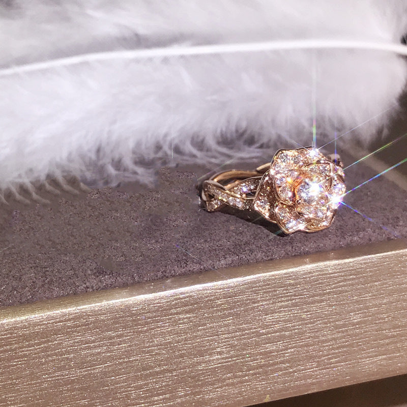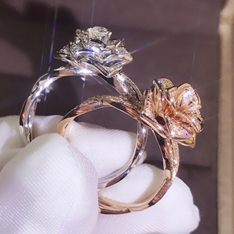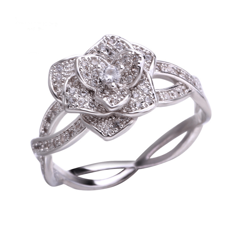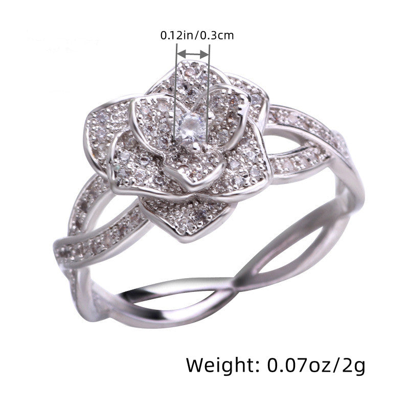 Elegant flower ring in silver plating with shiny zircon stones, perfect for engagement, wedding, or evening party. The intertwined band adds a touch of sophistication to your look.