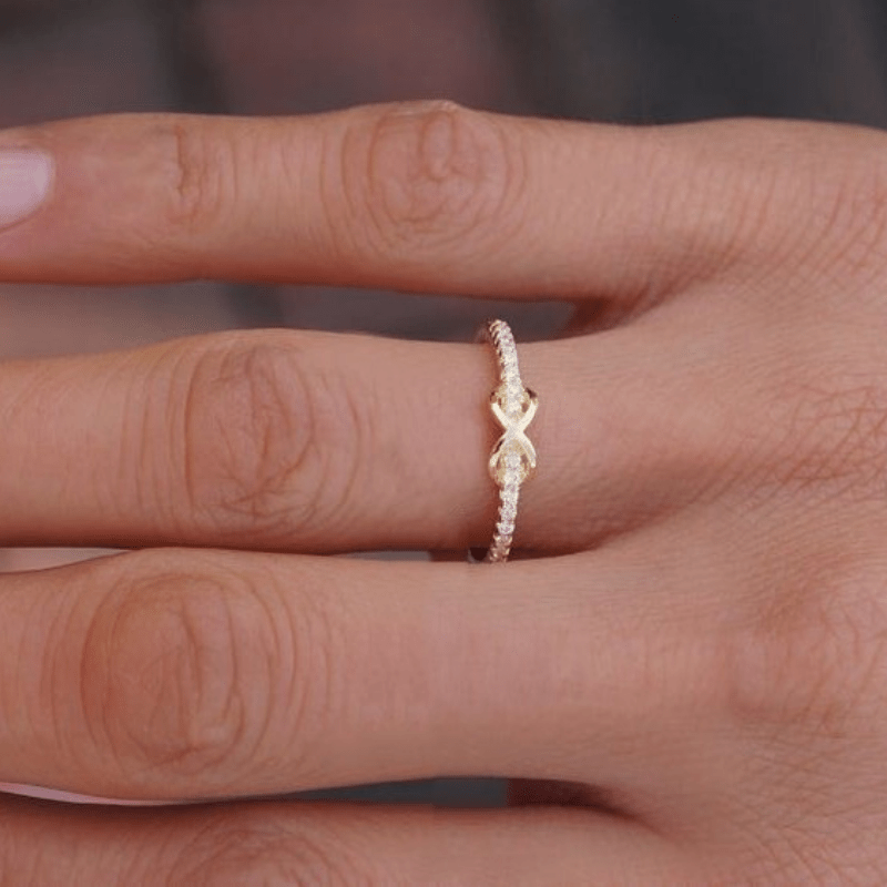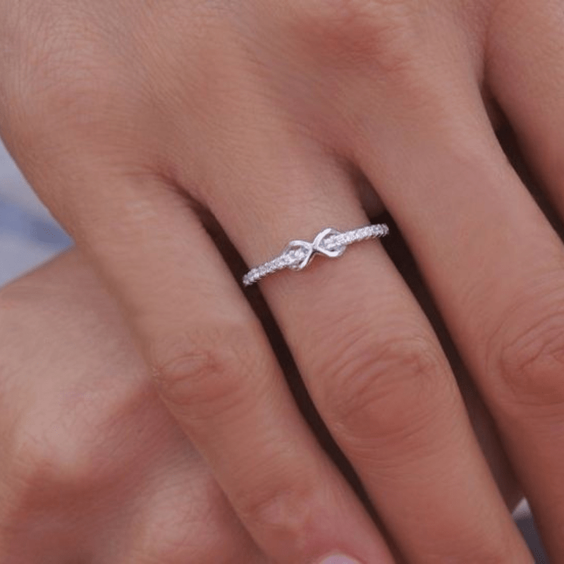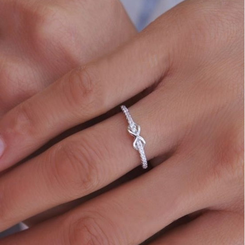 Elegant silver plated ring with infinity shape design featuring zircon stones. Perfect for daily wear and casual occasions.