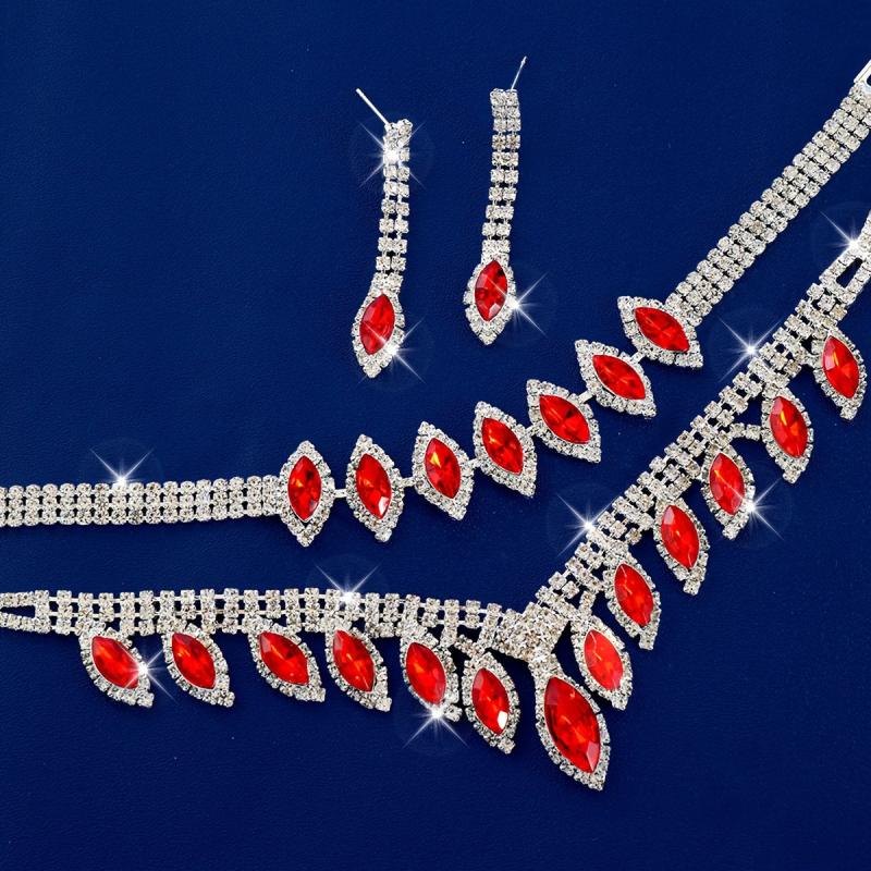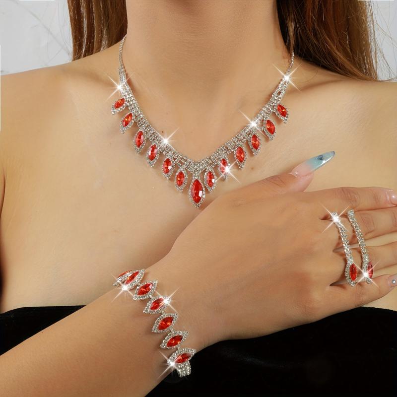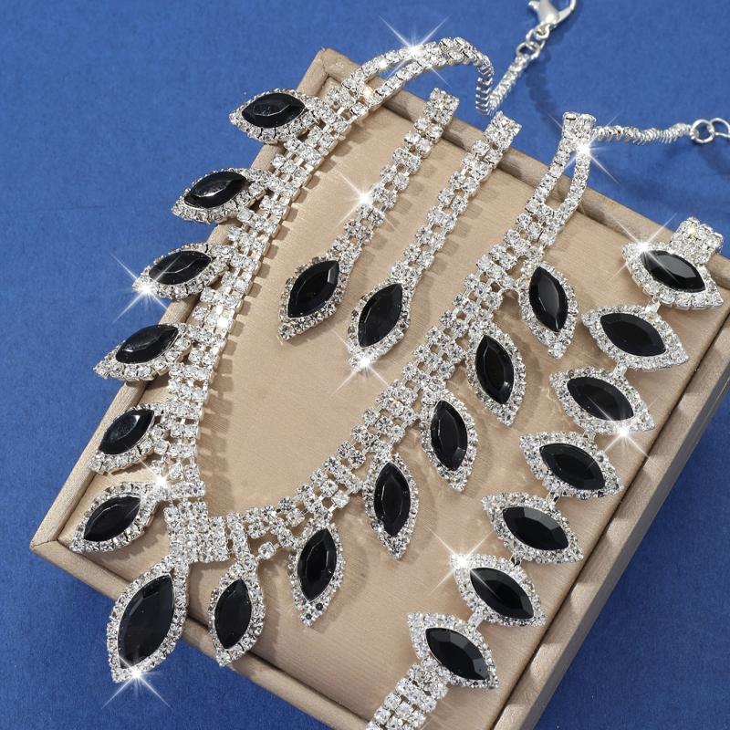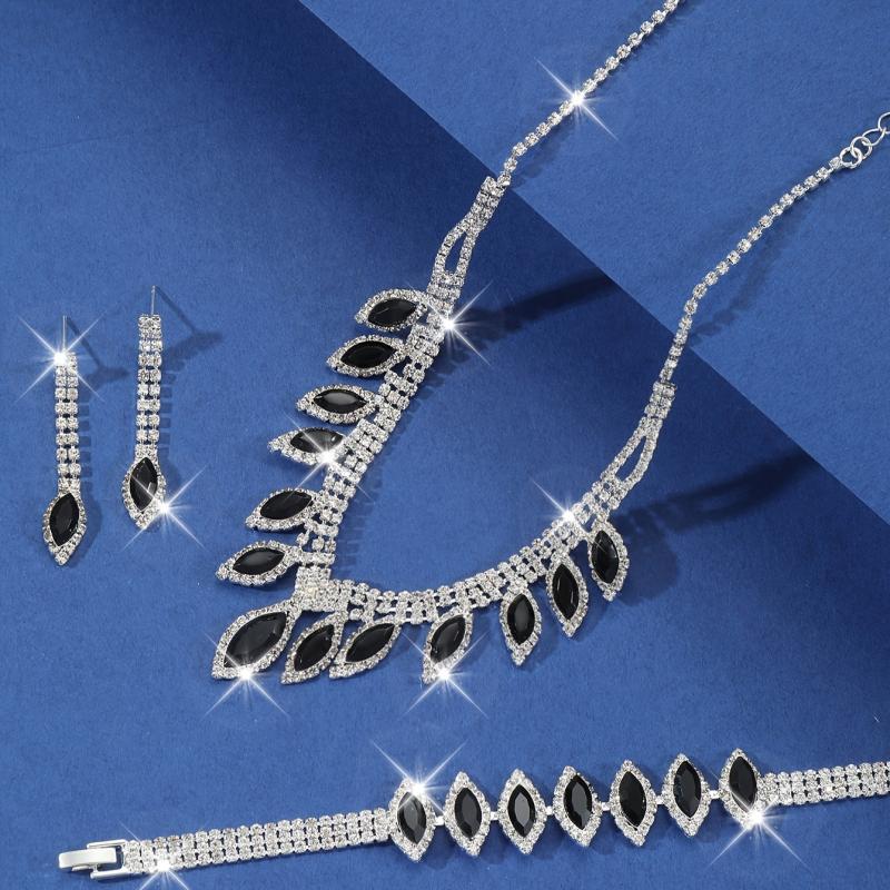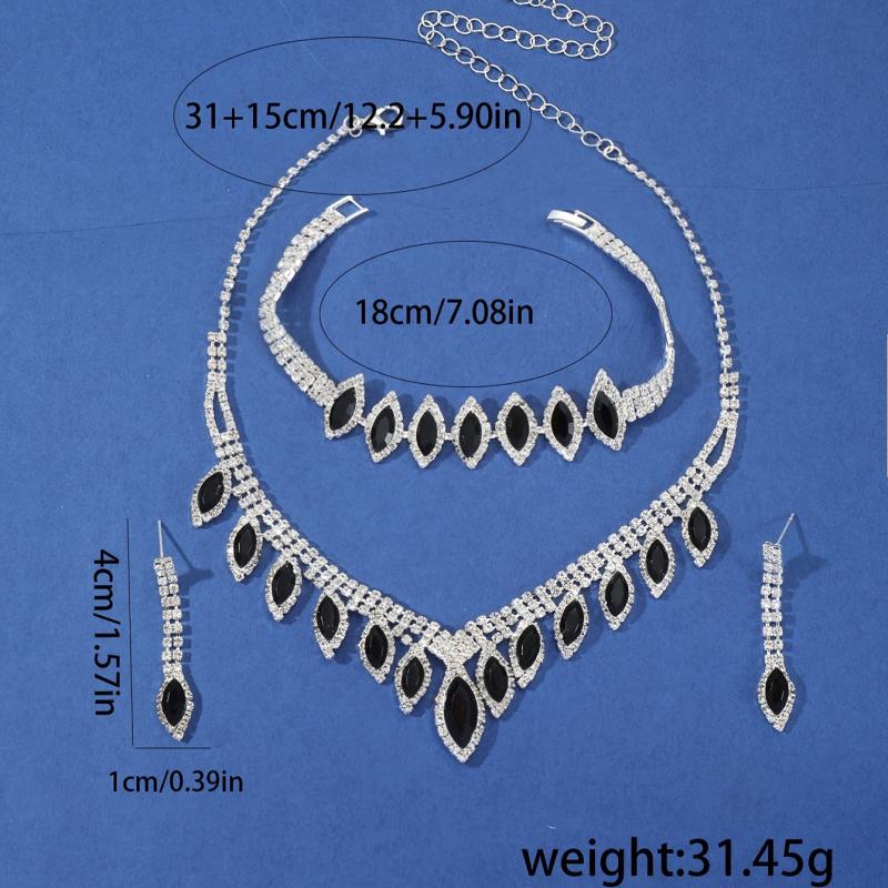 Complete your bridal look with this stunning jewelry set, featuring a silver plated design with rhinestones and stones. Includes necklace, earrings, and bracelet.