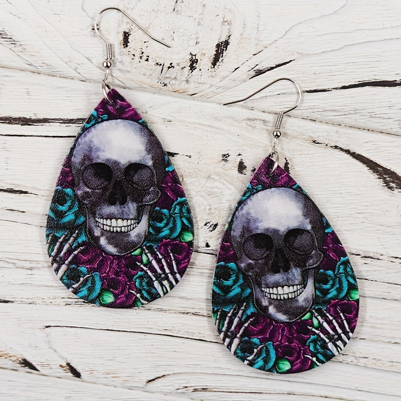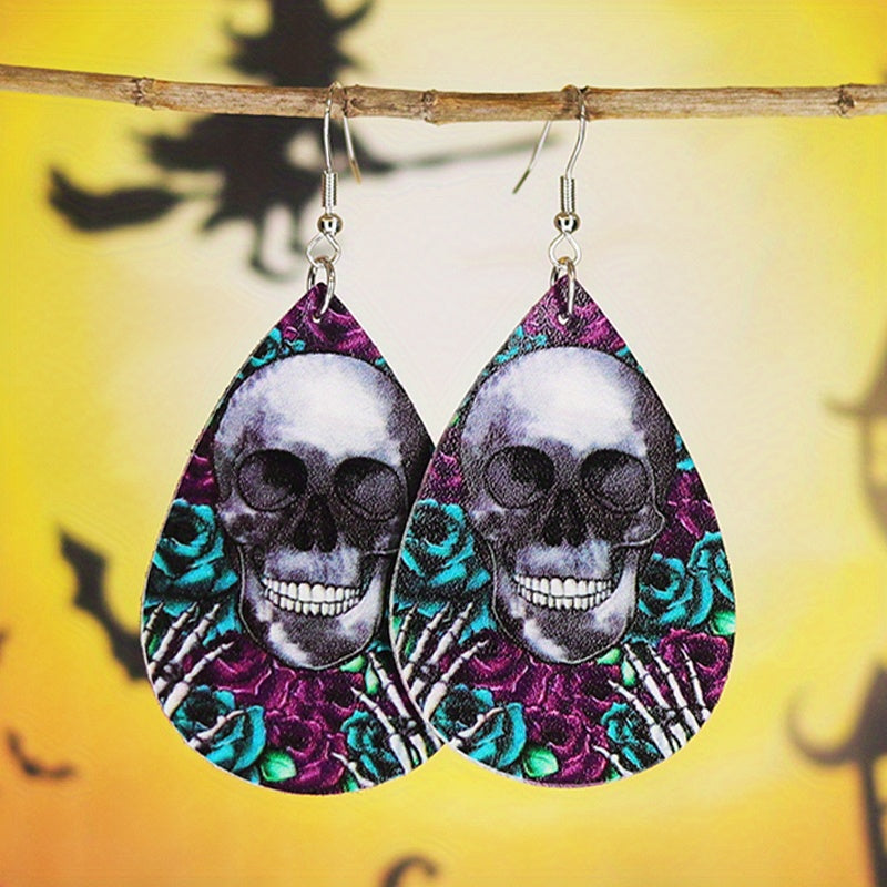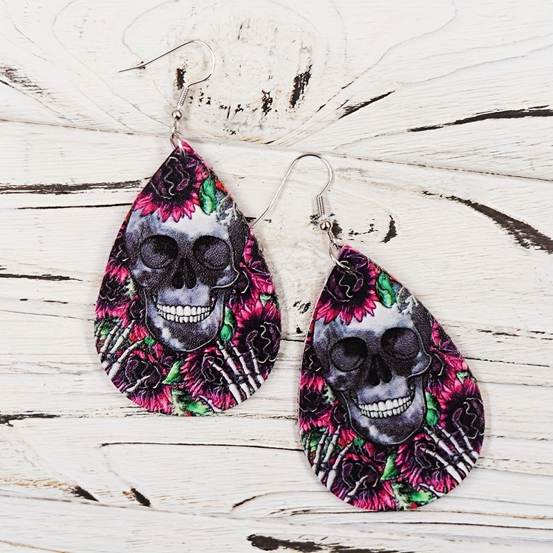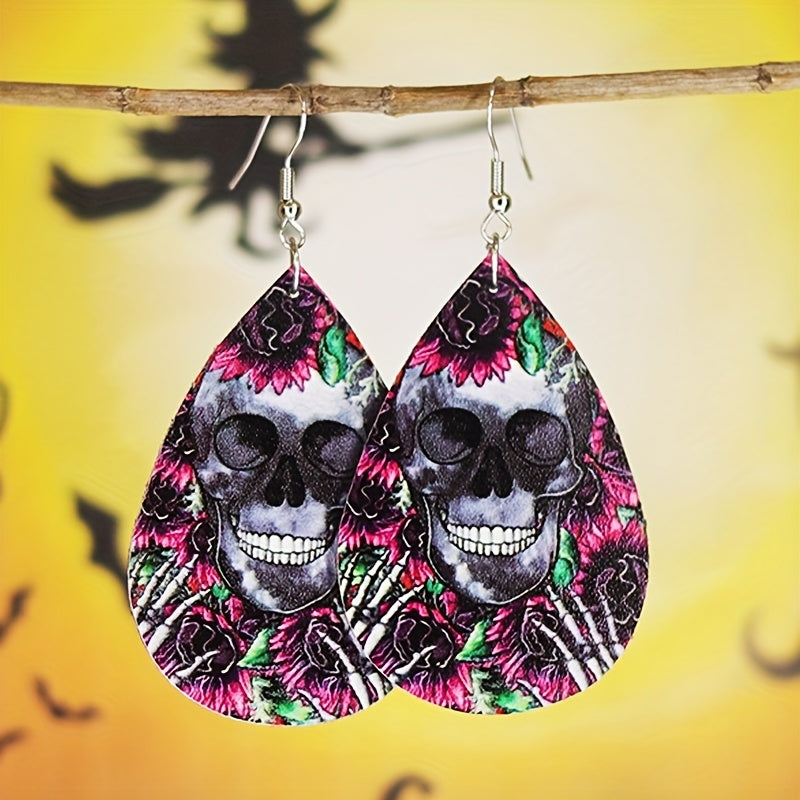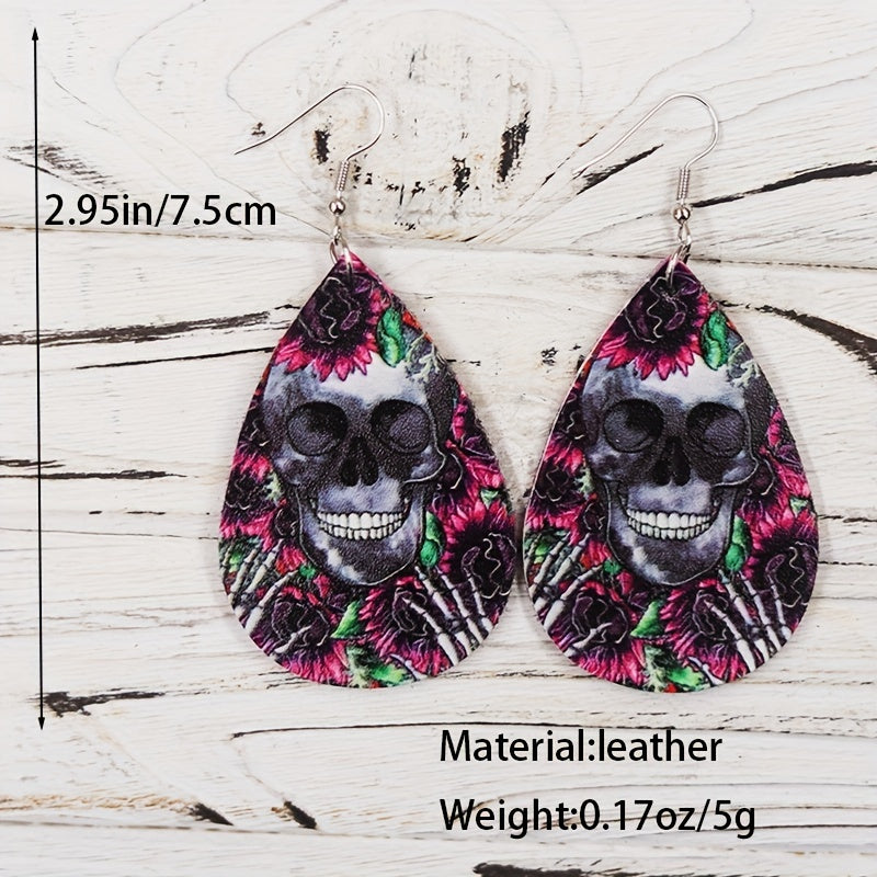 Elegant teardrop dangle earrings featuring a Halloween skull flower pattern. Made of PU leather, perfect gift for females.
