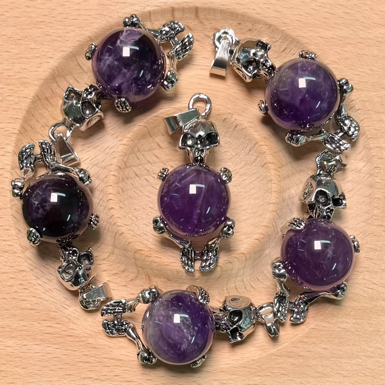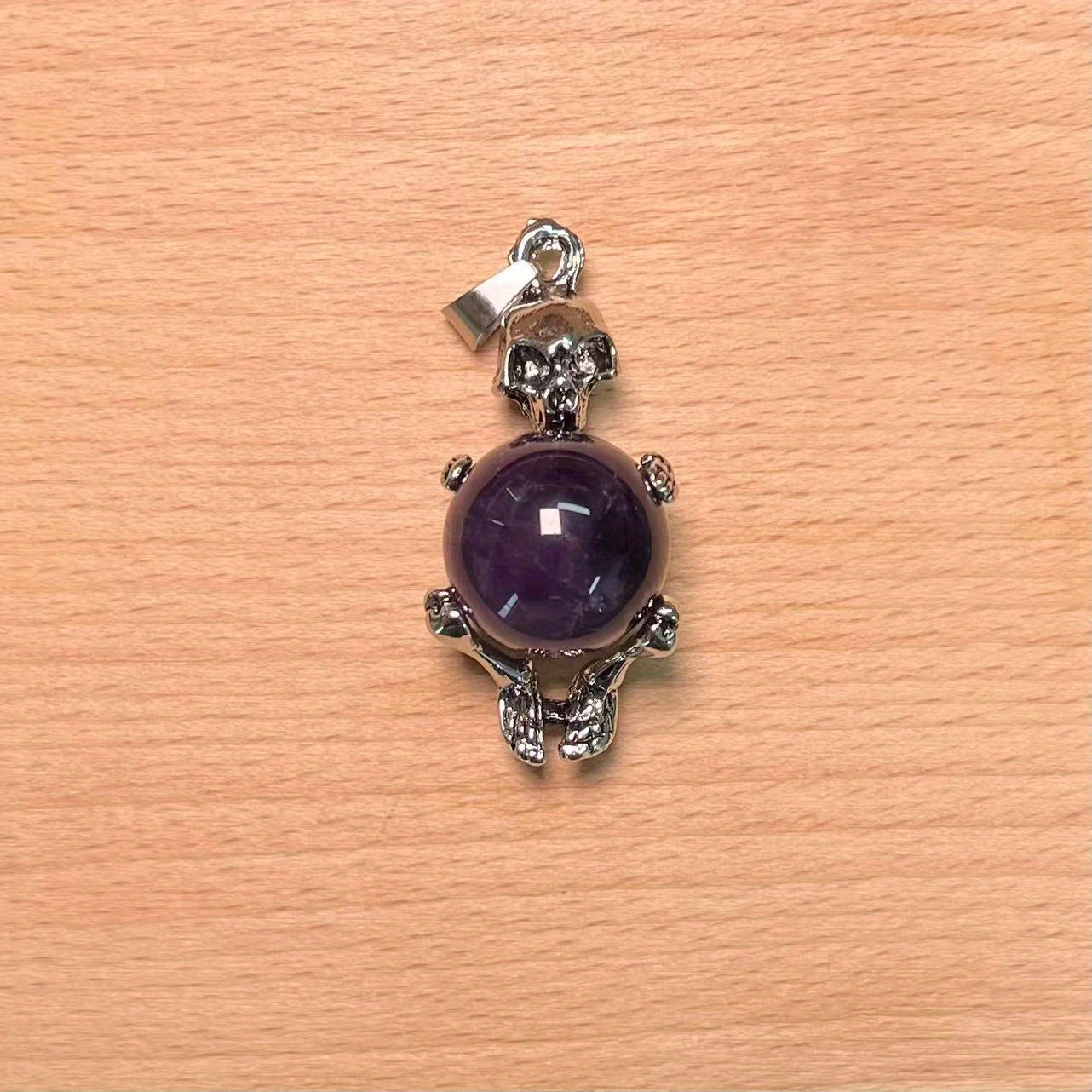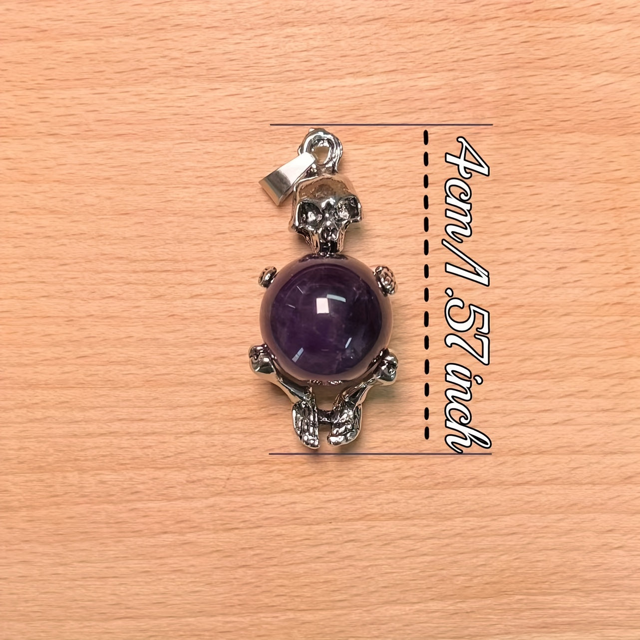 This skull shape pendant features a round purple healing crystal stone, perfect for DIY jewelry making or Halloween decorations.
