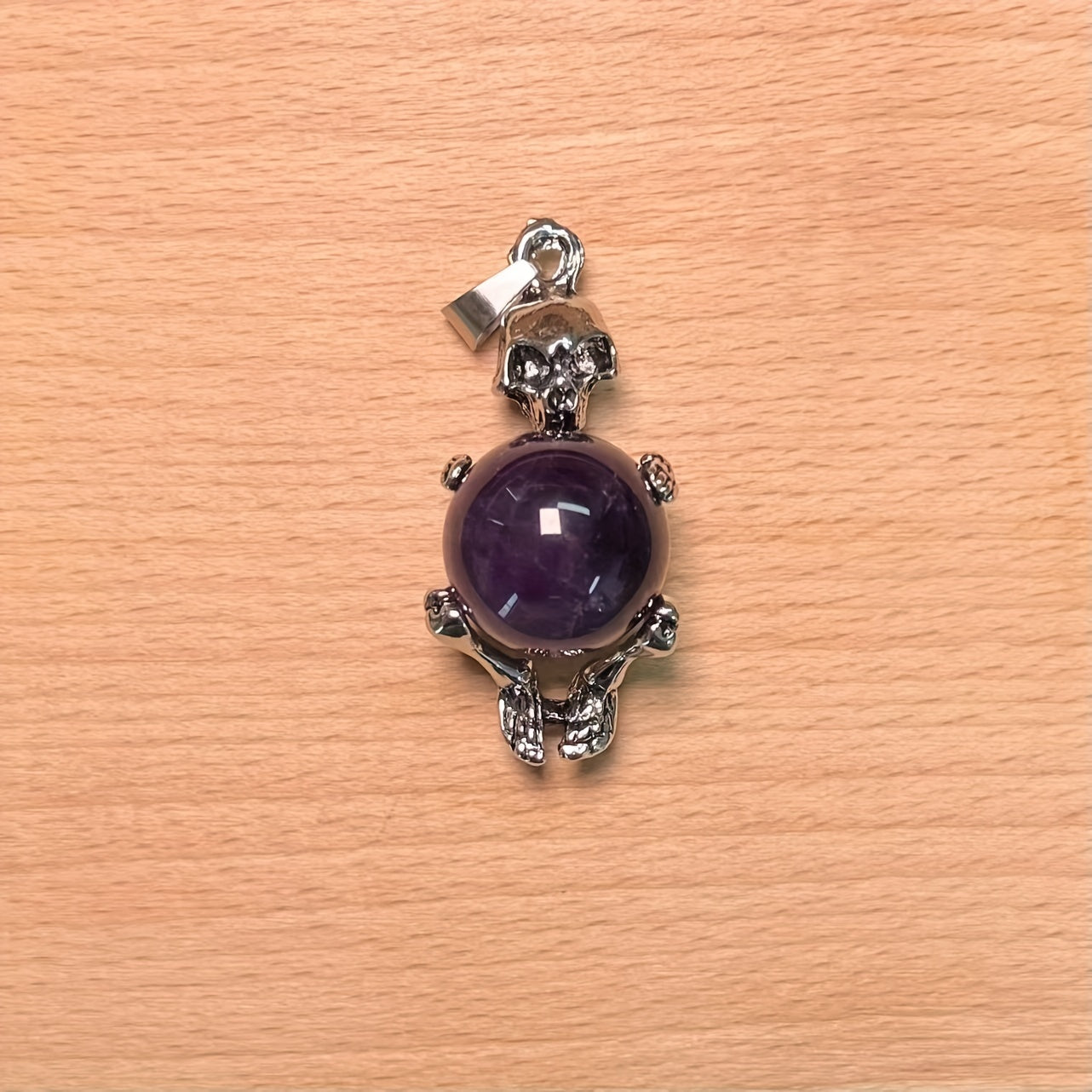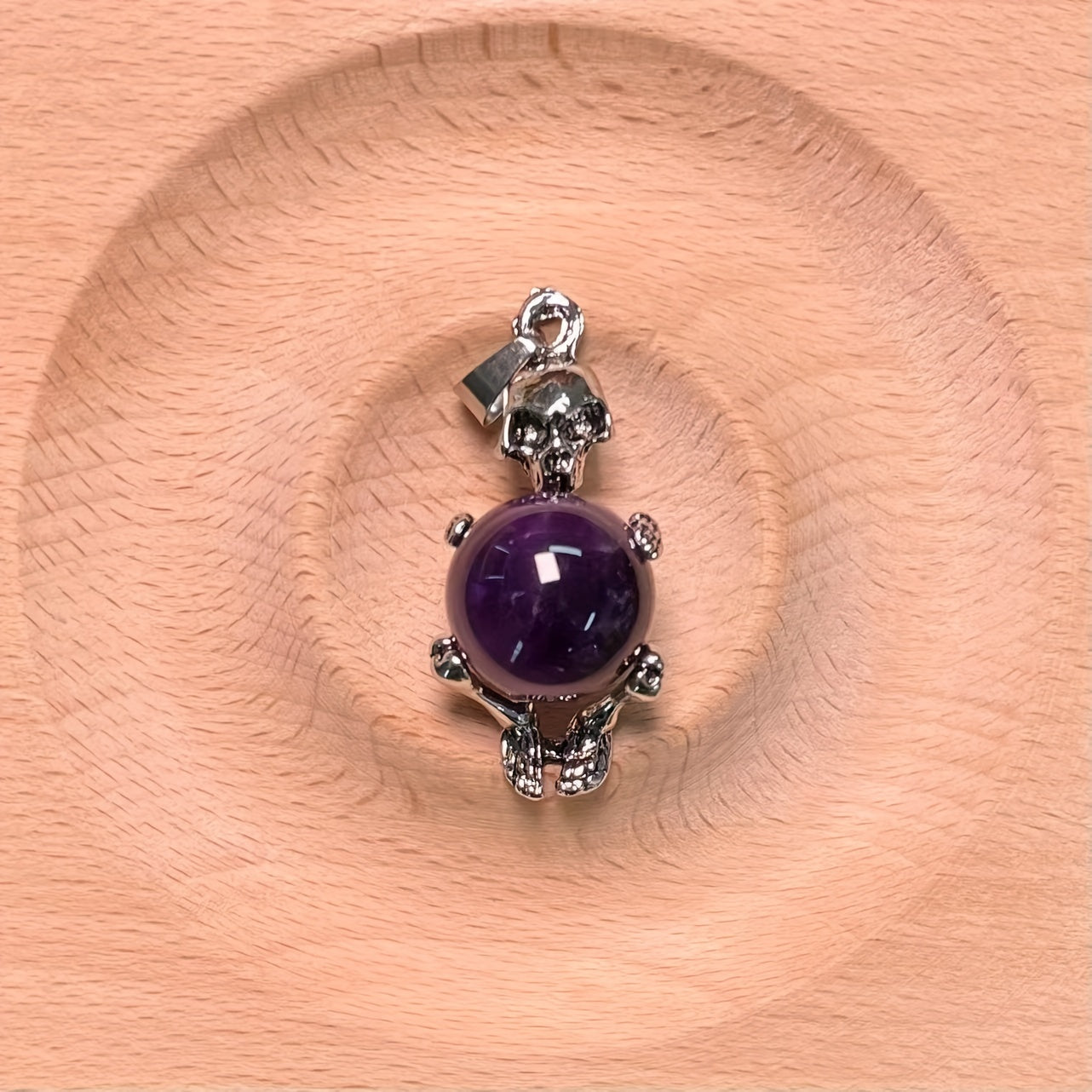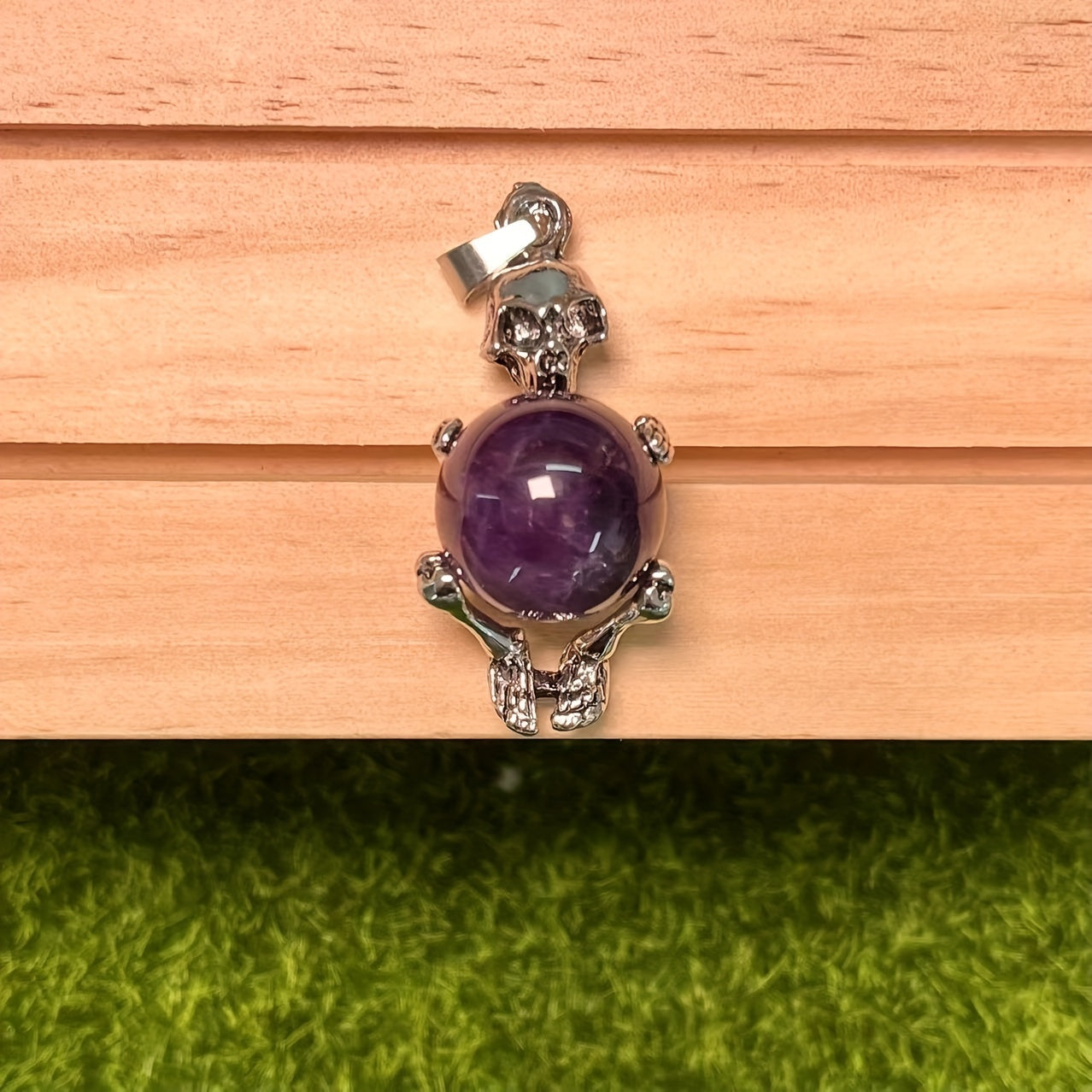 This skull shape pendant features a round purple healing crystal stone, perfect for DIY jewelry making or Halloween decorations.