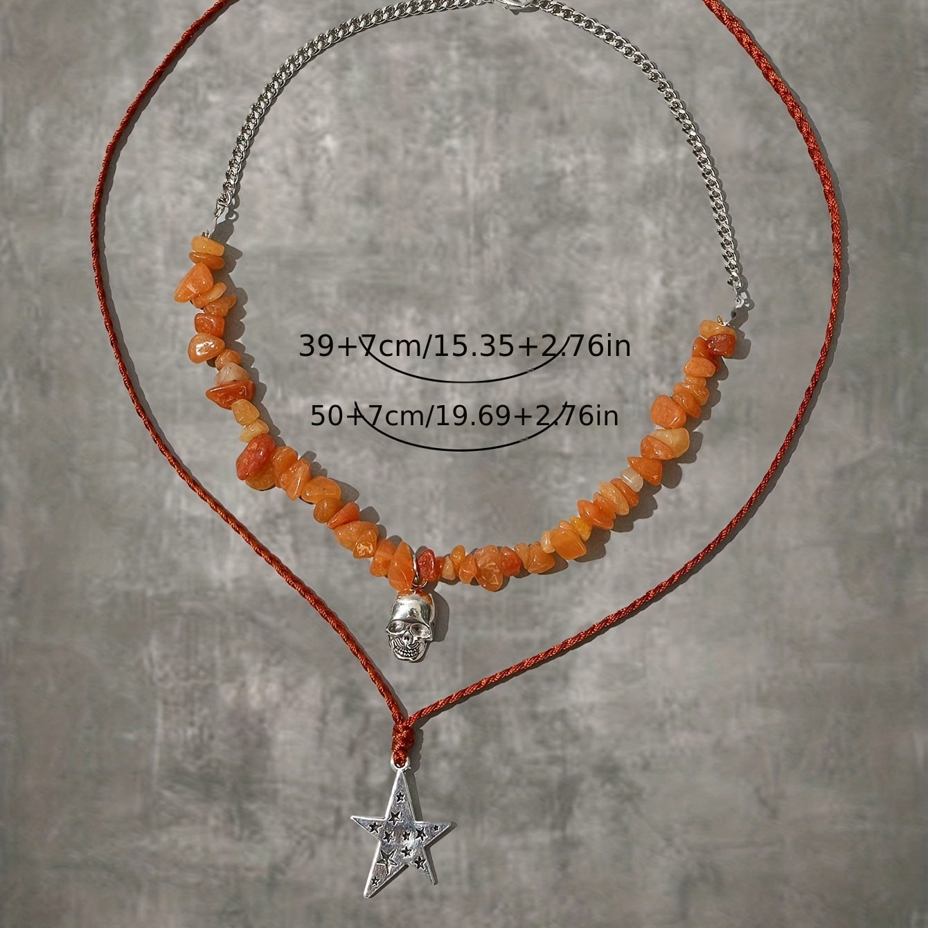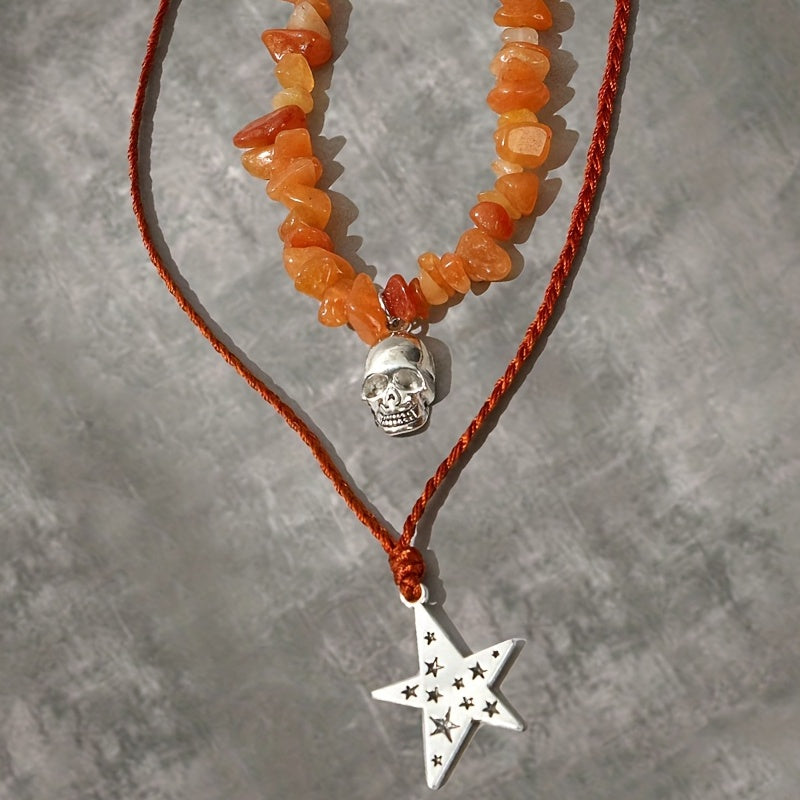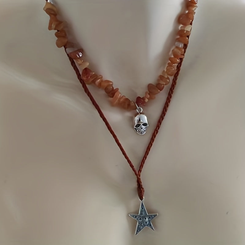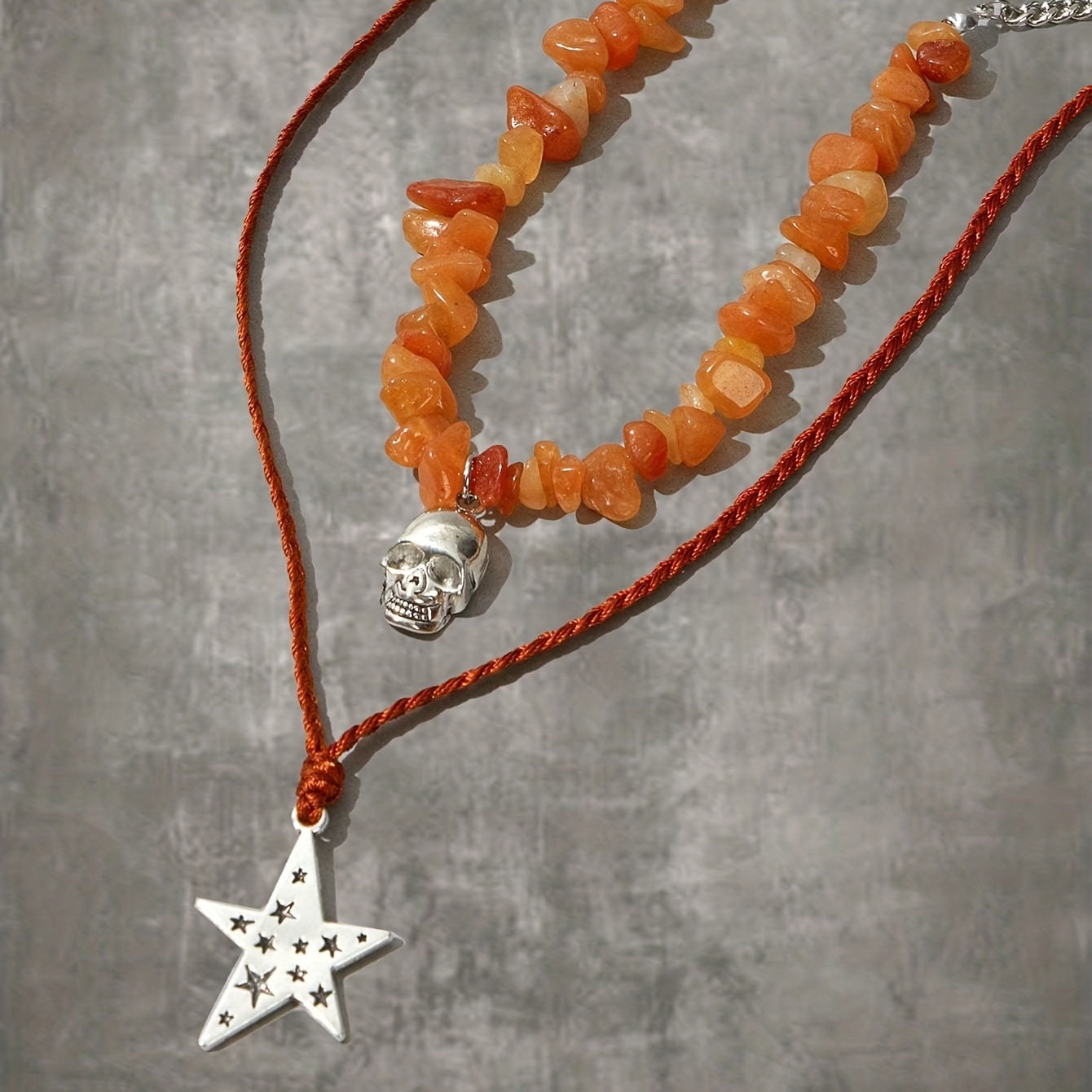 This set includes 2pcs natural stone necklaces with skull and star element pendants. Each necklace is braided with rope for a unique look.