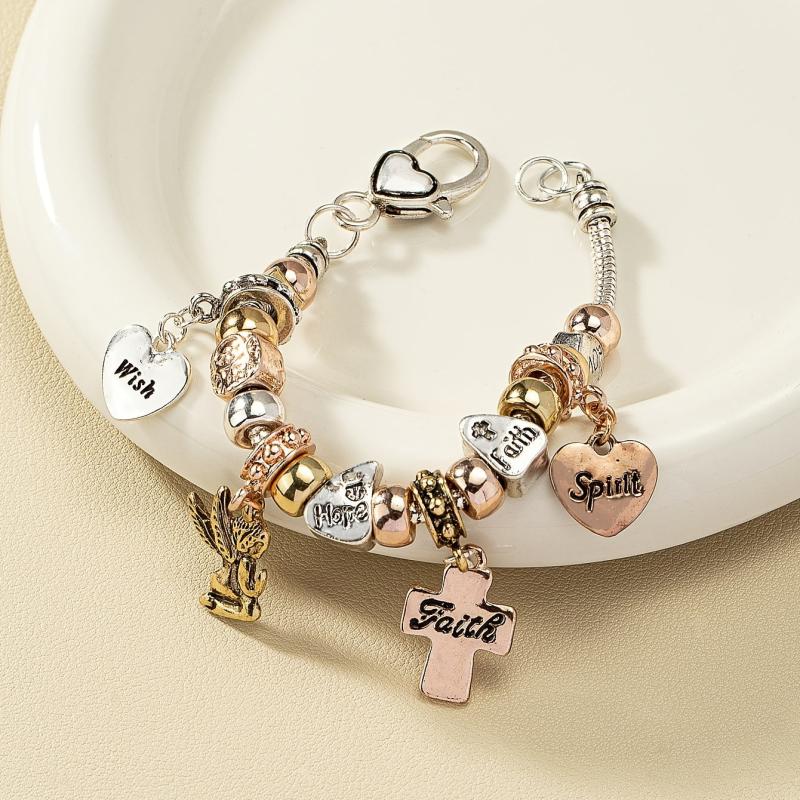 This sweet alloy bracelet features a snake chain with beads and various shape pendants such as crosses and love hearts. Perfect for women and girls.