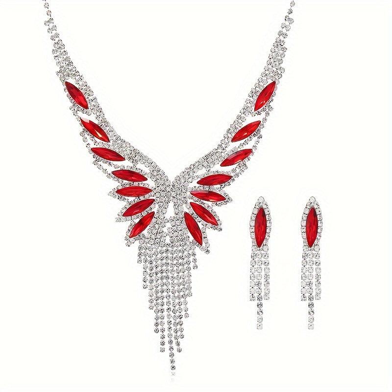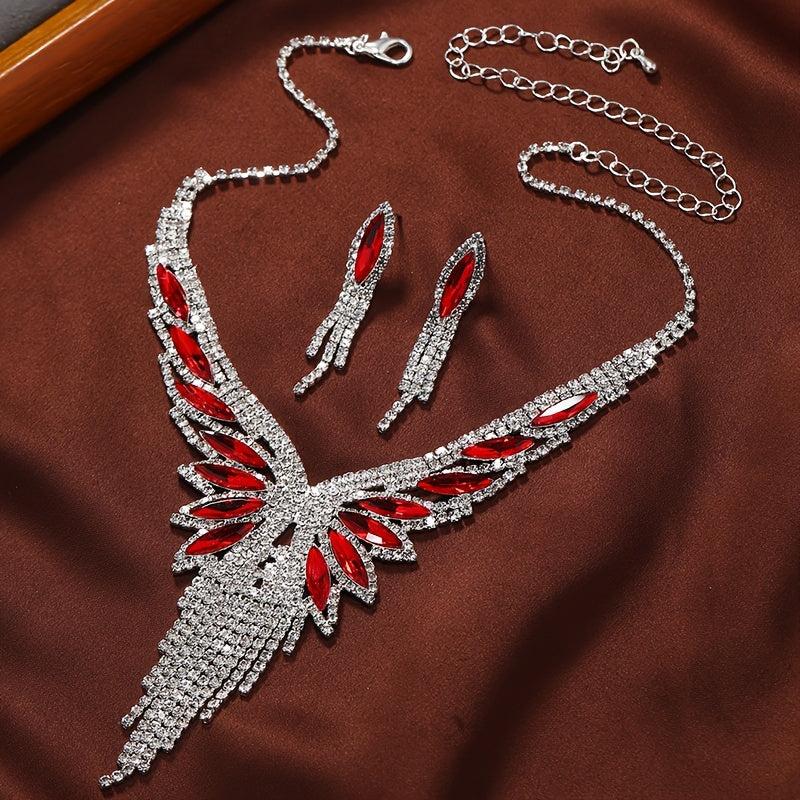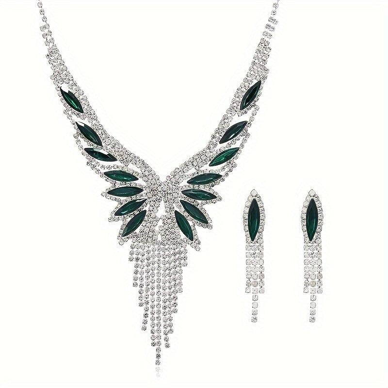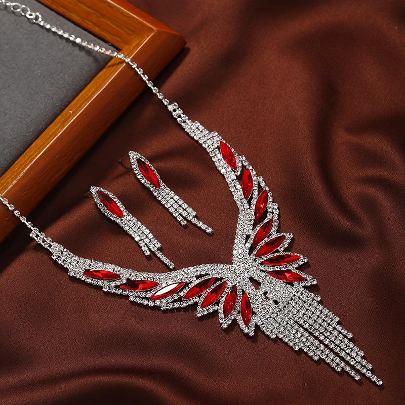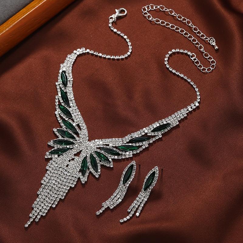 Elevate your evening look with this glamorous jewelry set featuring dangle earrings and necklace adorned with sparkling tassel and paved rhinestone.
