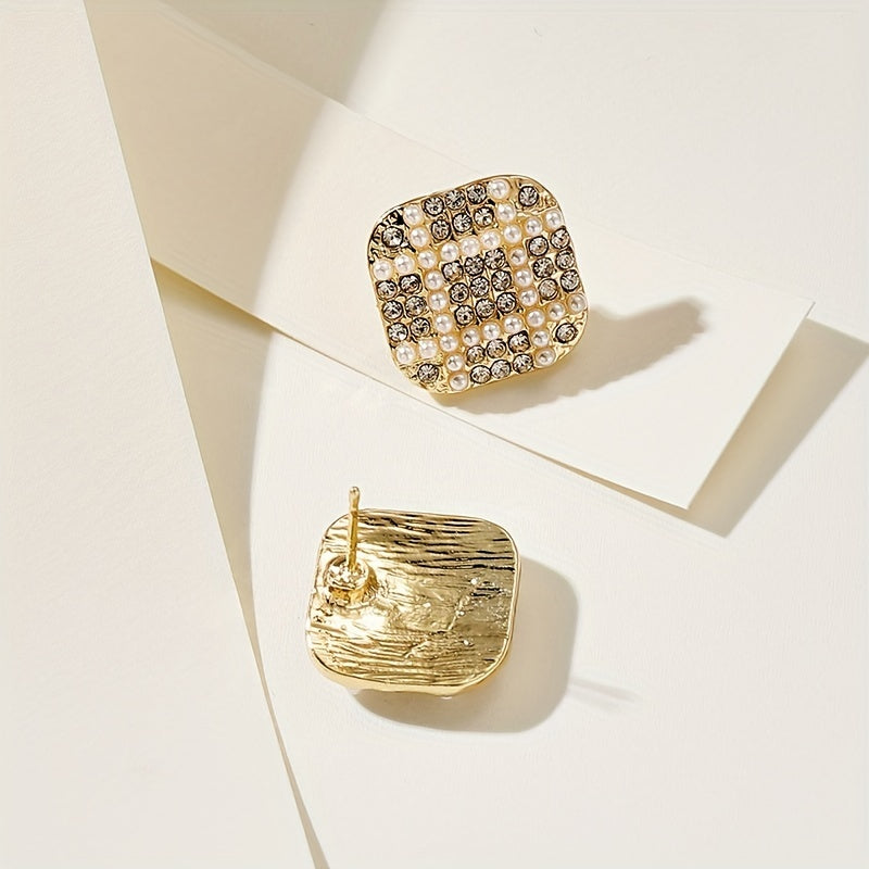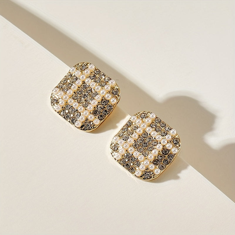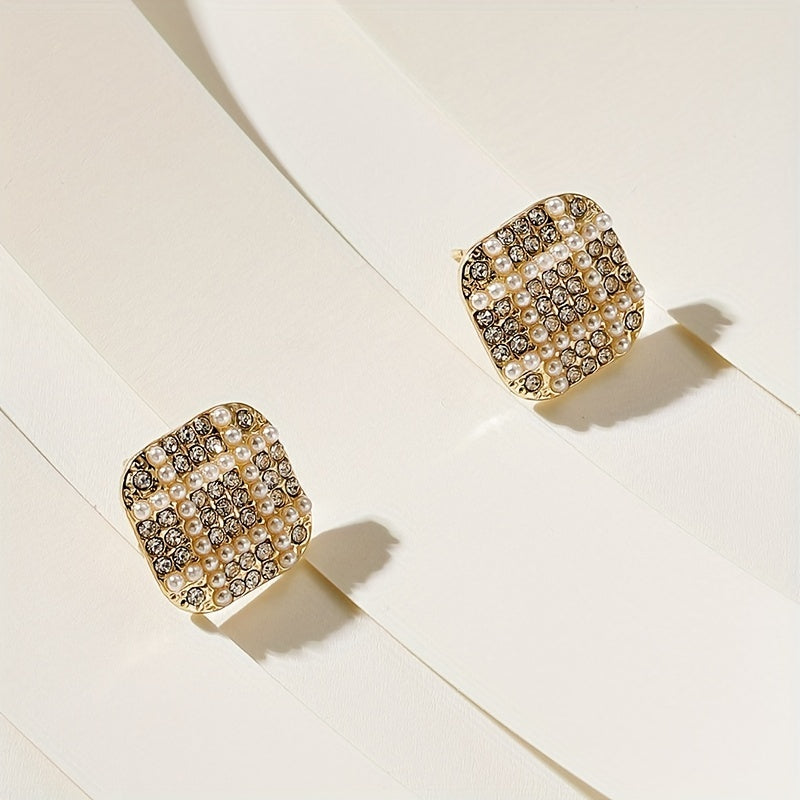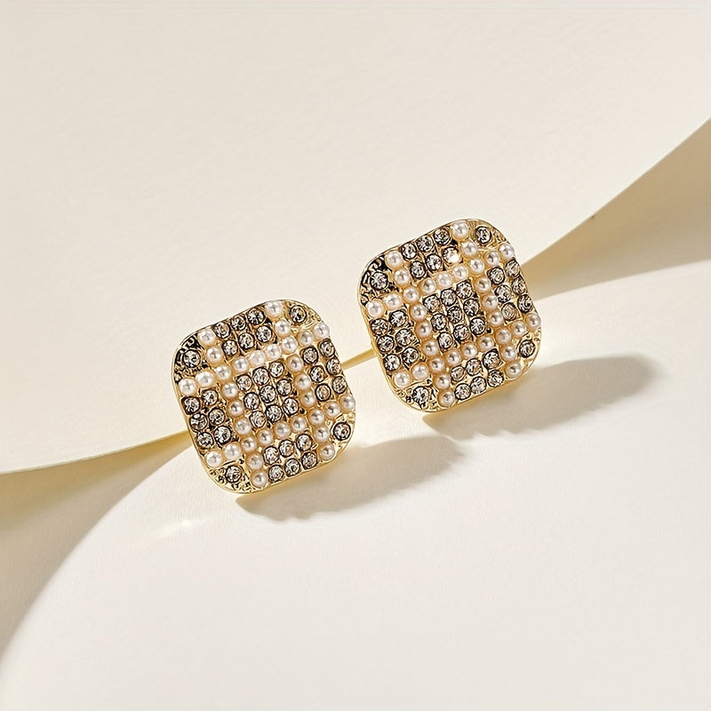 Add a touch of elegance with these stylish stud earrings made of zinc alloy with 18K gold plating. Featuring a square shape design adorned with faux pearls and zircon stones, these earrings are perfect for daily wear and casual occasions.