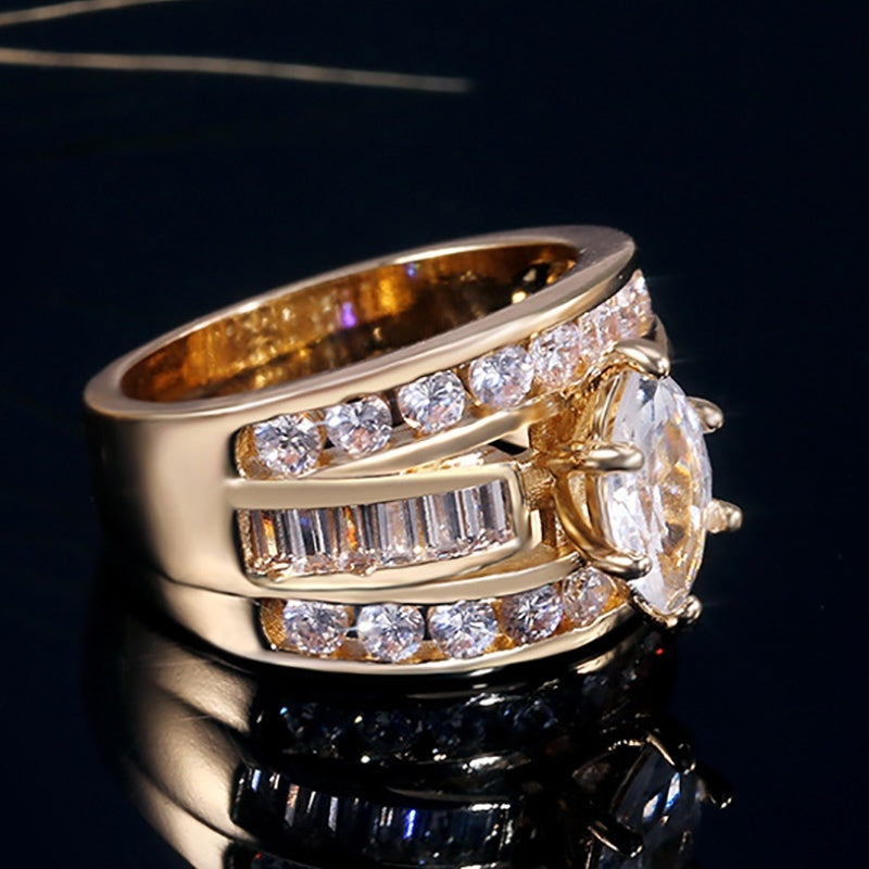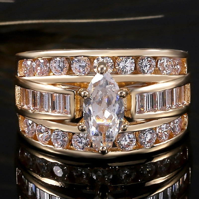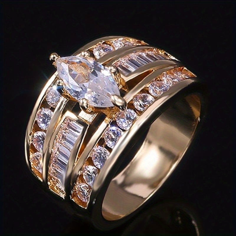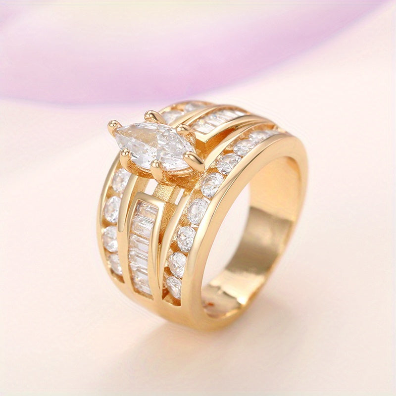 This stunning promise ring features inlaid zircon stones, perfect for a wedding or engagement. Plated with 18K gold, this ring makes a beautiful and meaningful gift.