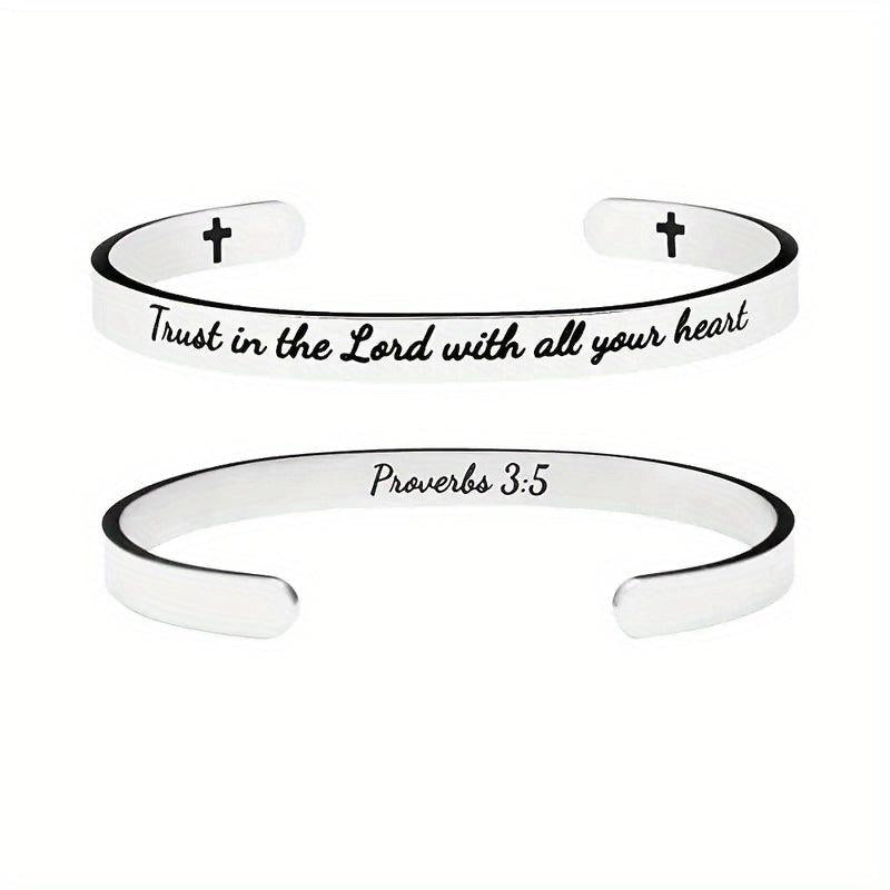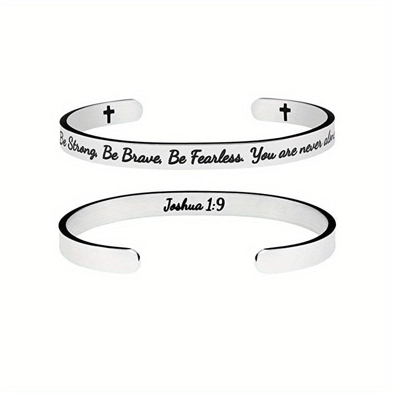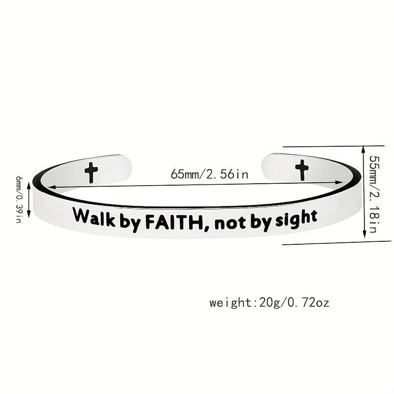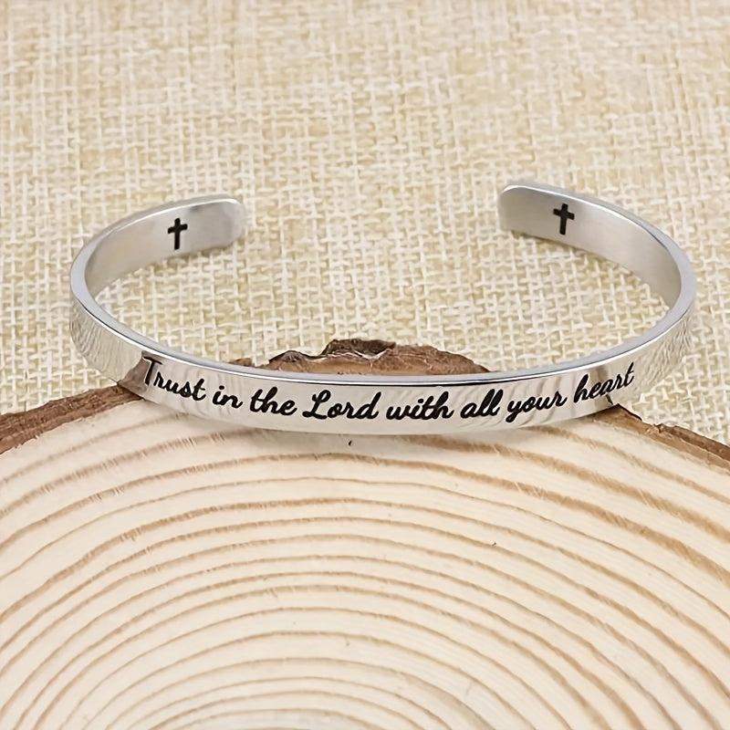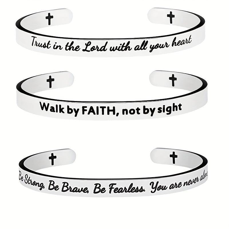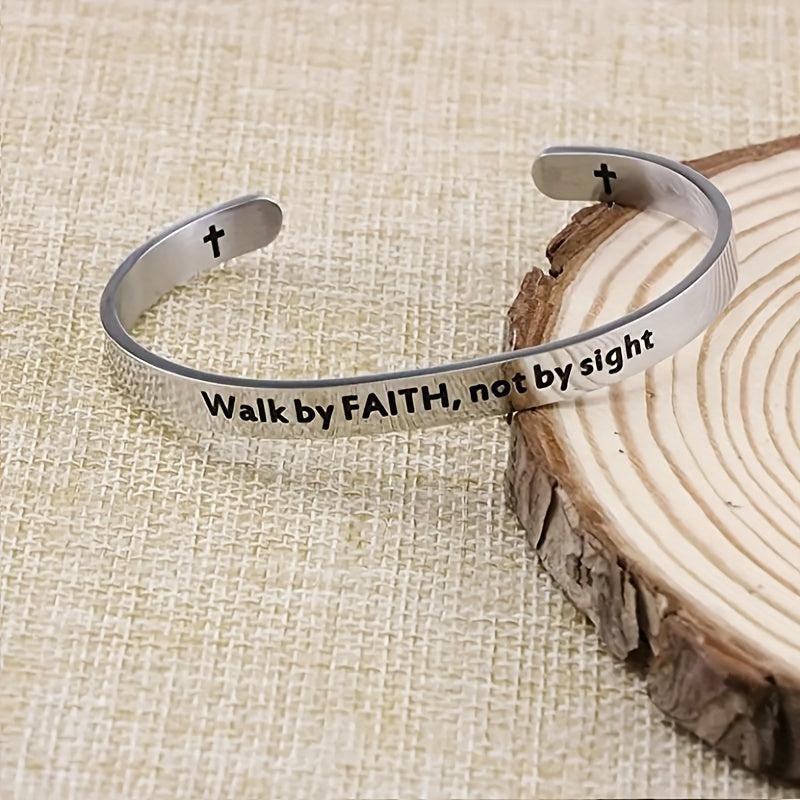This funky cuff bangle features inspiring laser engraved letters and a cross pattern, making it a perfect faith-based gift for women. Ideal for graduation season gifting.