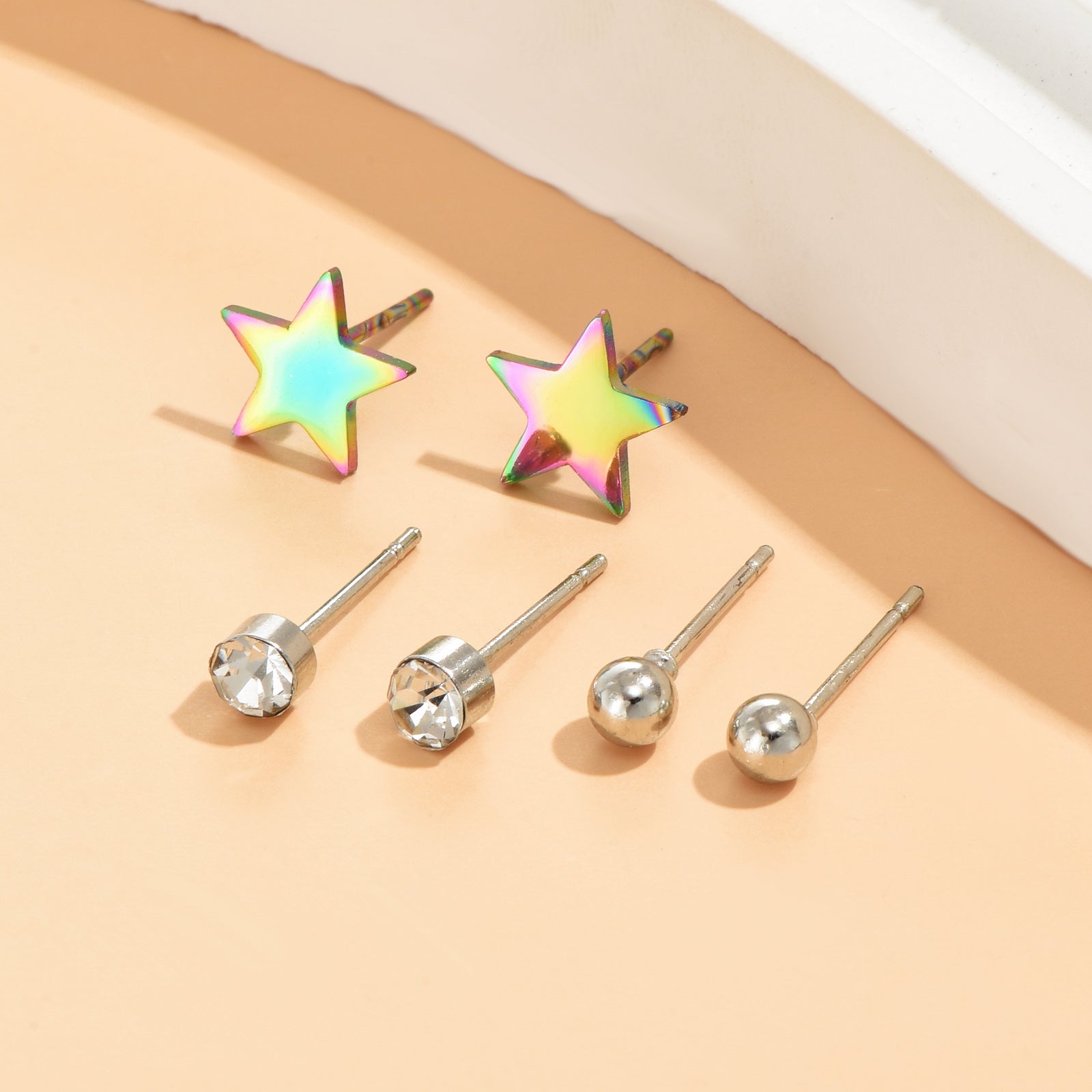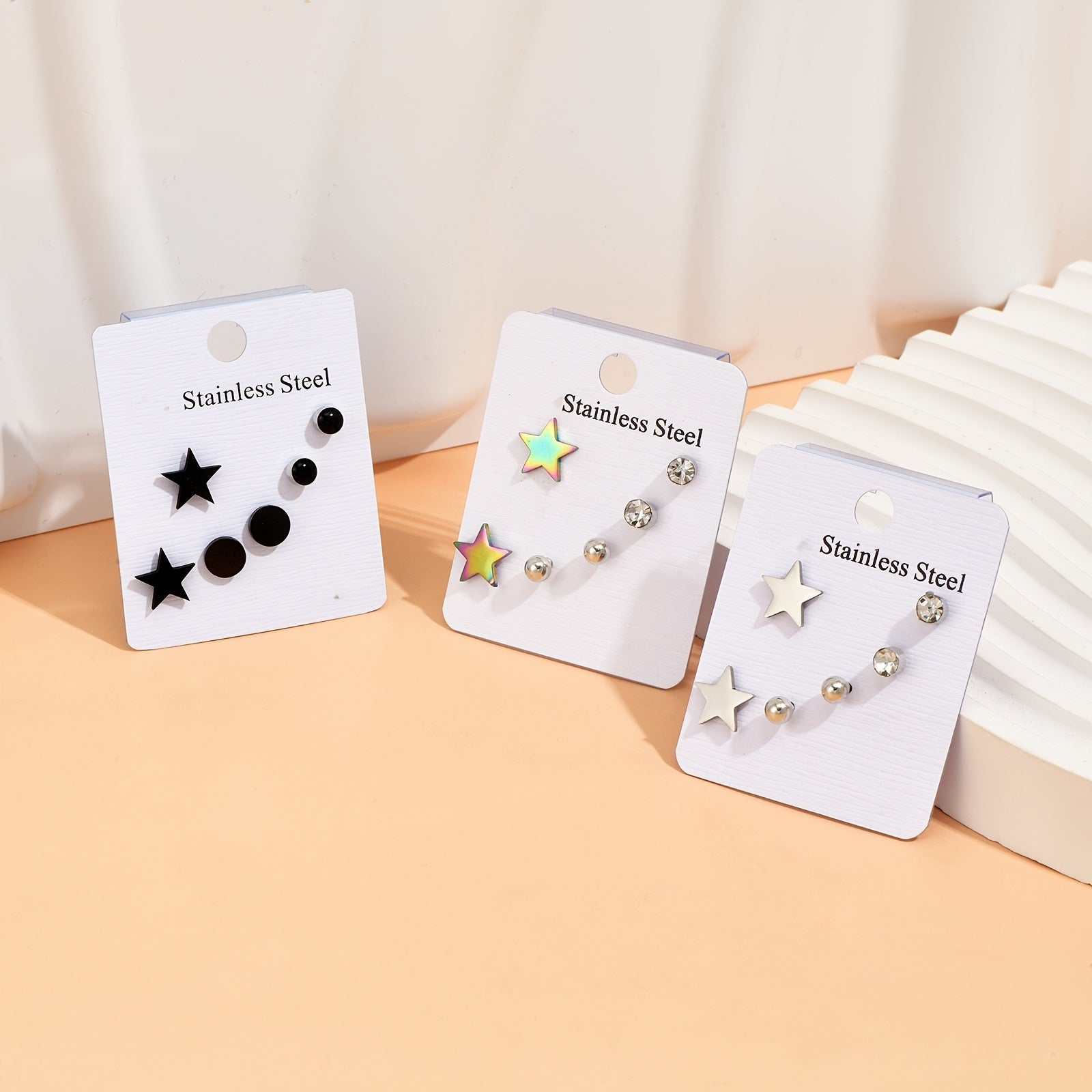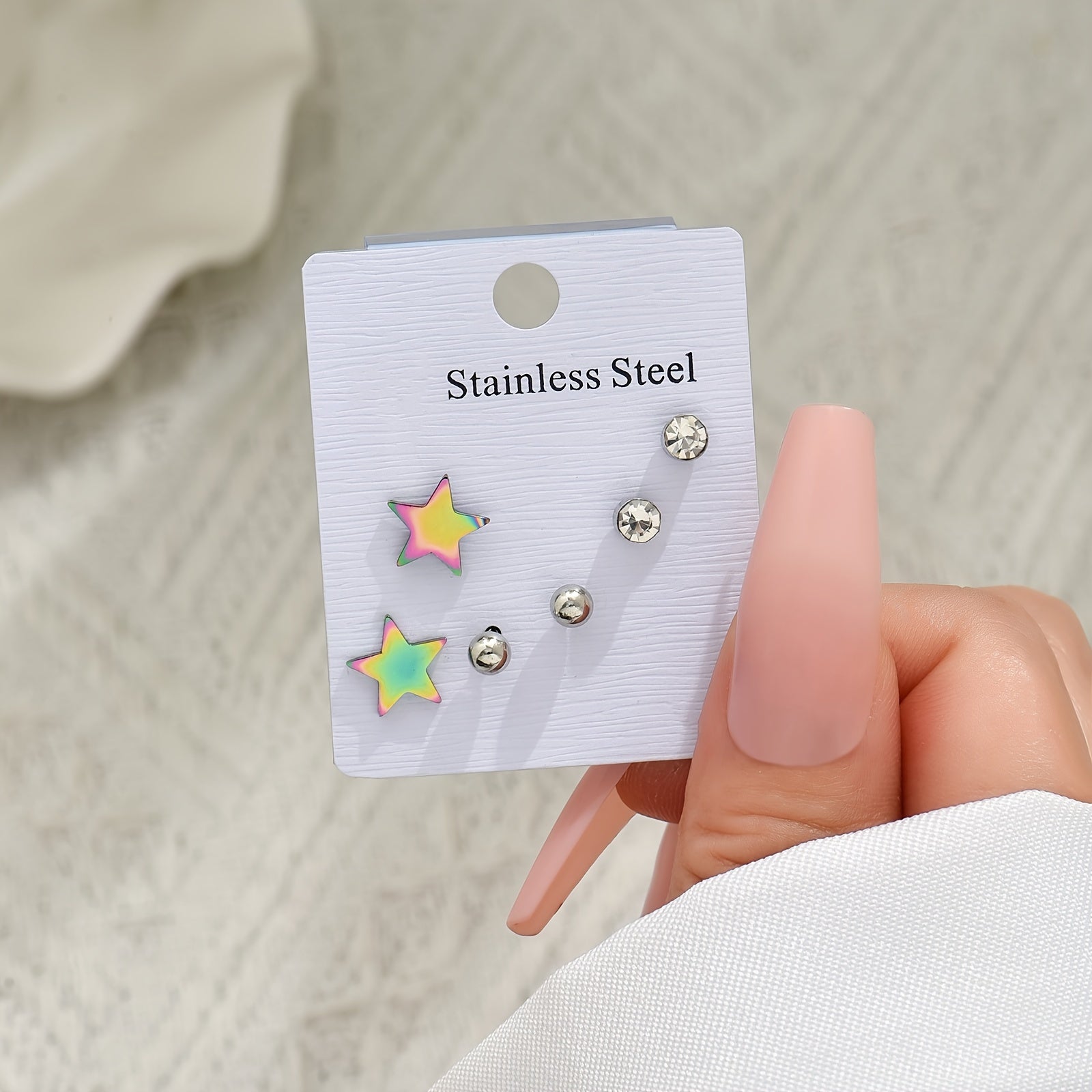 Add a touch of sparkle to your outfit with these stainless steel stud earrings featuring a colored point star design. Set includes 6 pairs to mix and match.