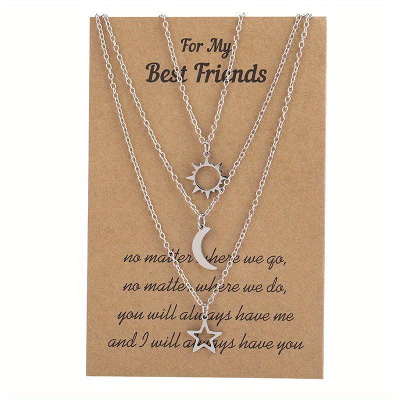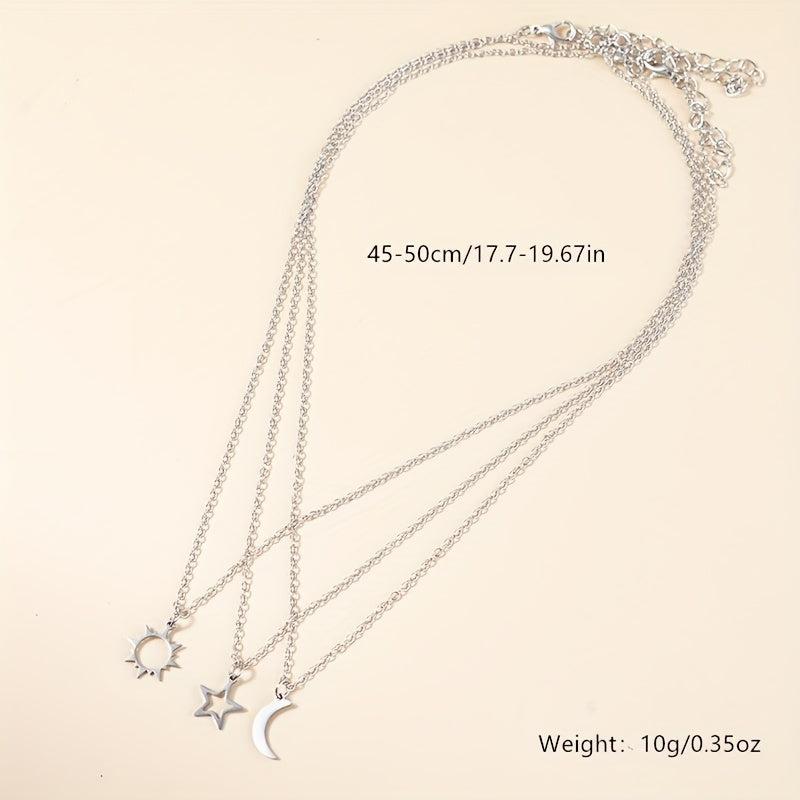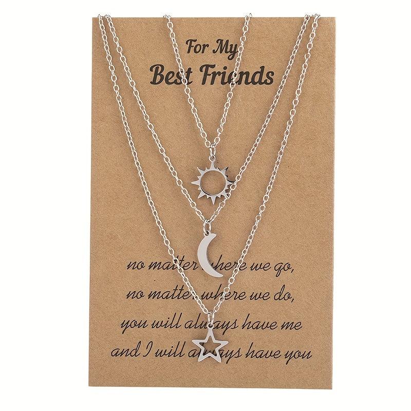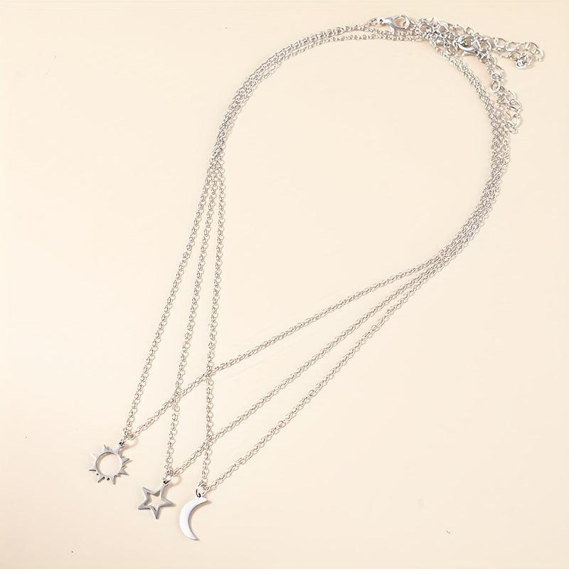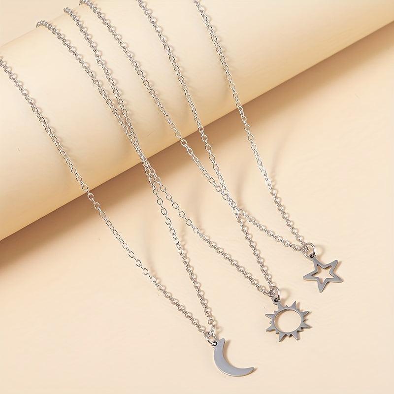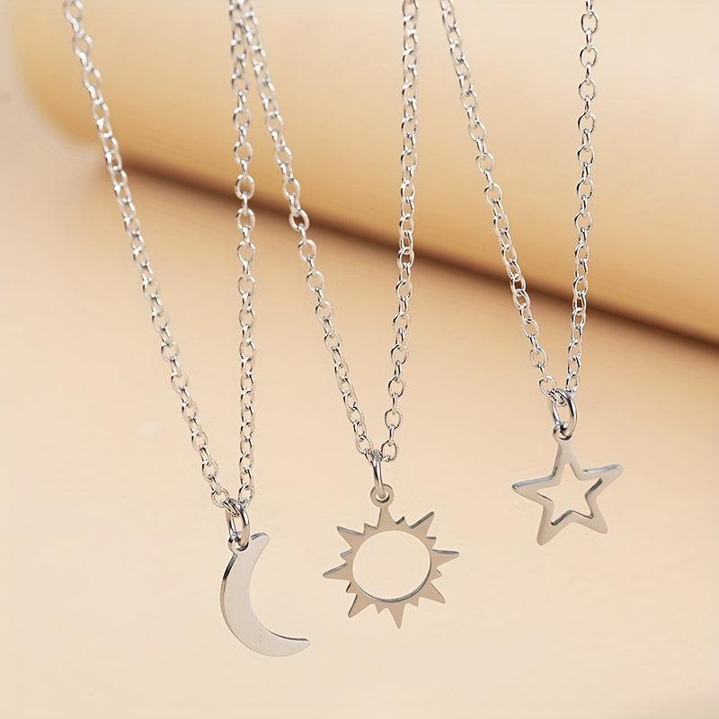 These stainless steel necklaces featuring a sun, moon, and star design are a symbol of friendship and good vibes. Each set includes 3 necklaces for you and your friends.