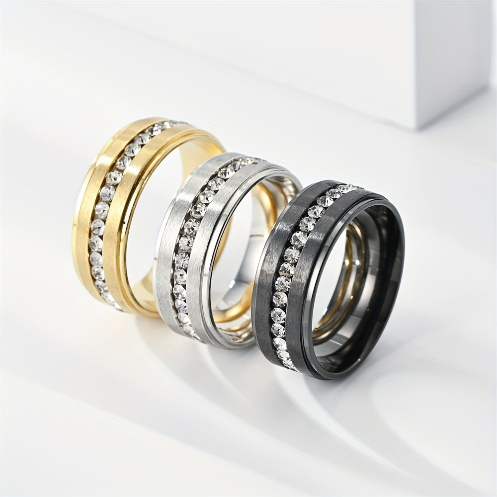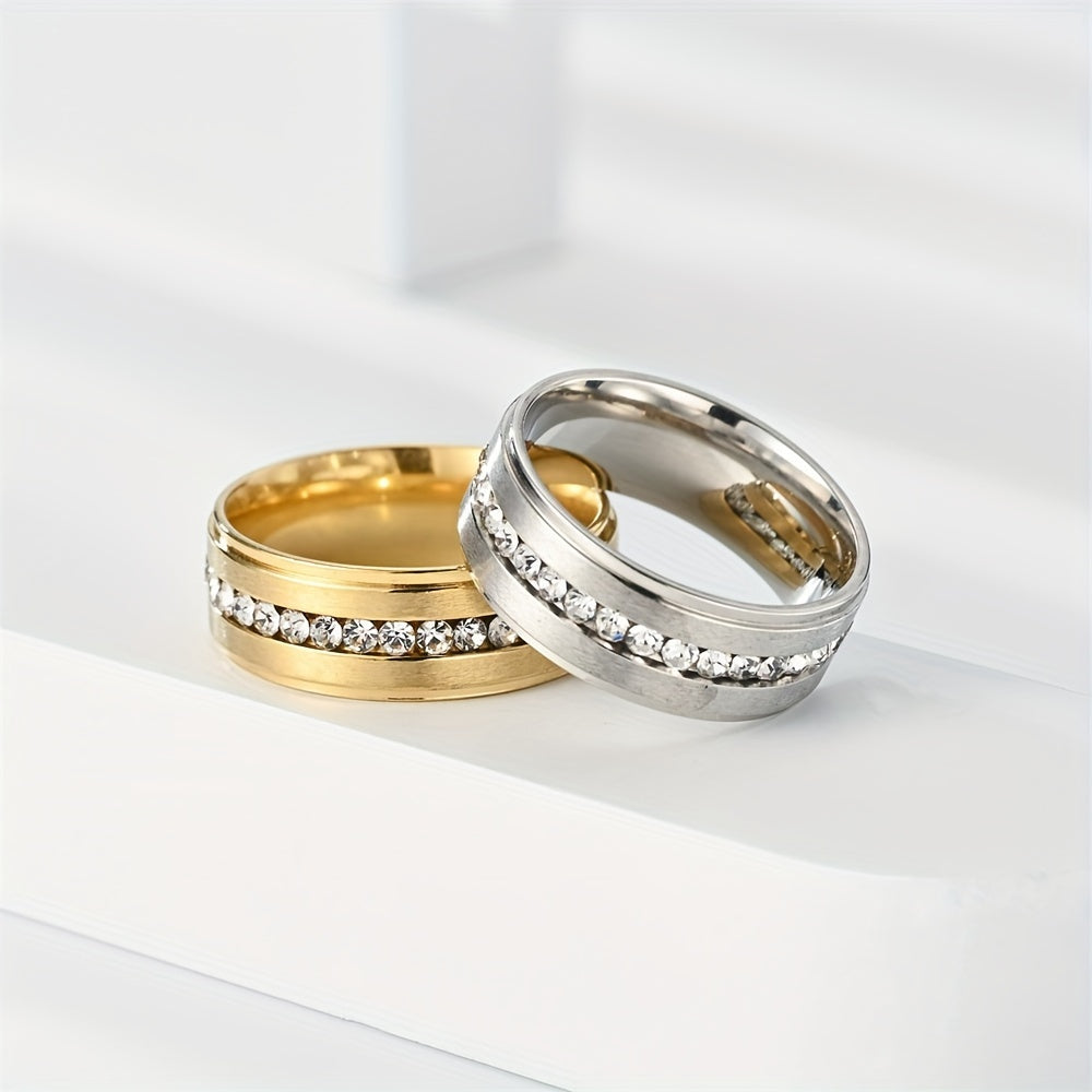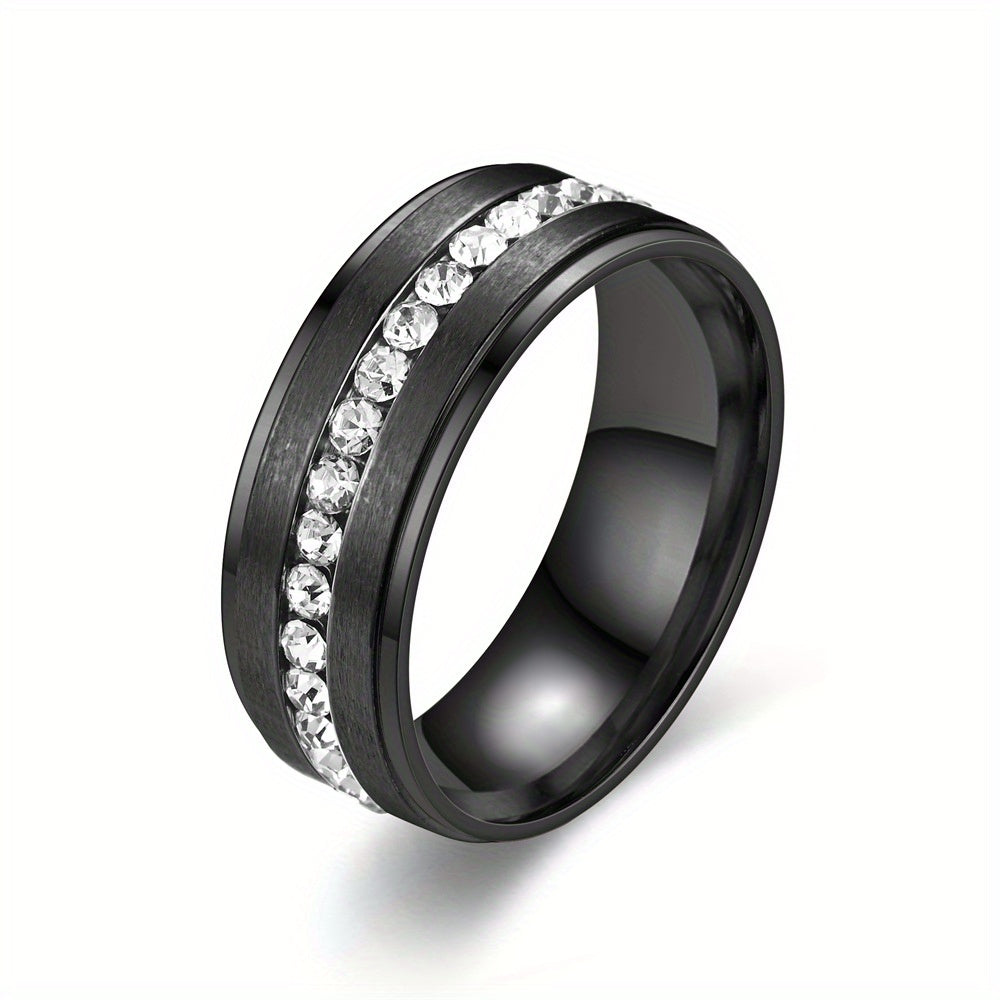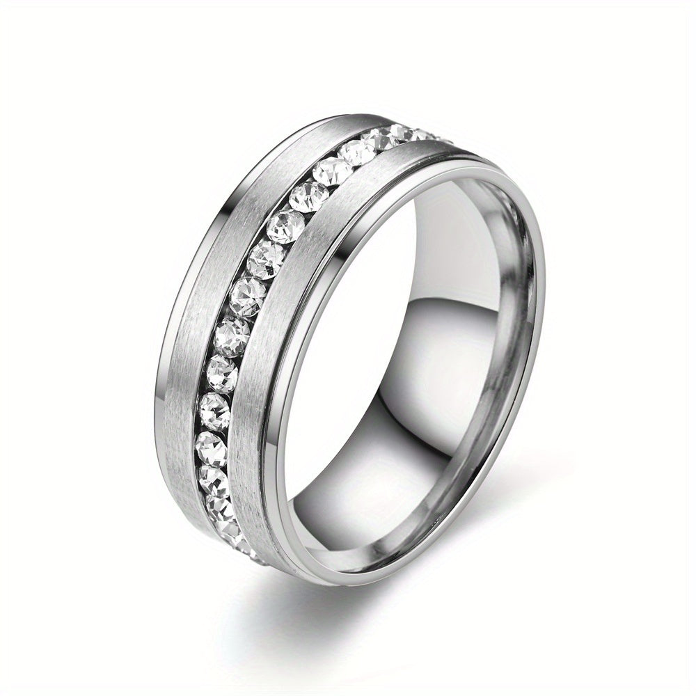 This stylish stainless steel ring features a row of sparkling rhinestones that make it perfect for both men and women. Available in various colors, this dainty accessory is ideal for parties and special occasions.