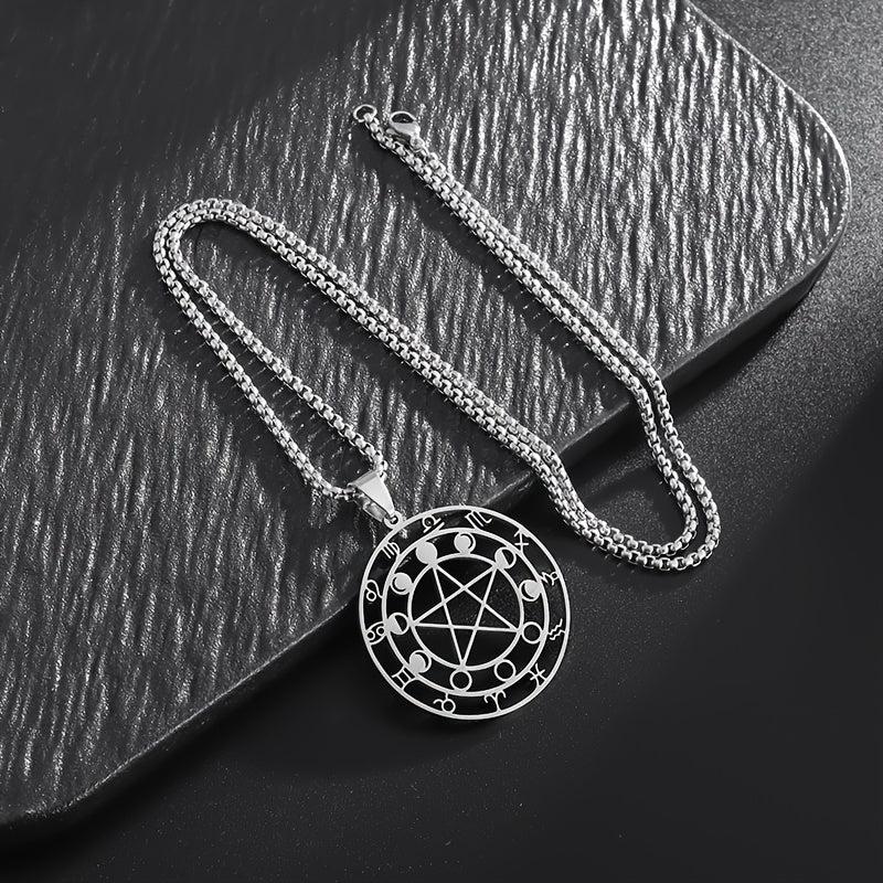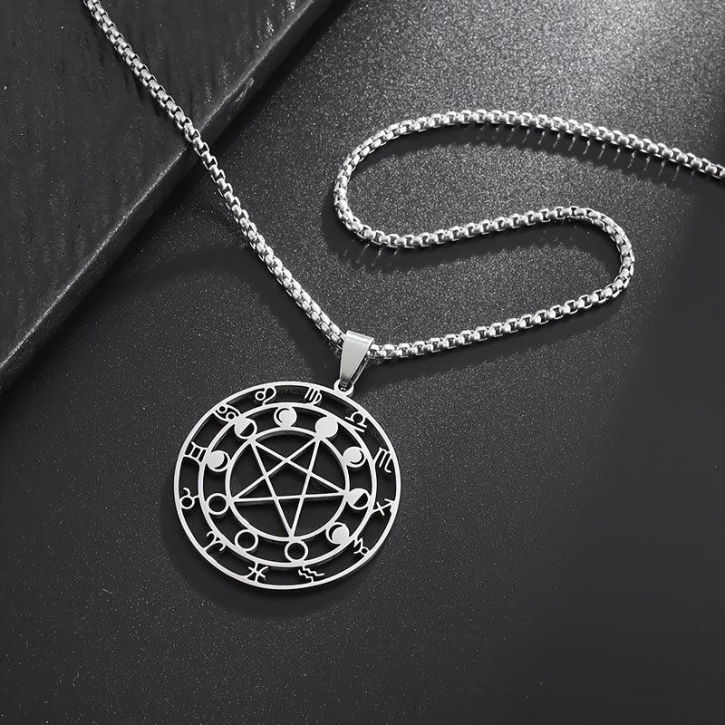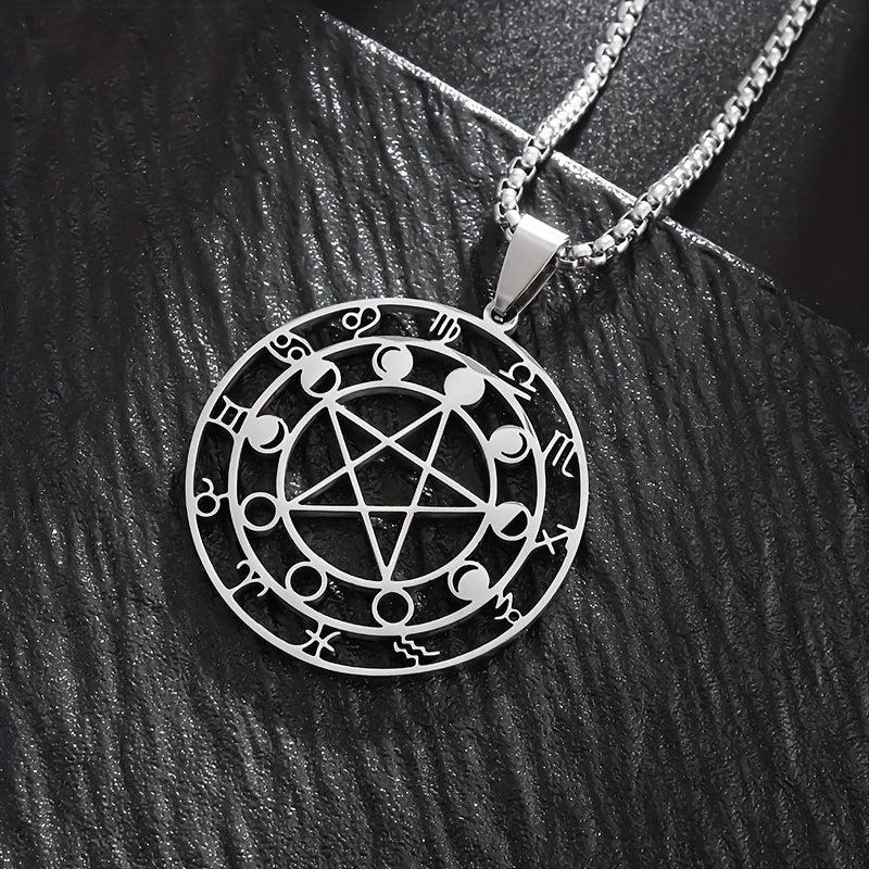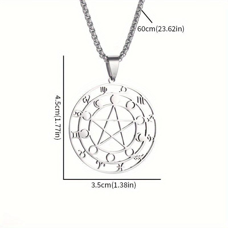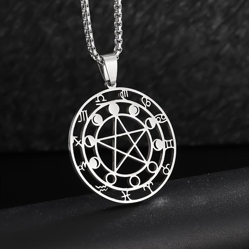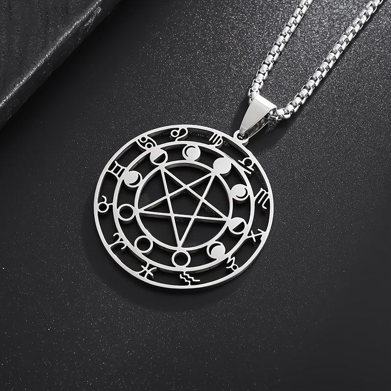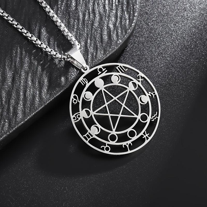 This stainless steel pendant necklace features 12 astrological symbols and a pentagram charm, making it perfect for women who love gothic jewelry. It's a minimalist design that can be worn daily.