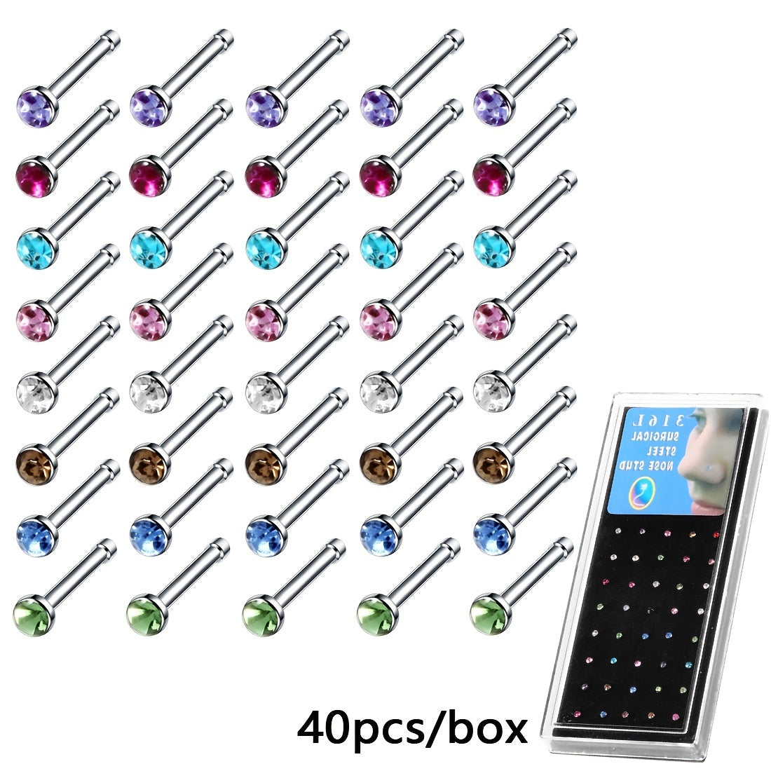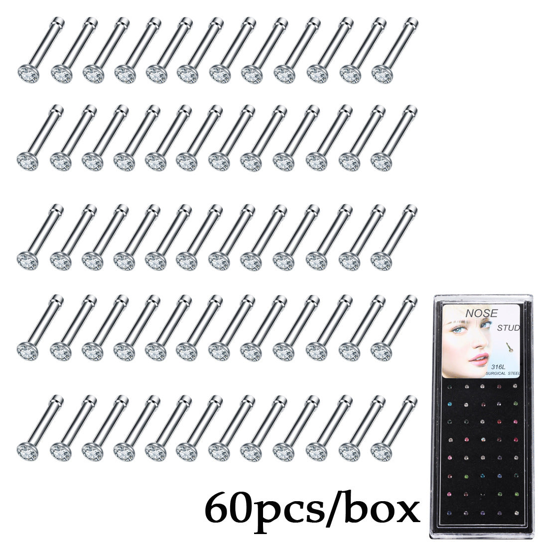 Get a set of stainless steel nose studs featuring a straight rod design with zicron studs. Available in sets of 24, 40, or 60 pieces to mix and match for a variety of styles.