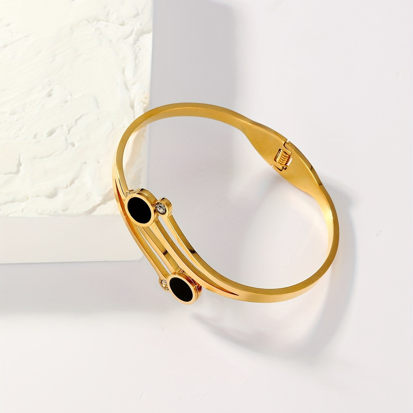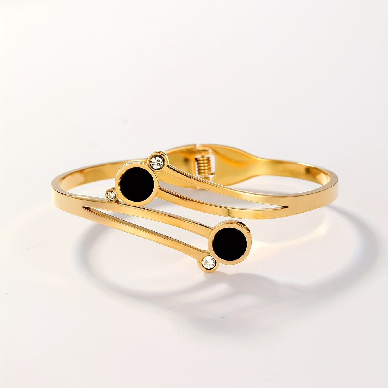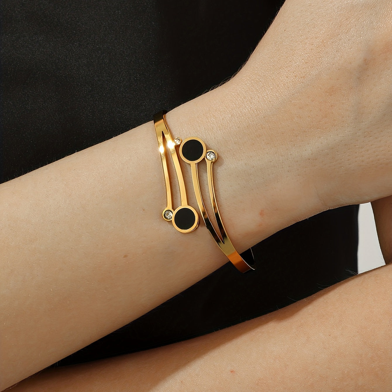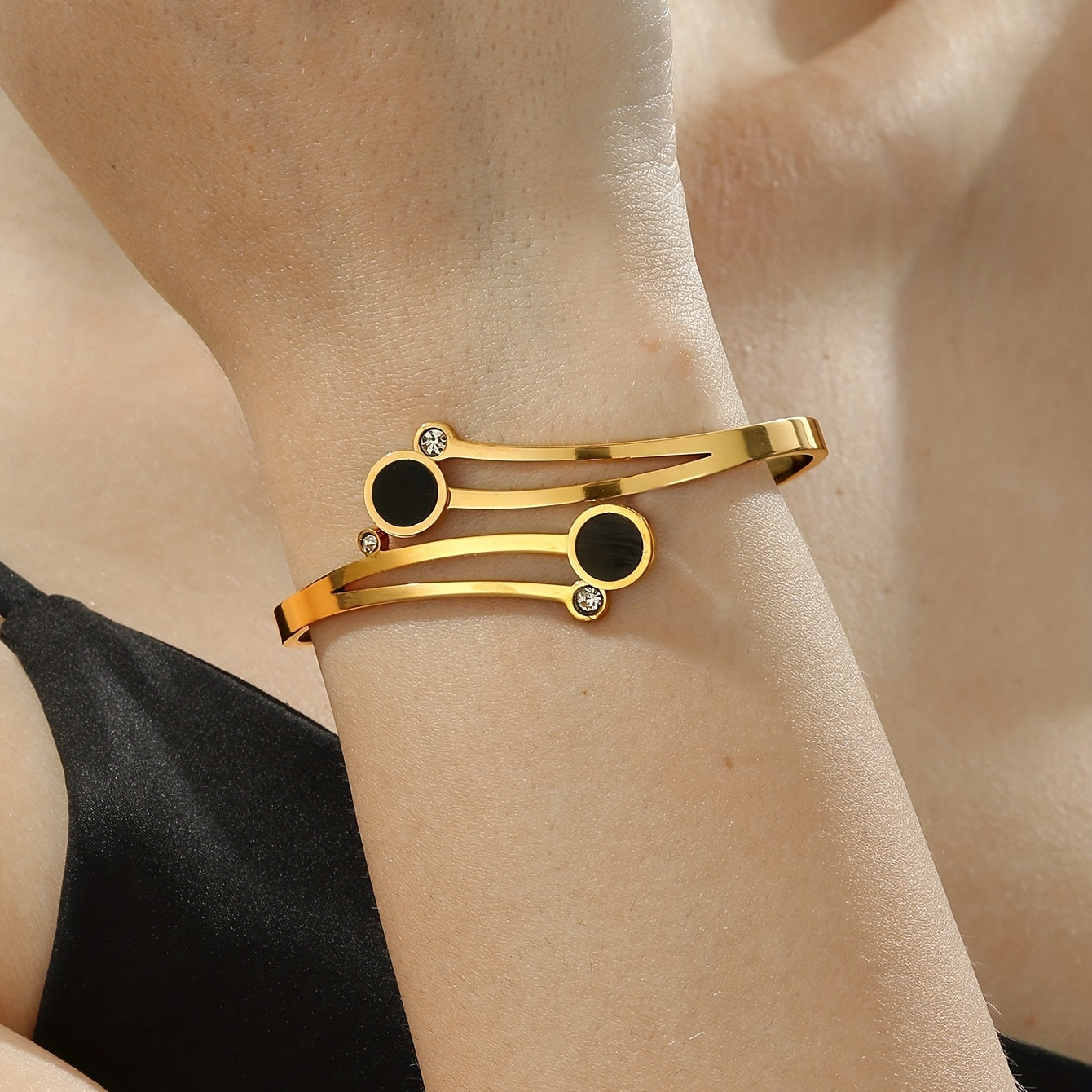 Elegant stainless steel cuff bangle with zircon inlay, 18K plated for a luxurious look. Perfect hand ornament.
