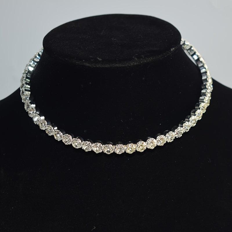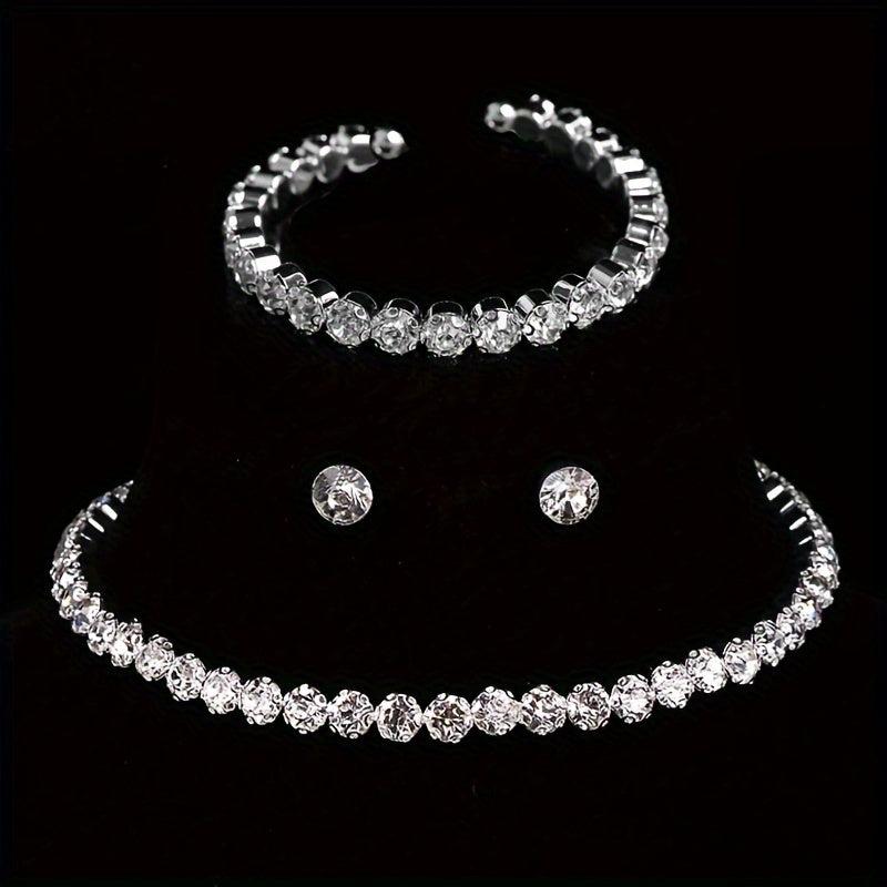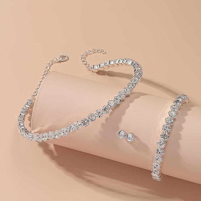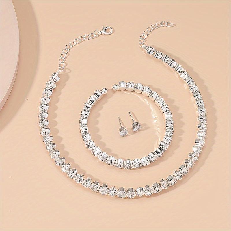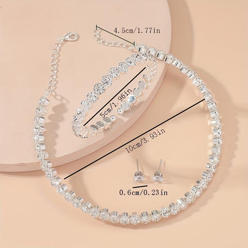Elevate your bridal look with this stunning jewelry set featuring flashing synthetic zirconia. The set includes a necklace, earrings, and bracelet to add sparkle and elegance to your wedding ensemble.