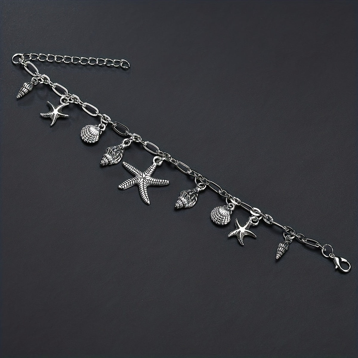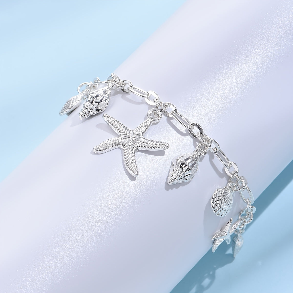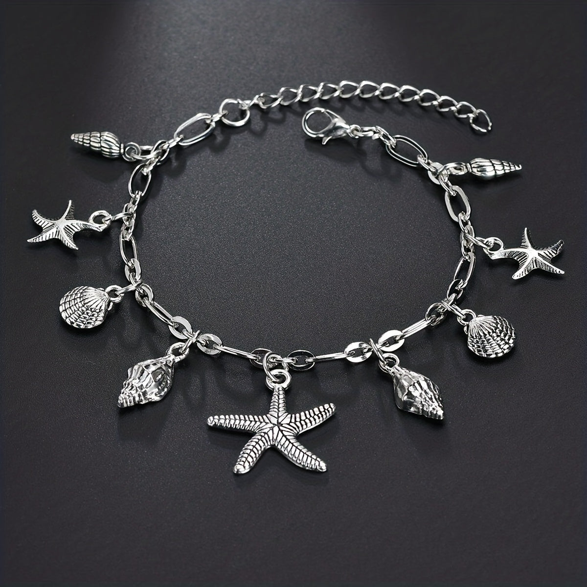 Add a touch of summer beach style to your outfit with this anklet featuring starfish, shell, and conch shape pendants. Perfect for women who love unique foot jewelry.