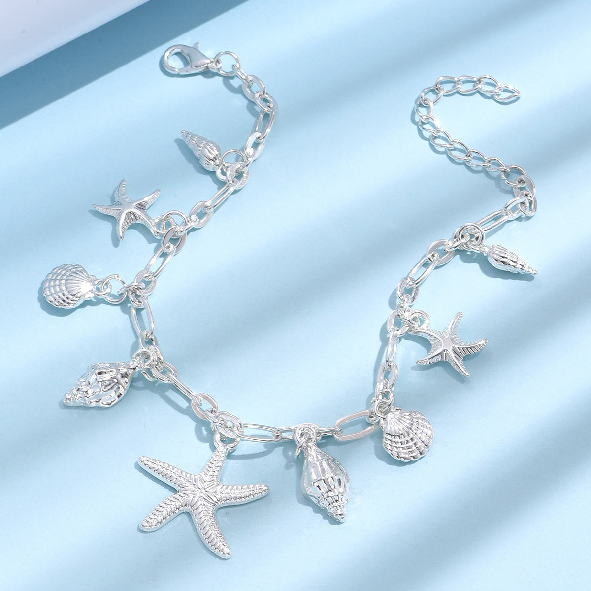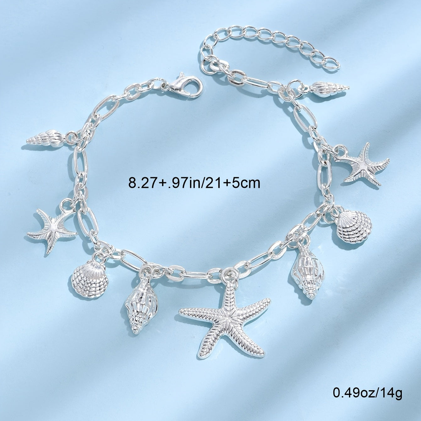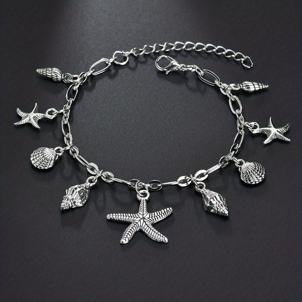 Add a touch of summer beach style to your outfit with this anklet featuring starfish, shell, and conch shape pendants. Perfect for women who love unique foot jewelry.