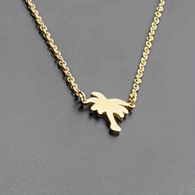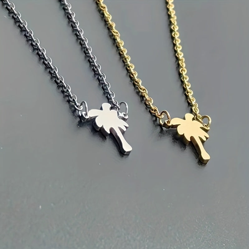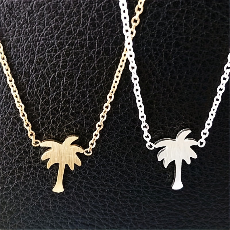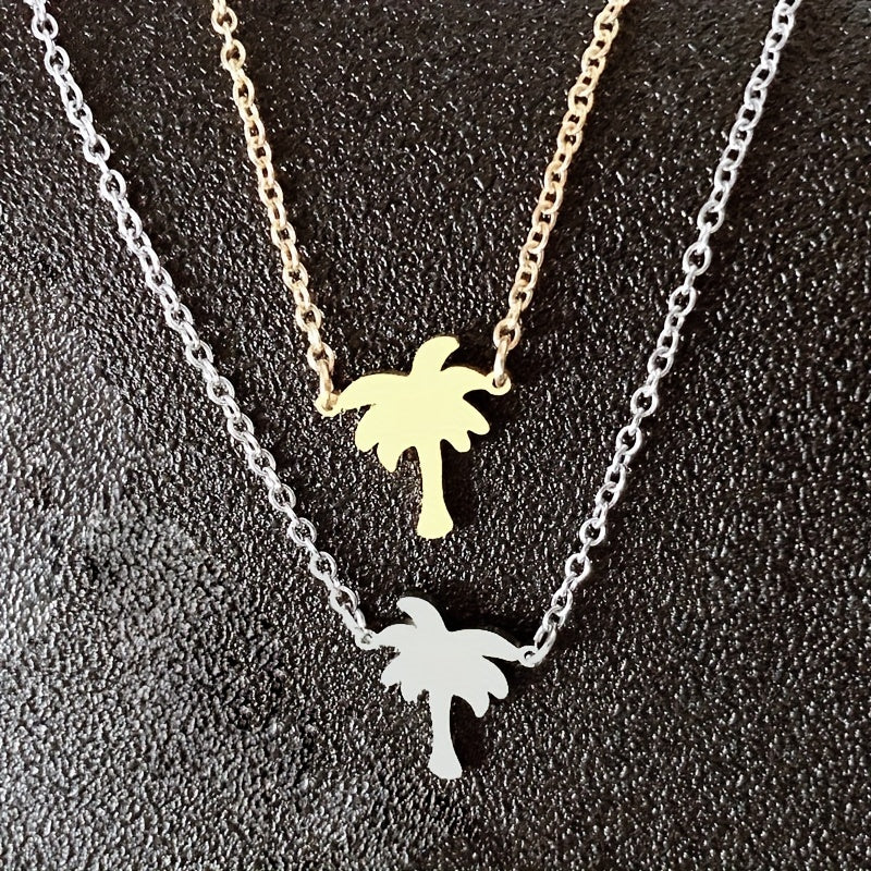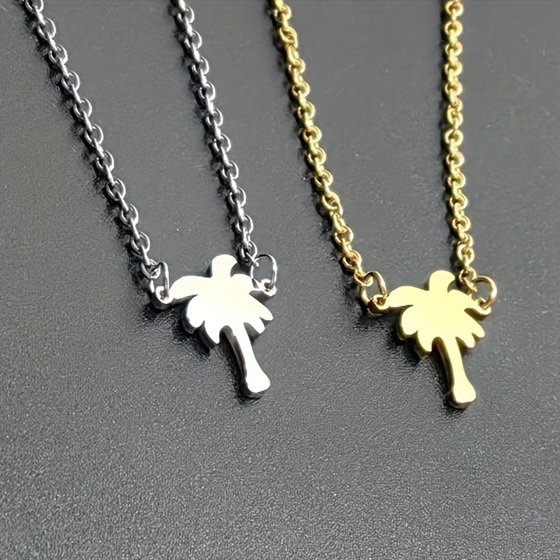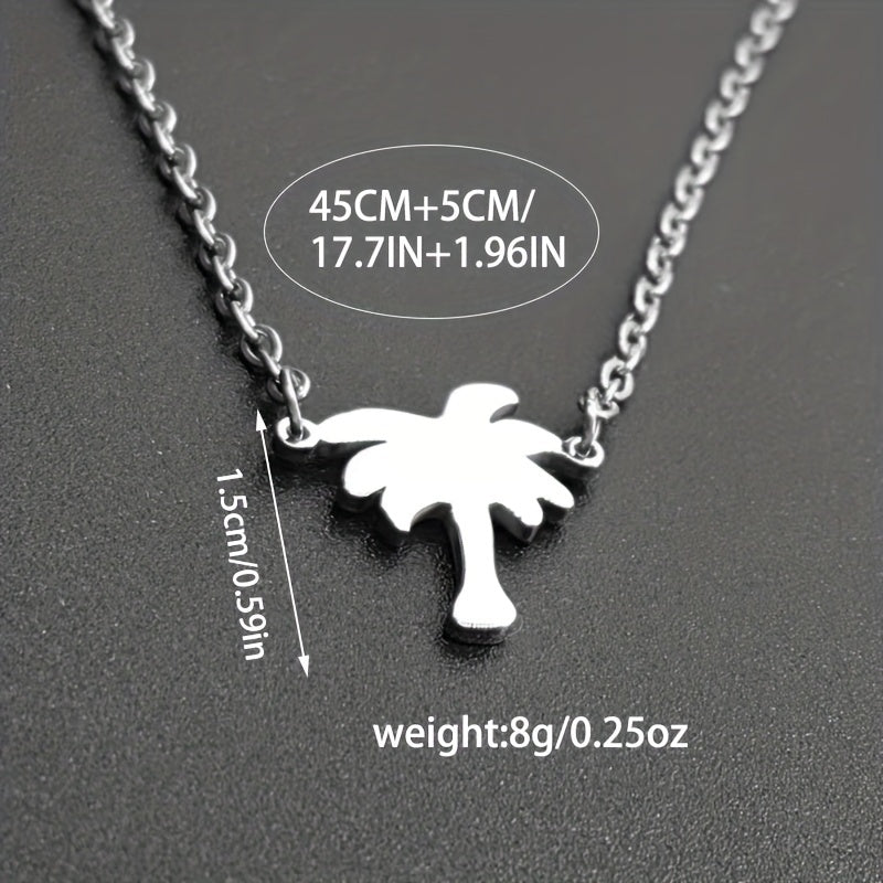 Add a tropical touch to your outfit with this stainless steel necklace featuring a coconut palm pendant. Perfect for beach lovers and as a summer accessory.