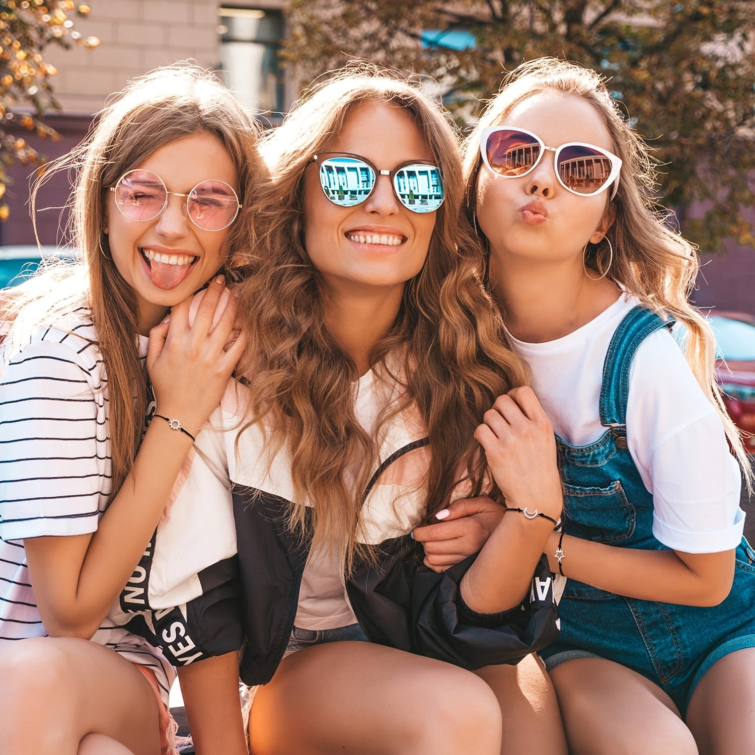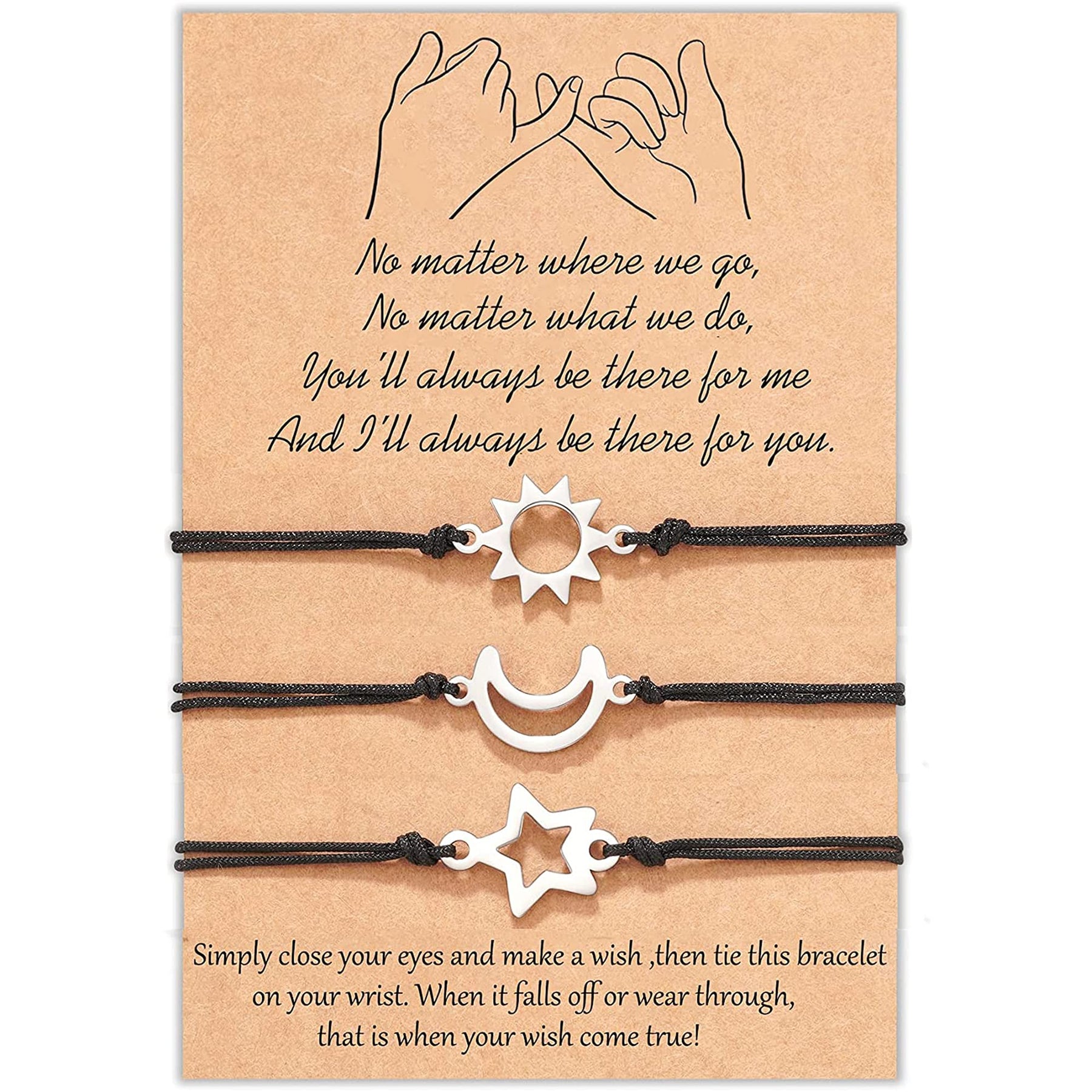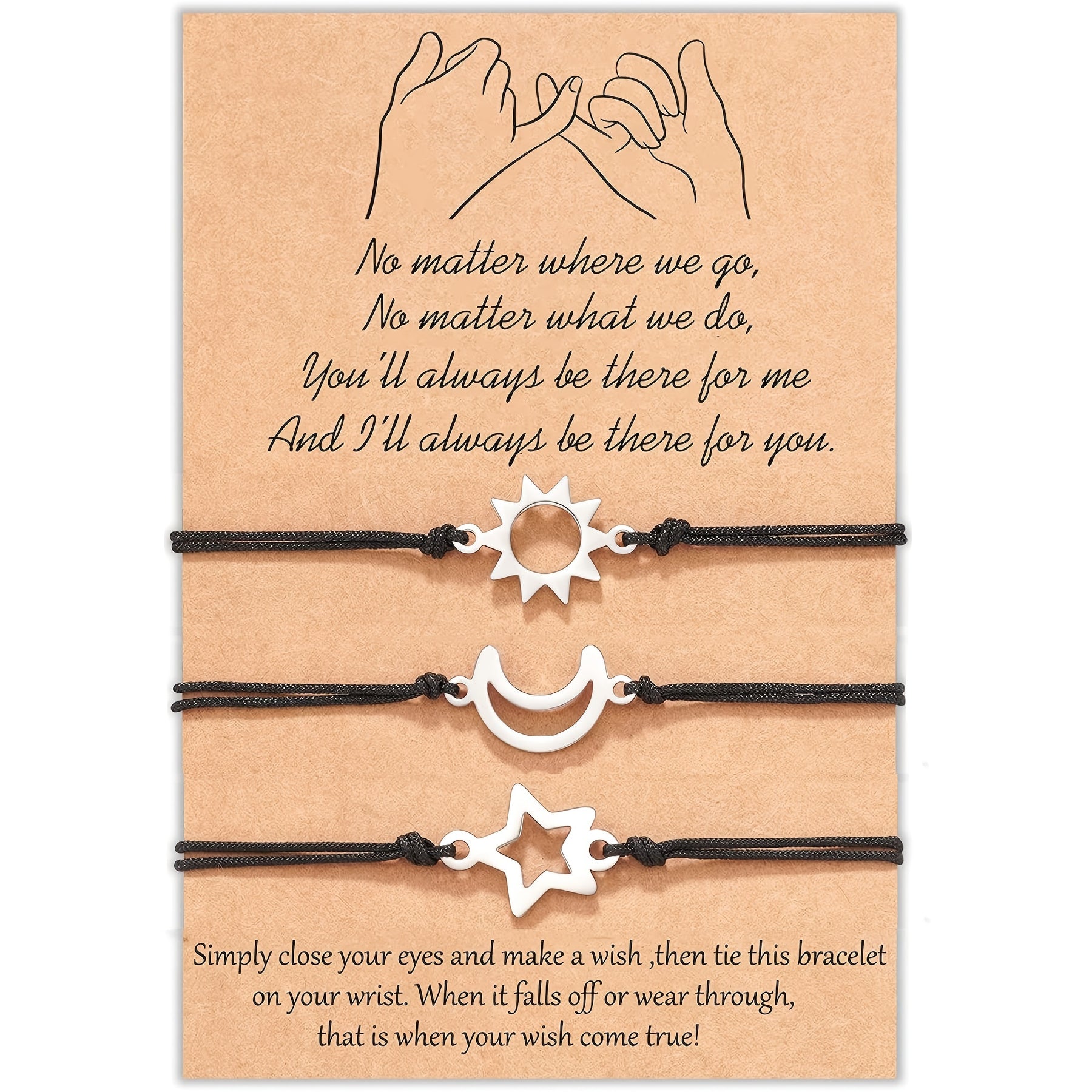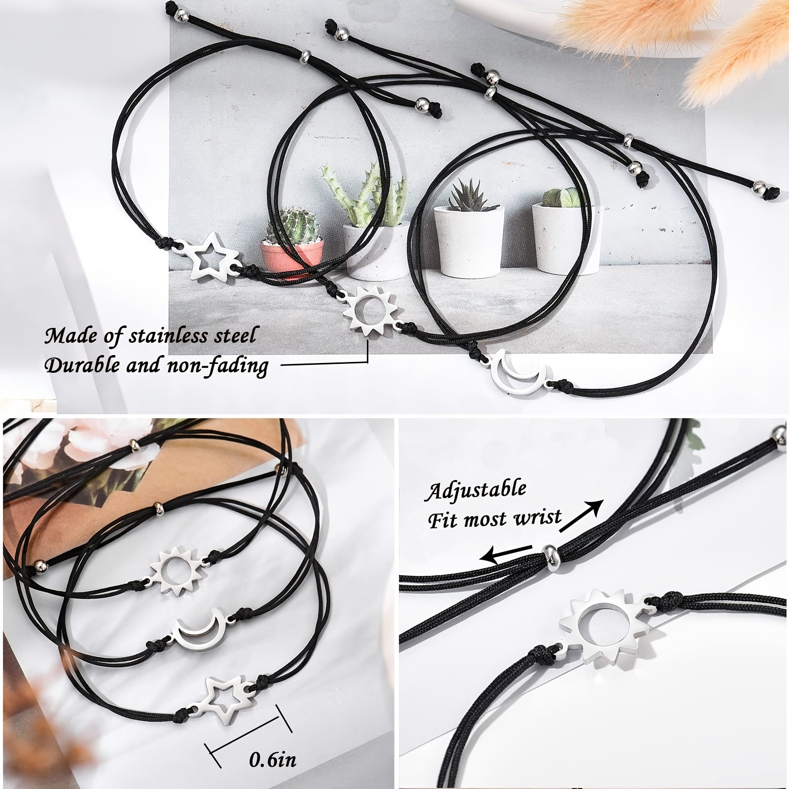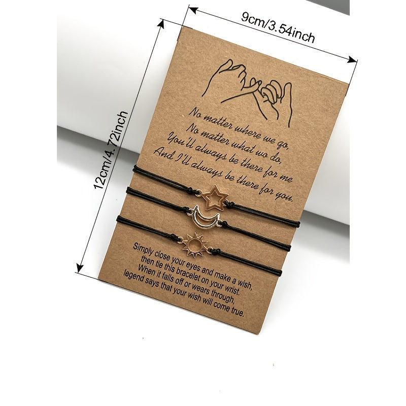 This set includes three woven bracelets featuring sun, moon, and star charms. Perfect for adding a touch of creativity and positivity to your outfit.