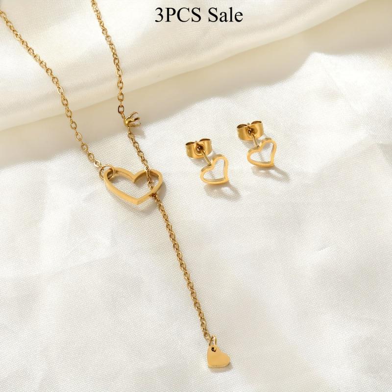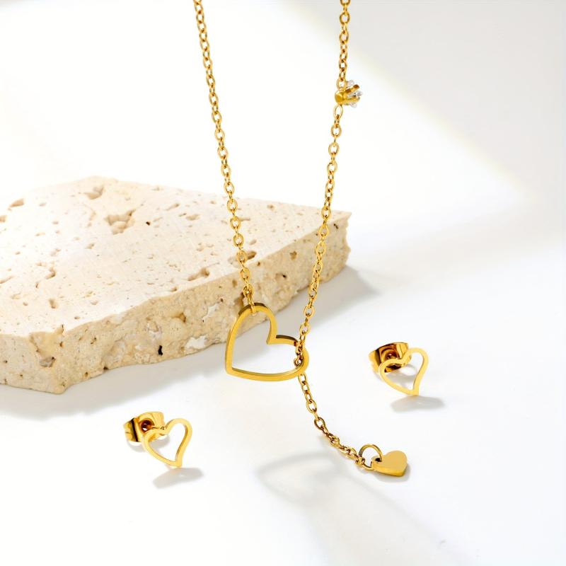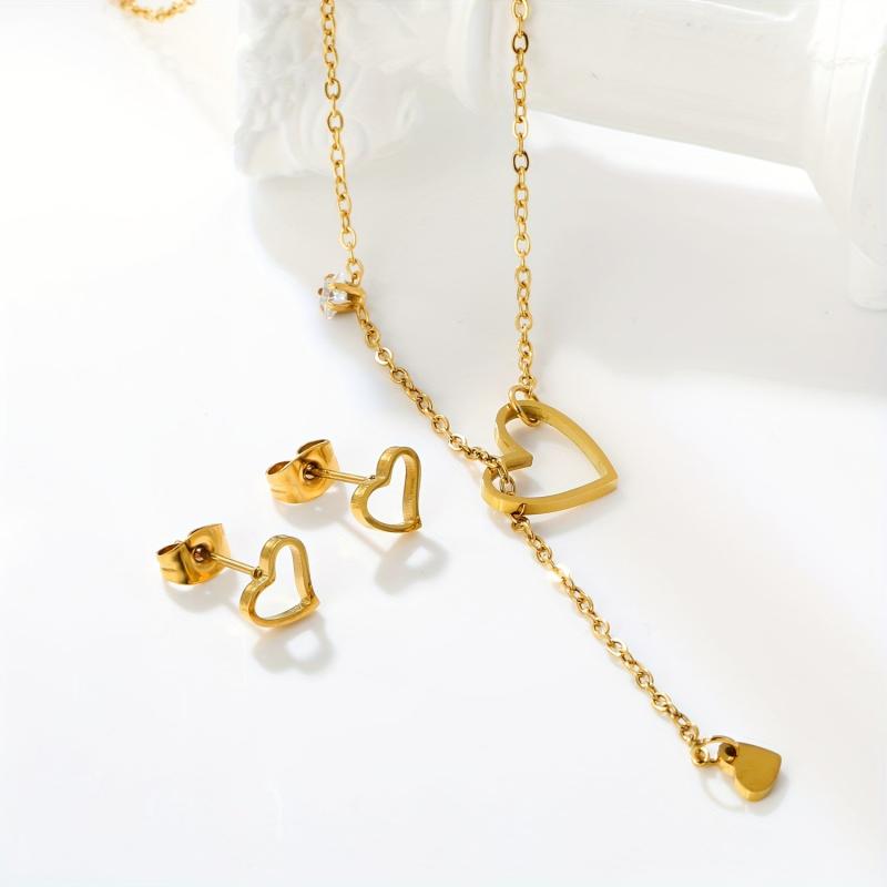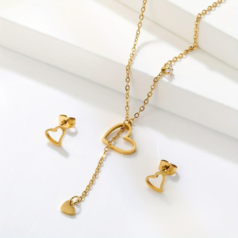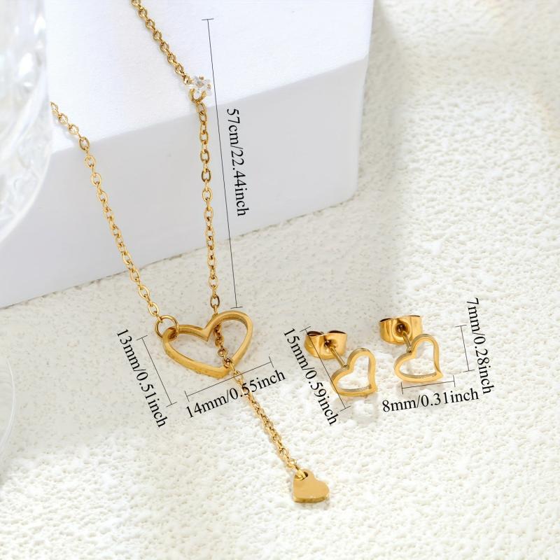 This stainless steel jewelry set features a versatile design with a sweet heart-shaped pendant. It includes a necklace, earrings, and a pendant, making it perfect for everyday wear or special occasions.