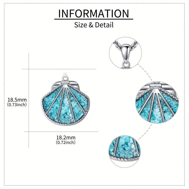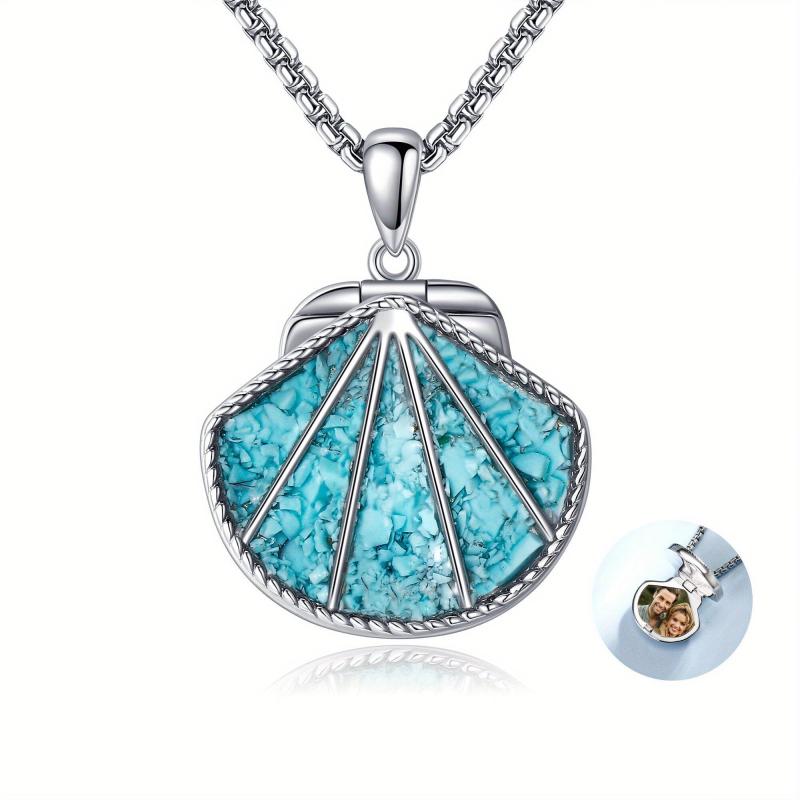 Sterling silver locket necklace featuring a synthetic turquoise seashell design. This necklace can hold pictures inside the locket. Stylish seashell jewelry for women.