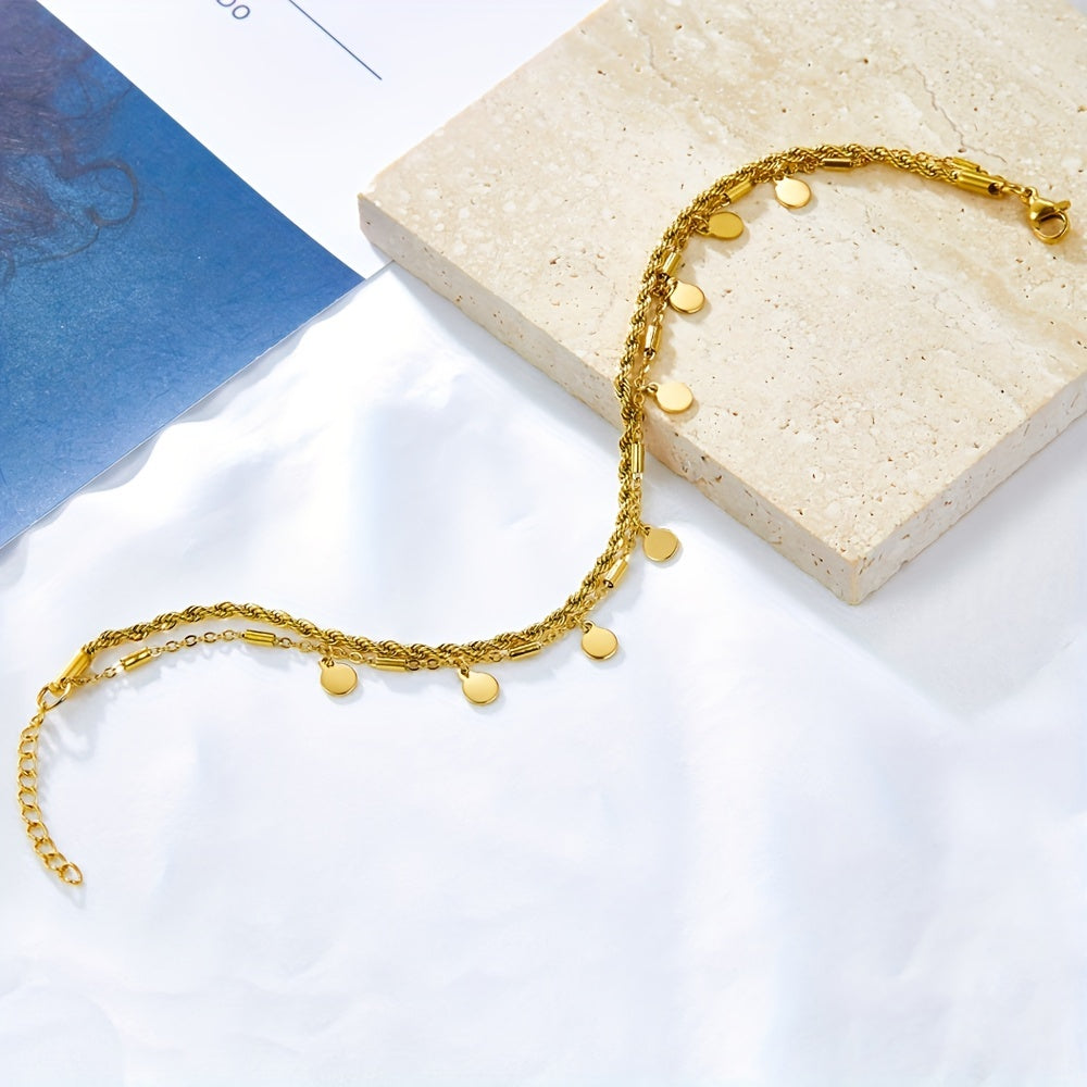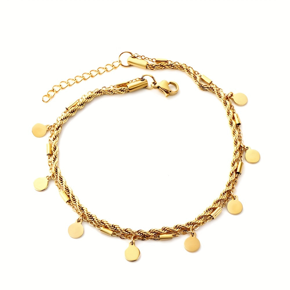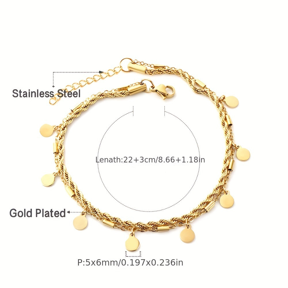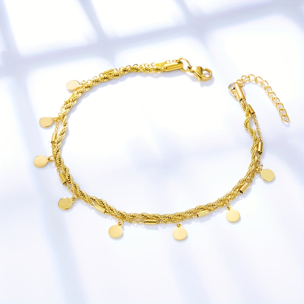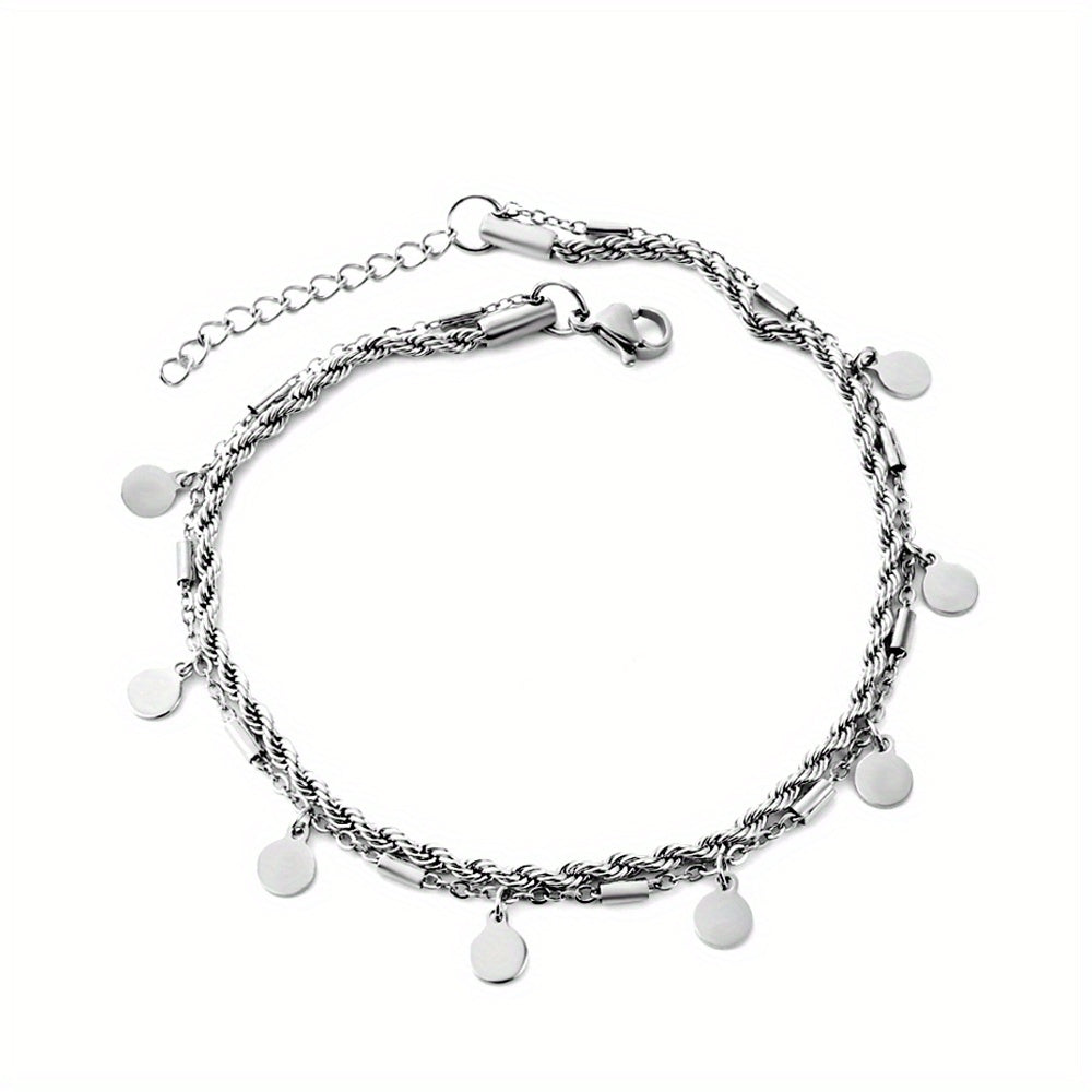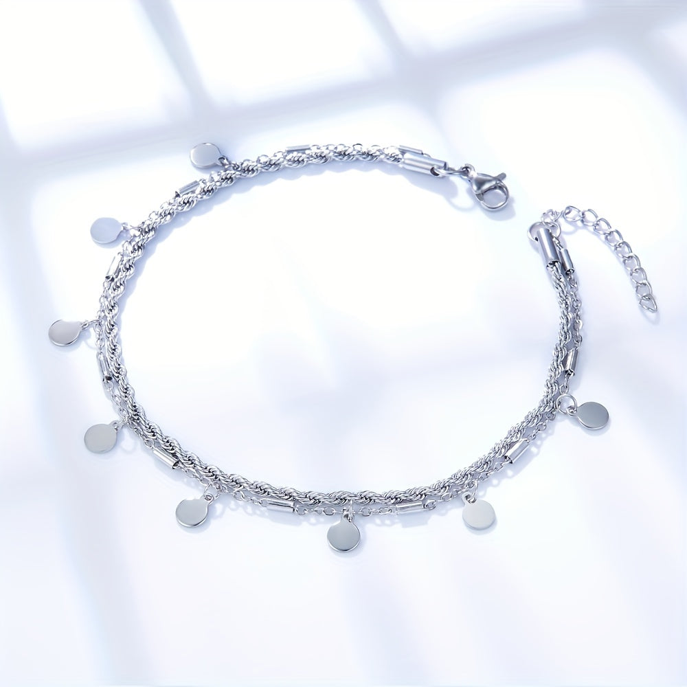 Elegant ankle bracelet featuring round coin shape tassel pendant on a twist stainless steel chain. Perfect accessory for women.
