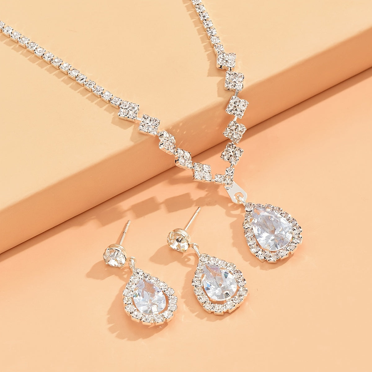 Chic and elegant teardrop shape jewelry set featuring inlaid zircon stones in pendant necklace and dangle earrings. Perfect for women and girls.