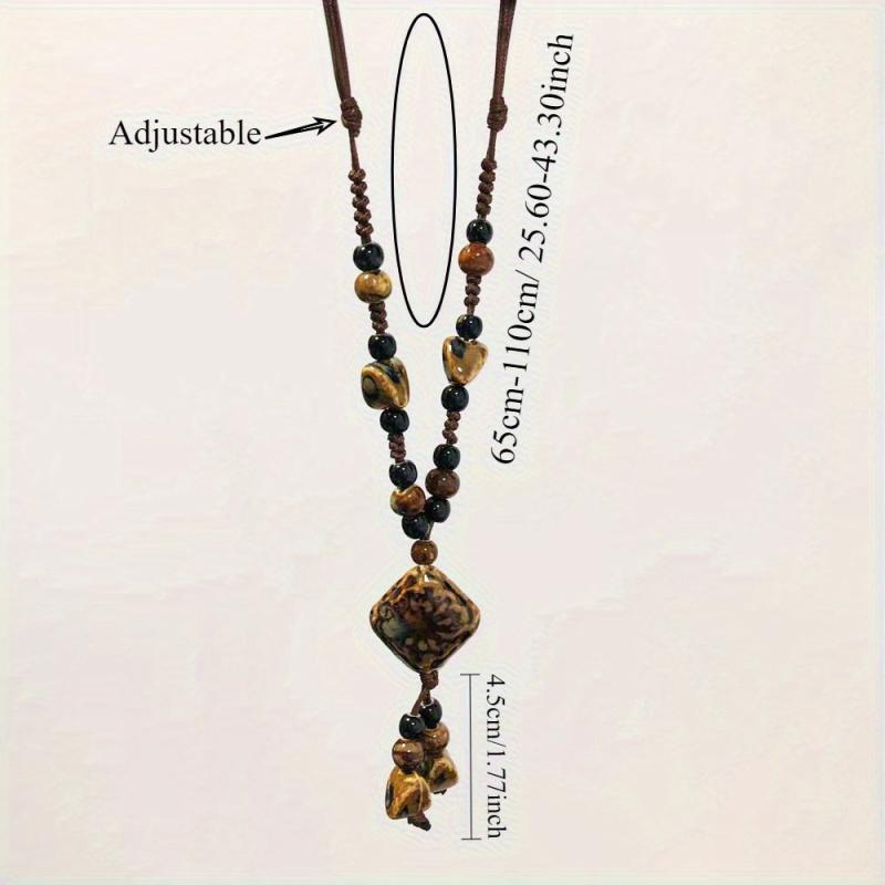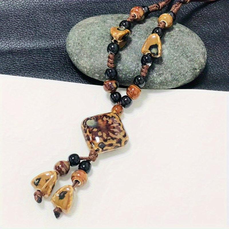 Vintage tribal-inspired necklace featuring square ceramic beads on a handwoven synthetic fiber rope chain. Perfect gift for mothers and birthdays.