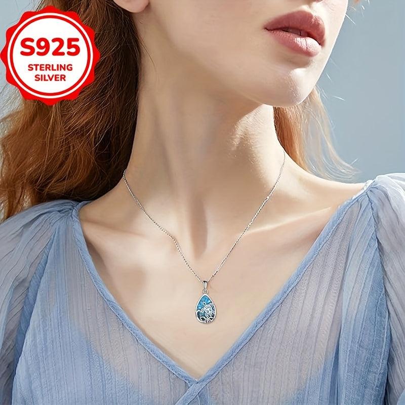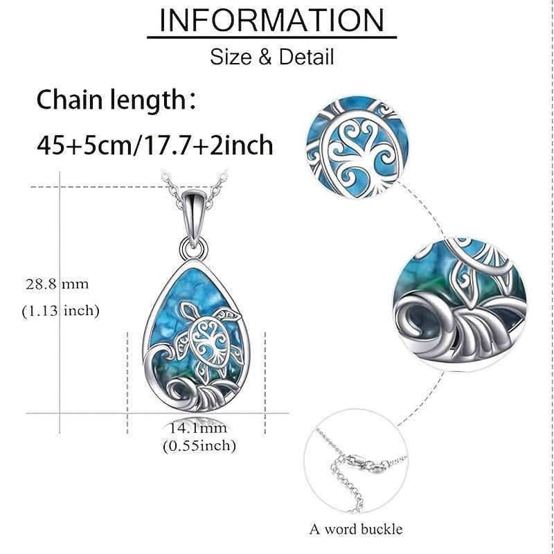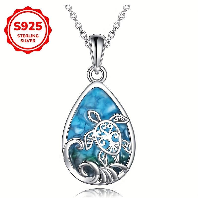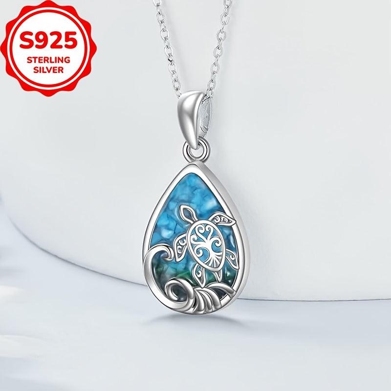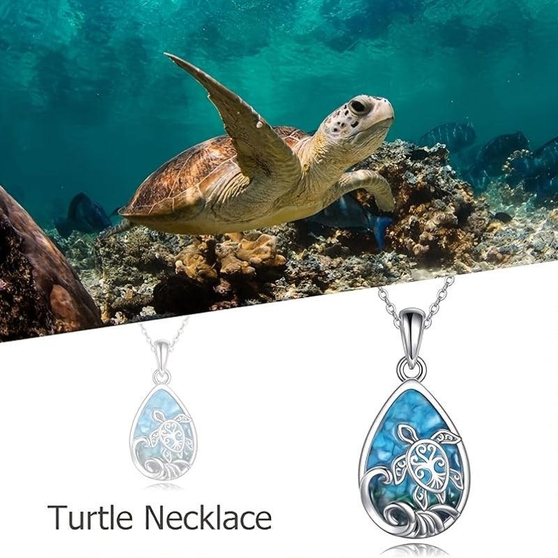 This women's pendant necklace showcases a turtle design inlaid with synthetic turquoise, making it a stunning high jewelry gift option. The necklace is hypoallergenic and weighs 4 grams.