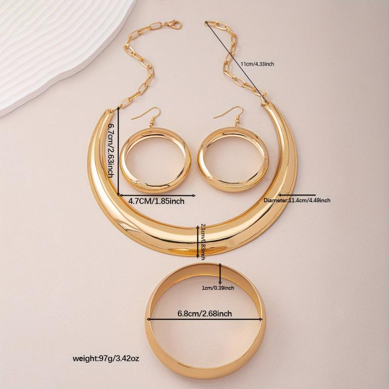 Elevate your style with this stylish jewelry set perfect for daily wear or parties. The set includes a statement necklace, bracelet, and hoop earrings.