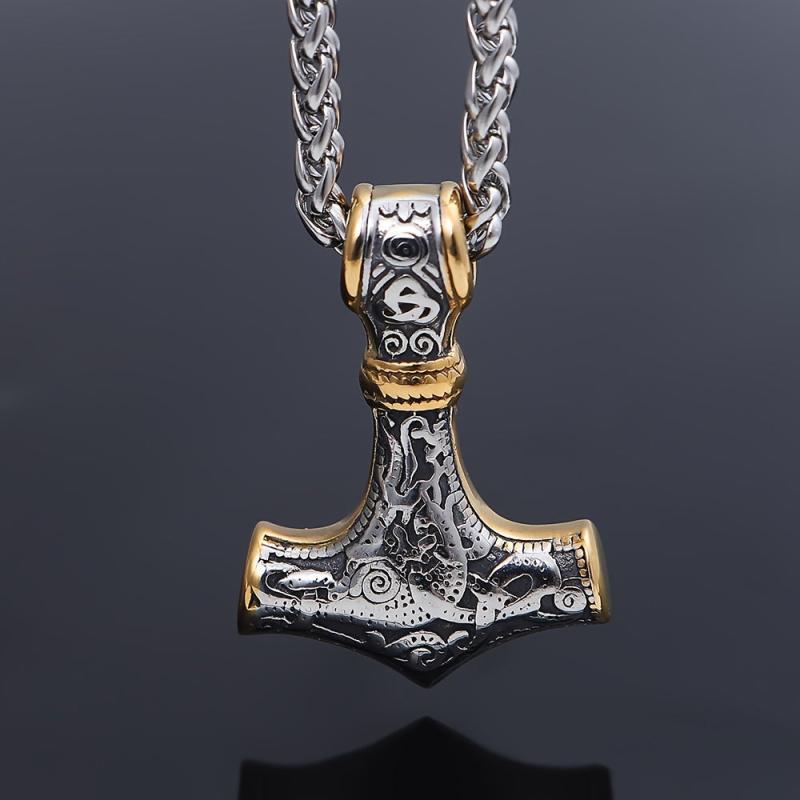 Viking Double Hammer Pendant Necklace Stainless Steel Men&