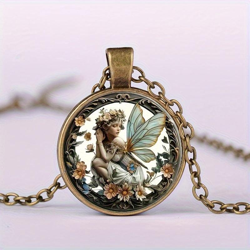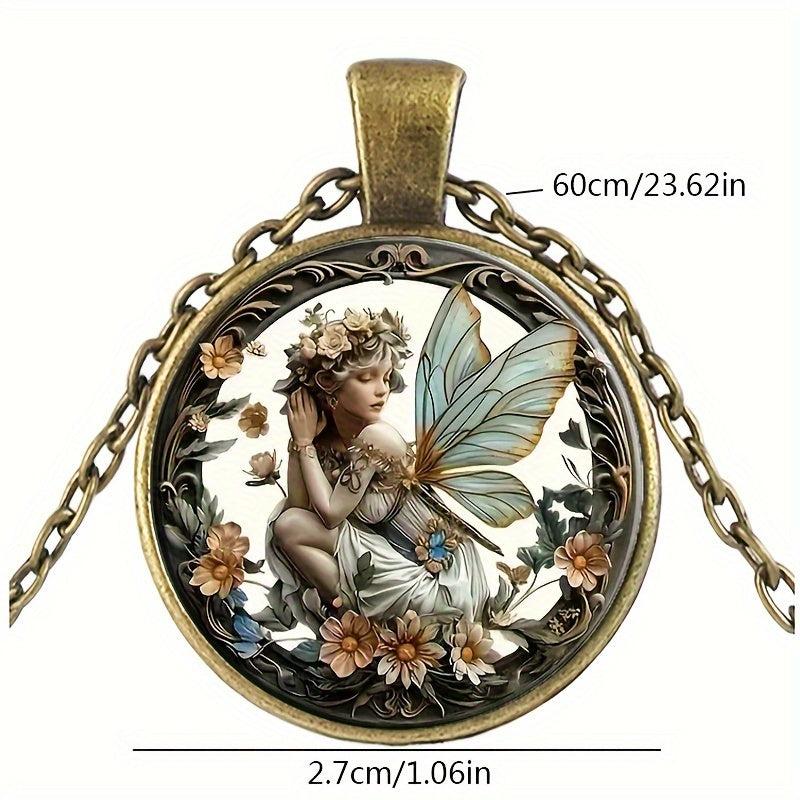 This vintage angel fairy glass pendant necklace is a beautiful fantasy theme jewelry piece. It features a glass mosaic pendant on an alloy chain, making it a perfect accessory for daily wear or as a gift for someone special.