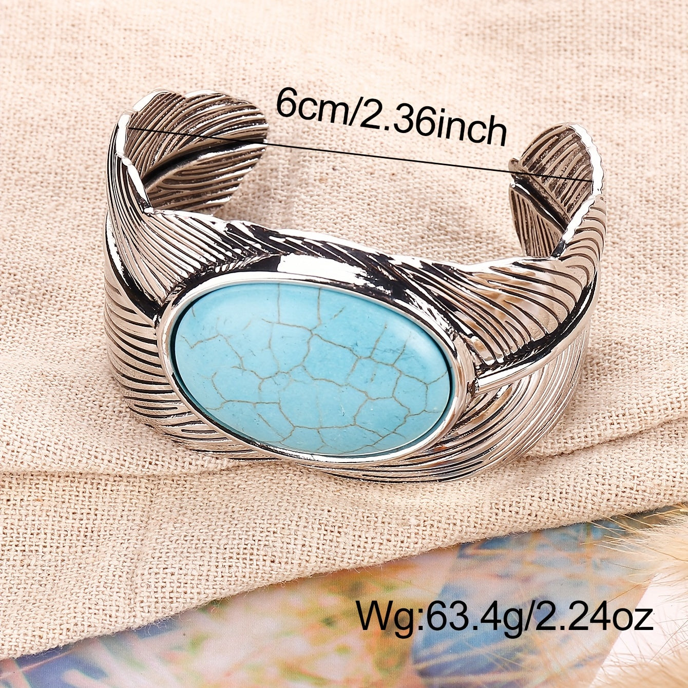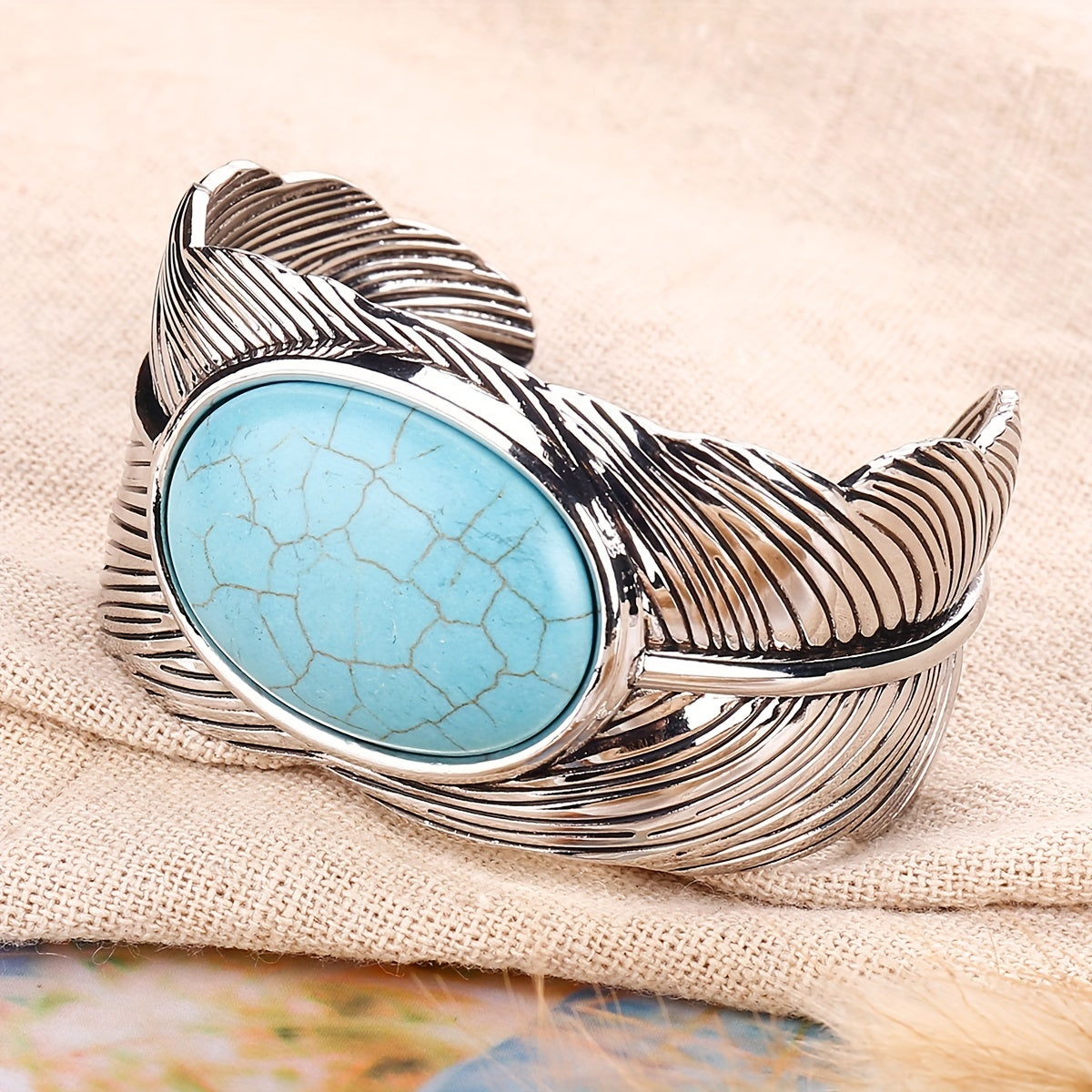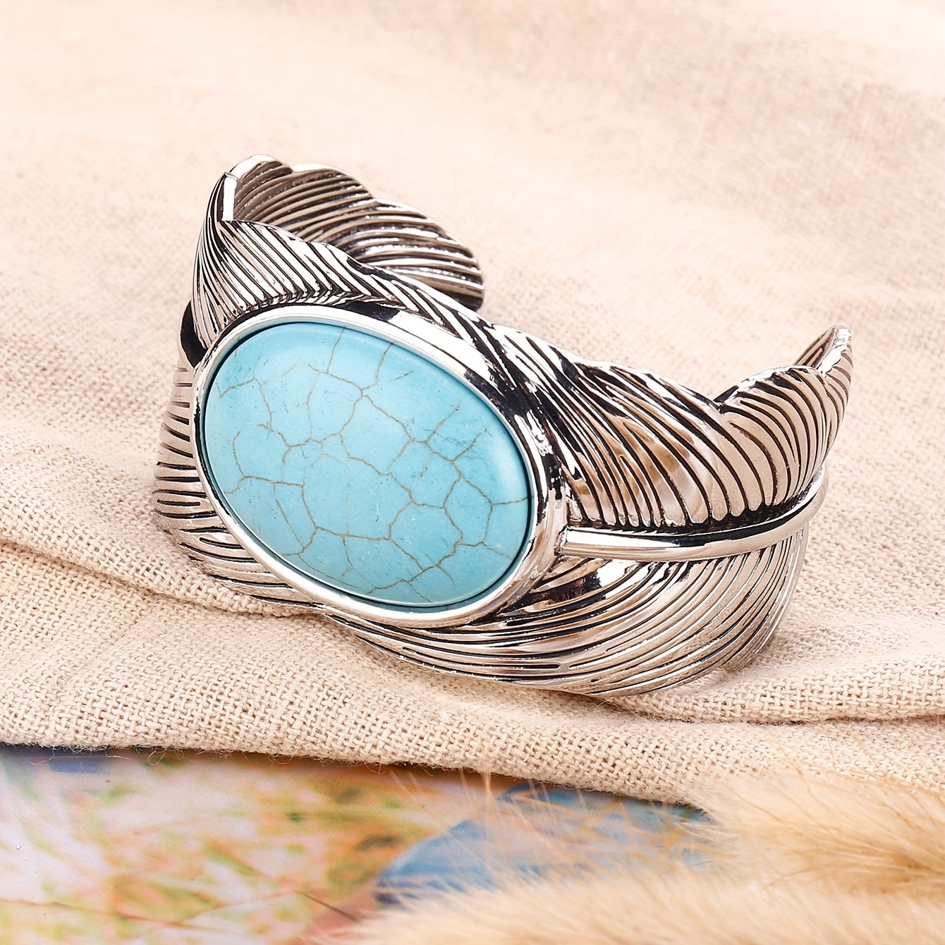 Add a touch of vintage boho style to your hand jewelry collection with this stunning feather cuff bangle bracelet featuring inlaid turquoise. Perfect for a unique and eye-catching look.