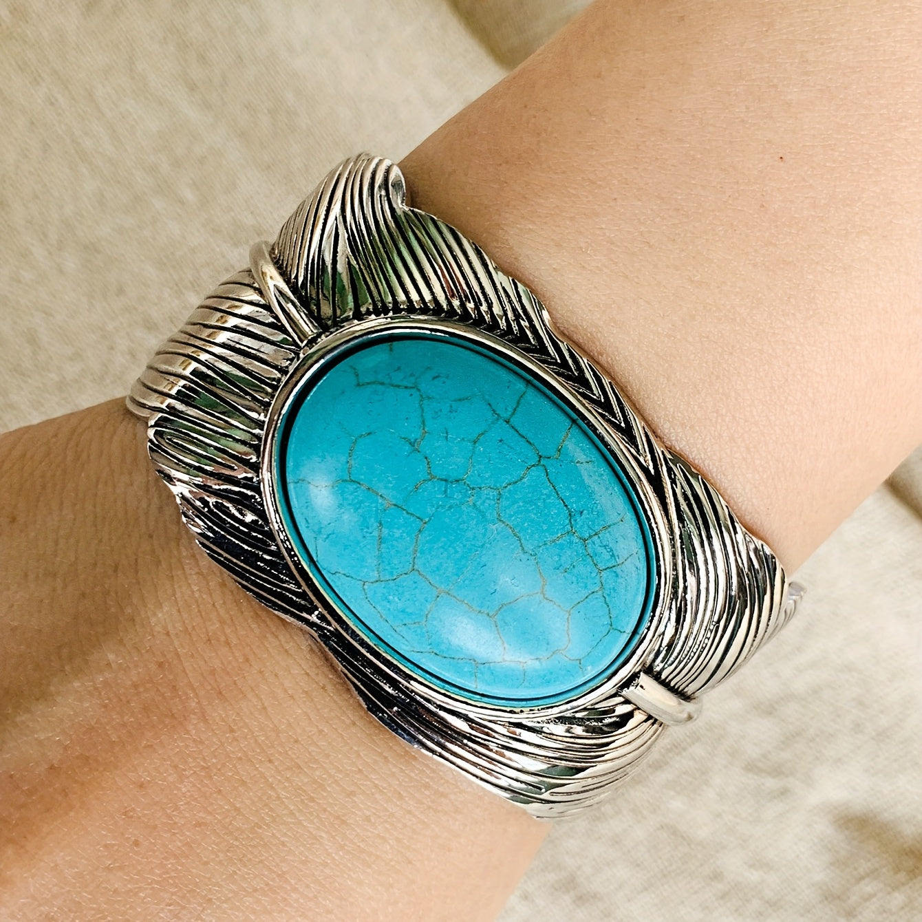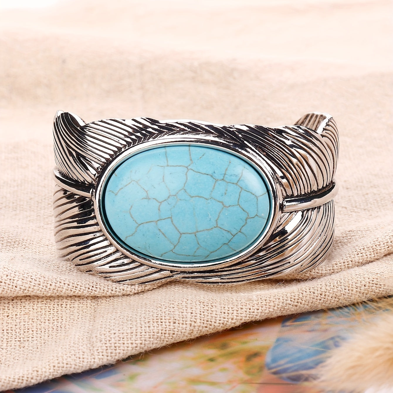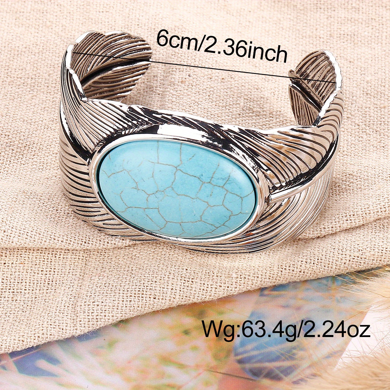 Add a touch of vintage boho style to your hand jewelry collection with this stunning feather cuff bangle bracelet featuring inlaid turquoise. Perfect for a unique and eye-catching look.