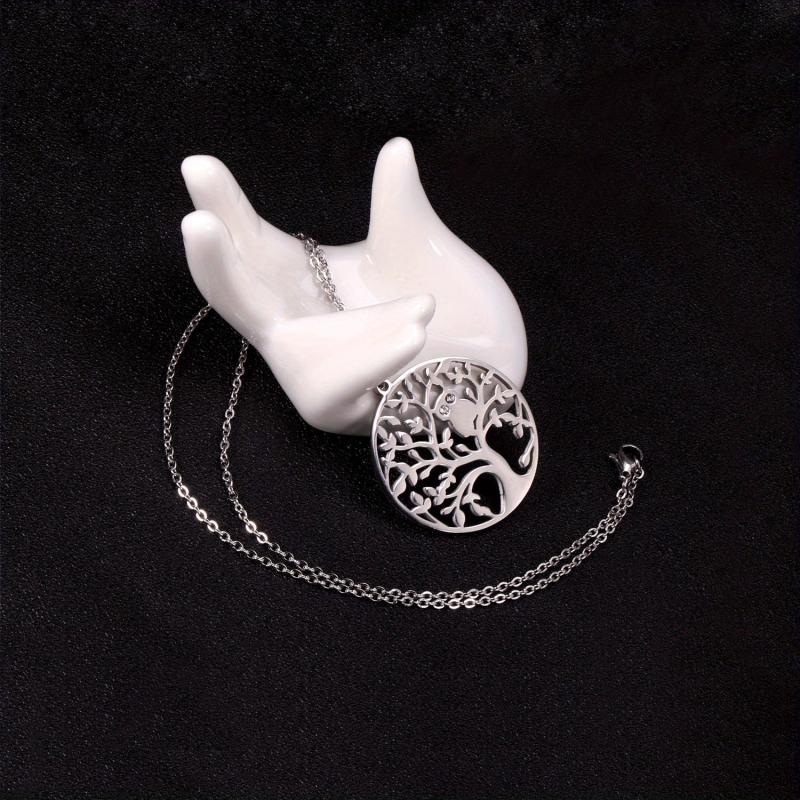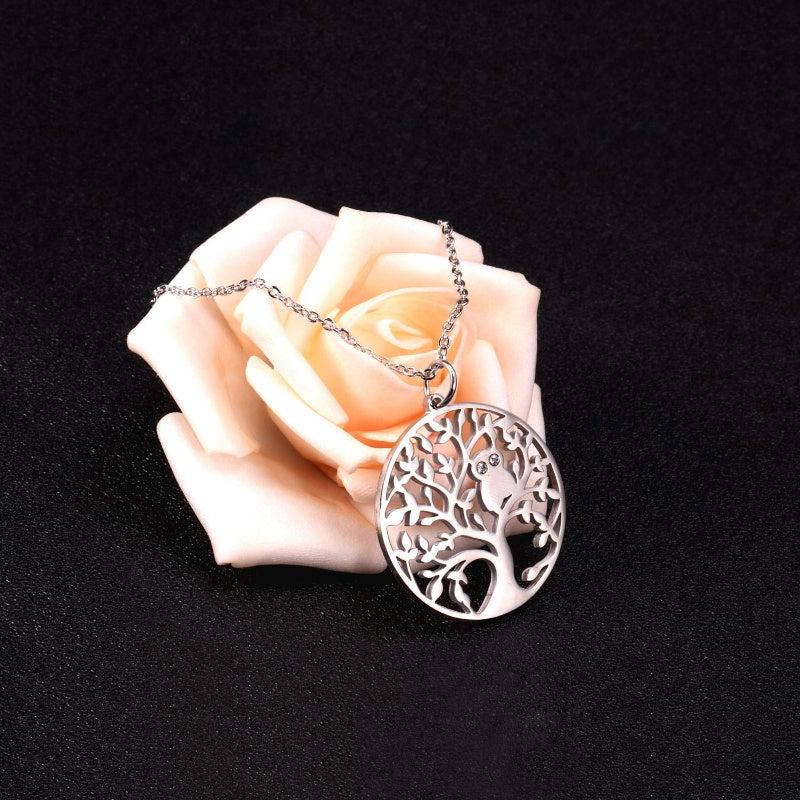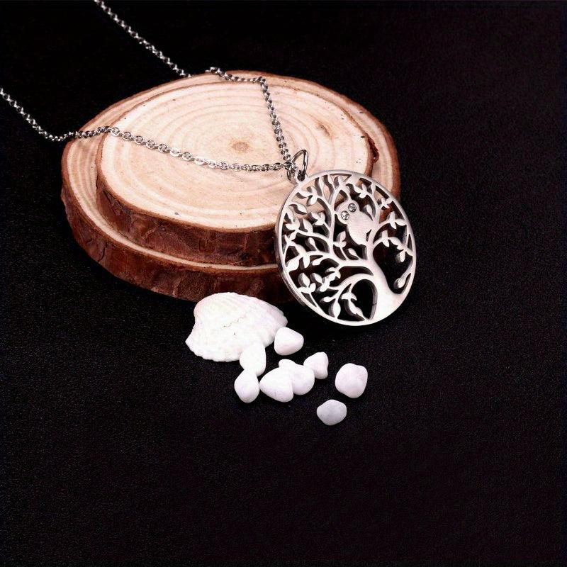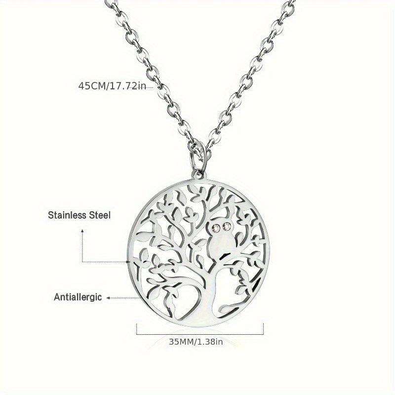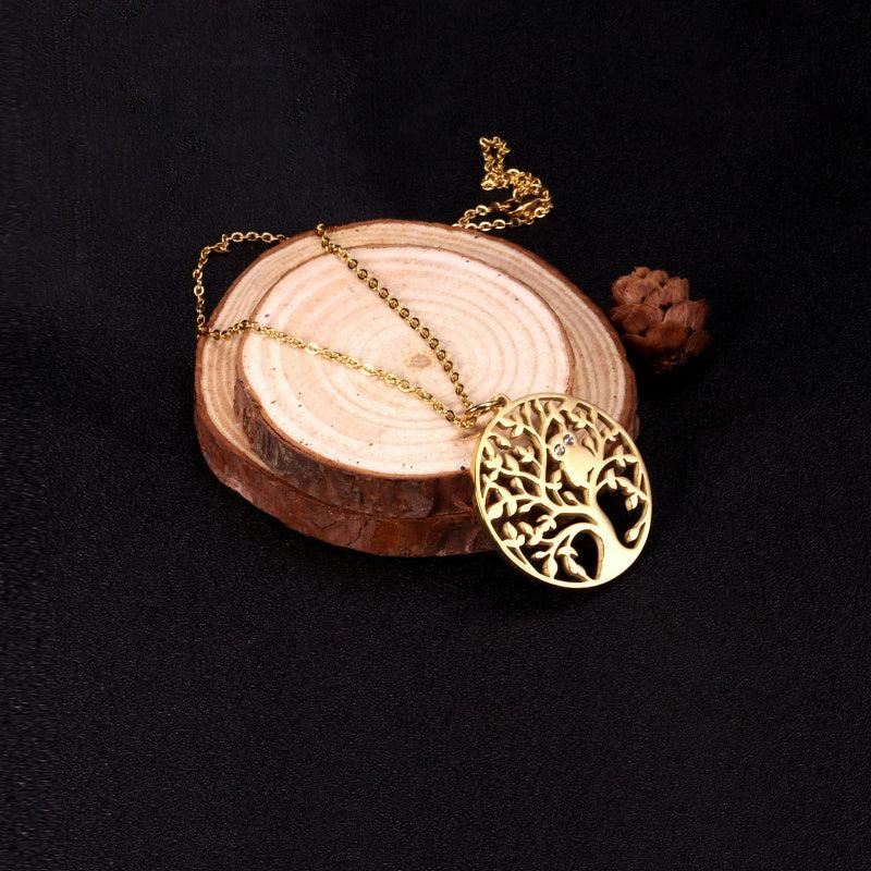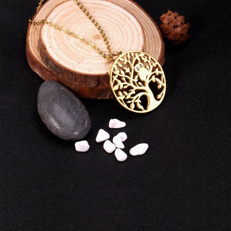 Nature-inspired pendant necklace featuring a tree and owl charm, made of stainless steel with a golden tone finish. Perfect for everyday wear or gifting.