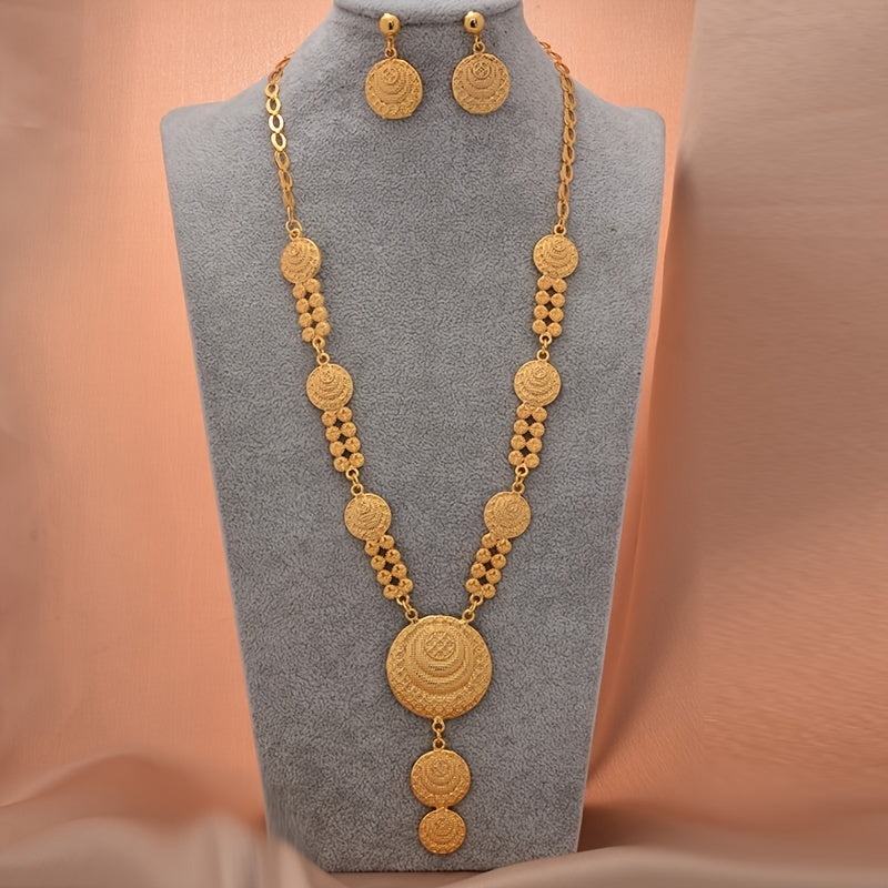 Complete your wedding or engagement look with this vintage style copper jewelry set. The set includes a pendant necklace and dangle earrings plated with 24K gold for an elegant touch.