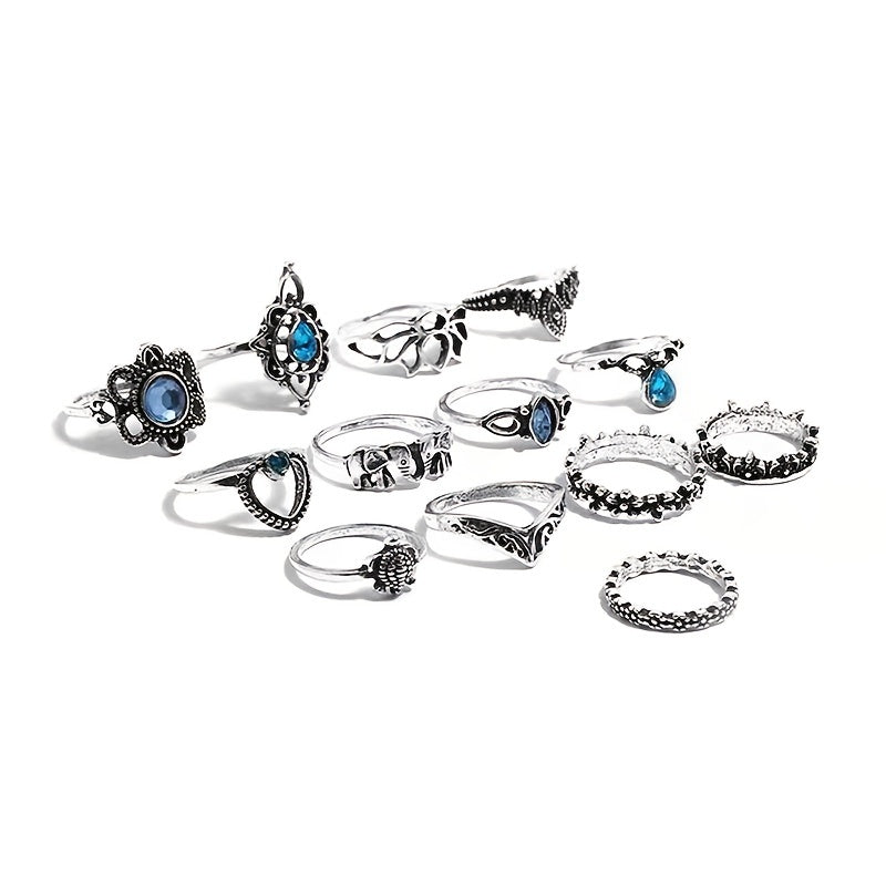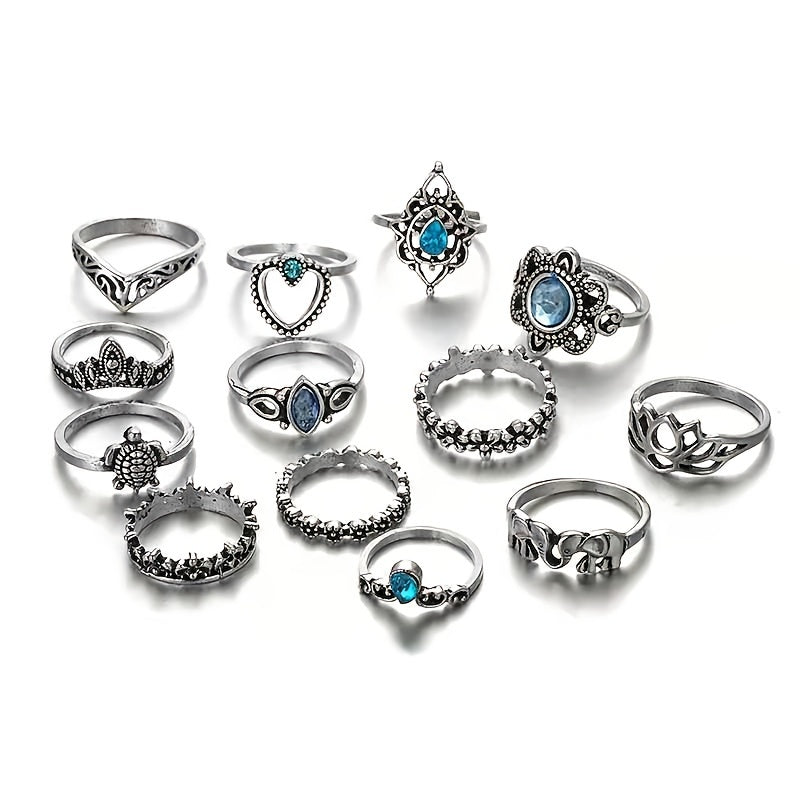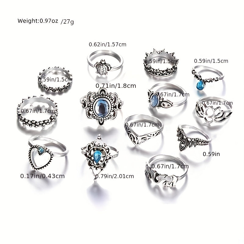 Add a touch of vintage charm to your style with this set of 13 gemstone stackable rings featuring carved crowns and a starry sky design. Perfect for stacking or wearing individually.