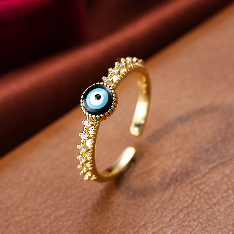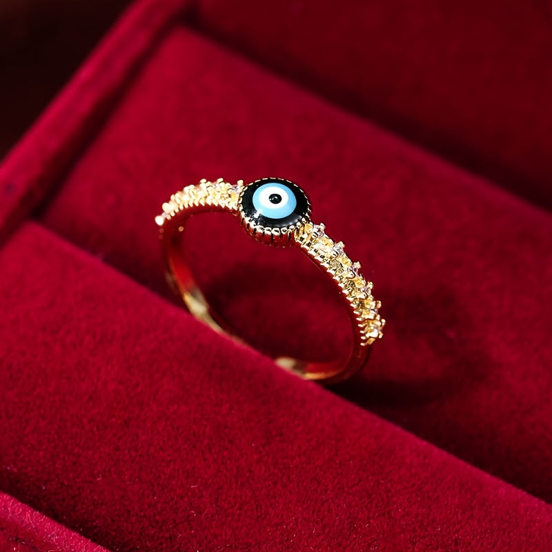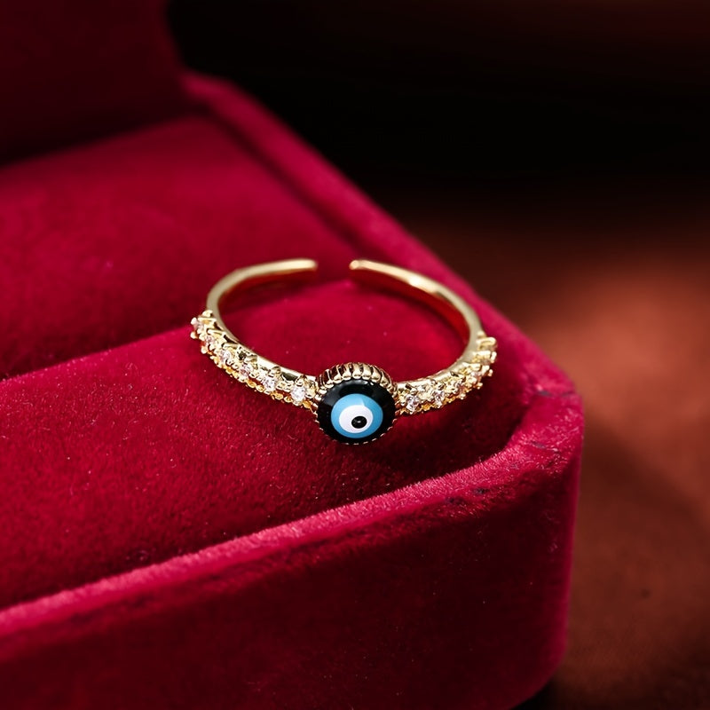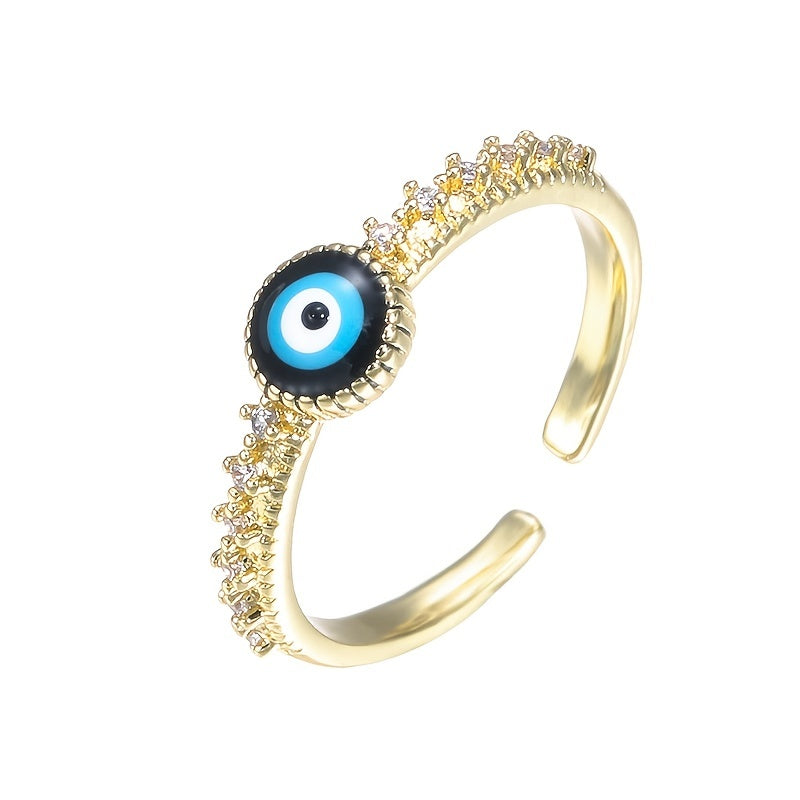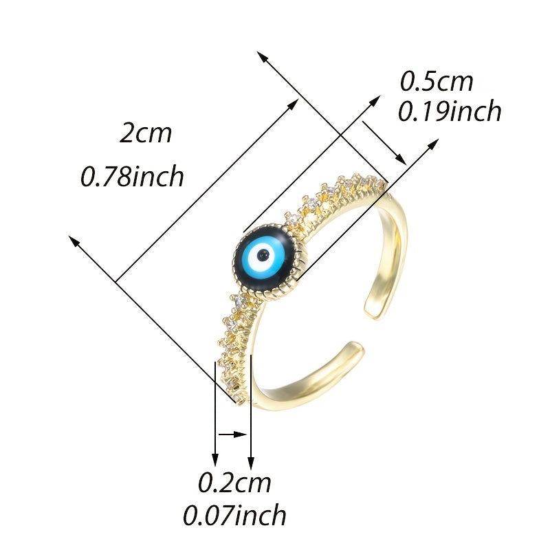 Add a touch of elegance to your look with this vintage-style ring featuring a stunning evil eye design. Made of copper with zircon and enamel details, this open ring is a unique accessory for women.
