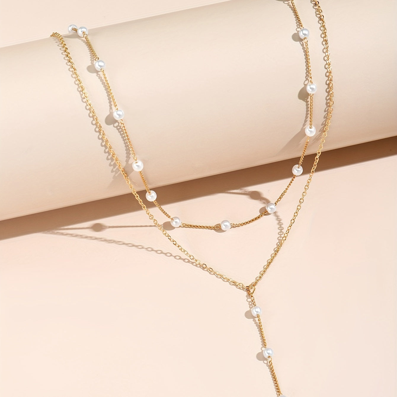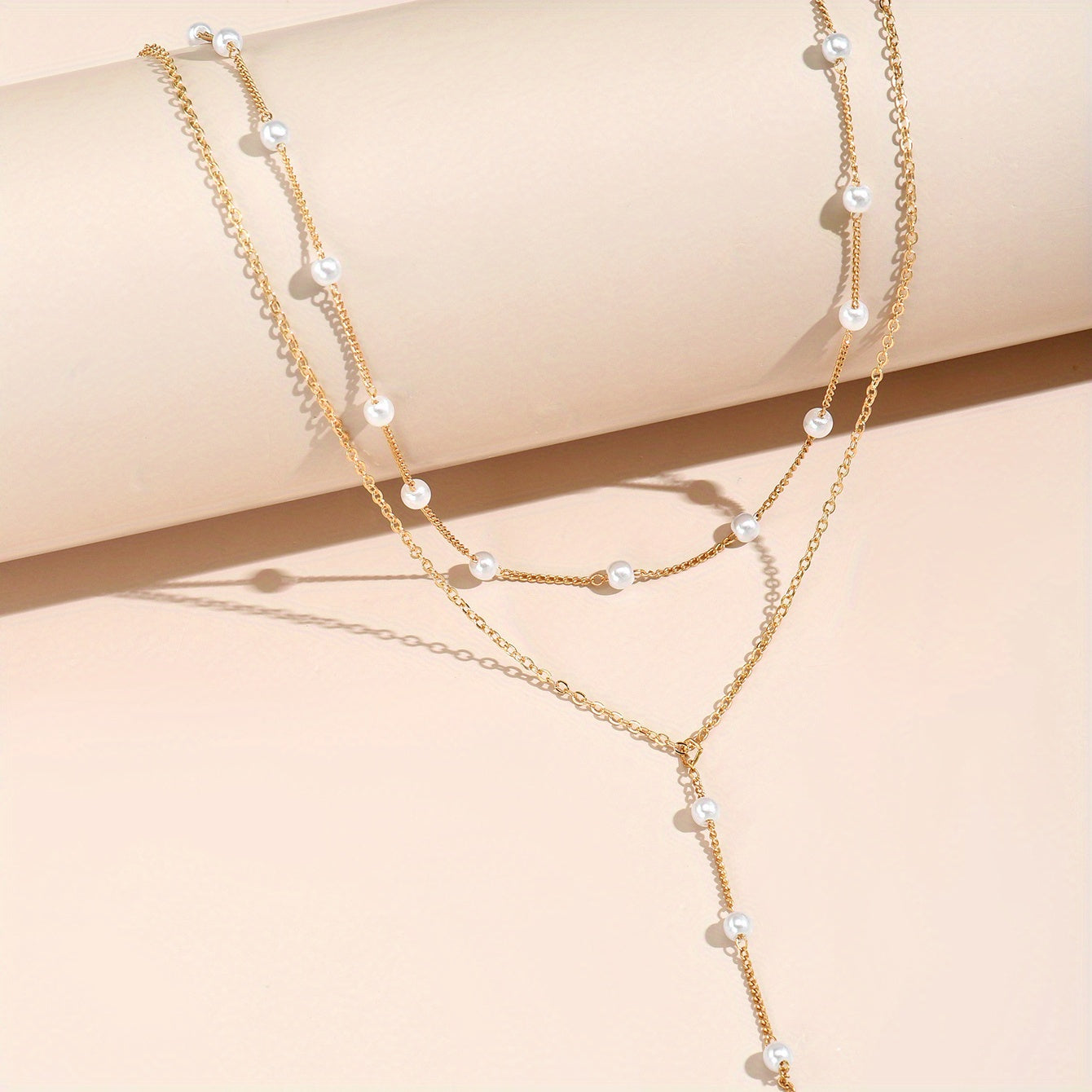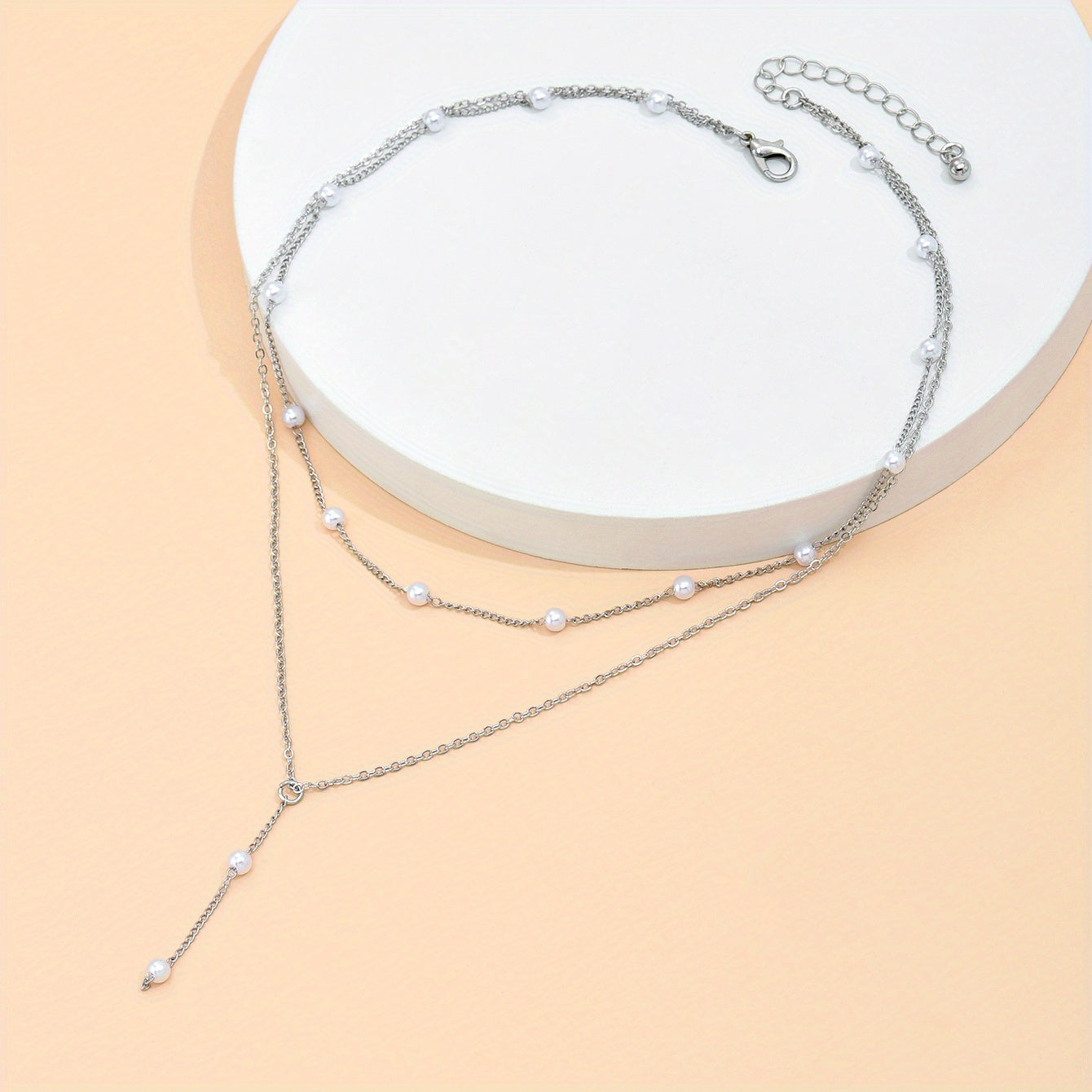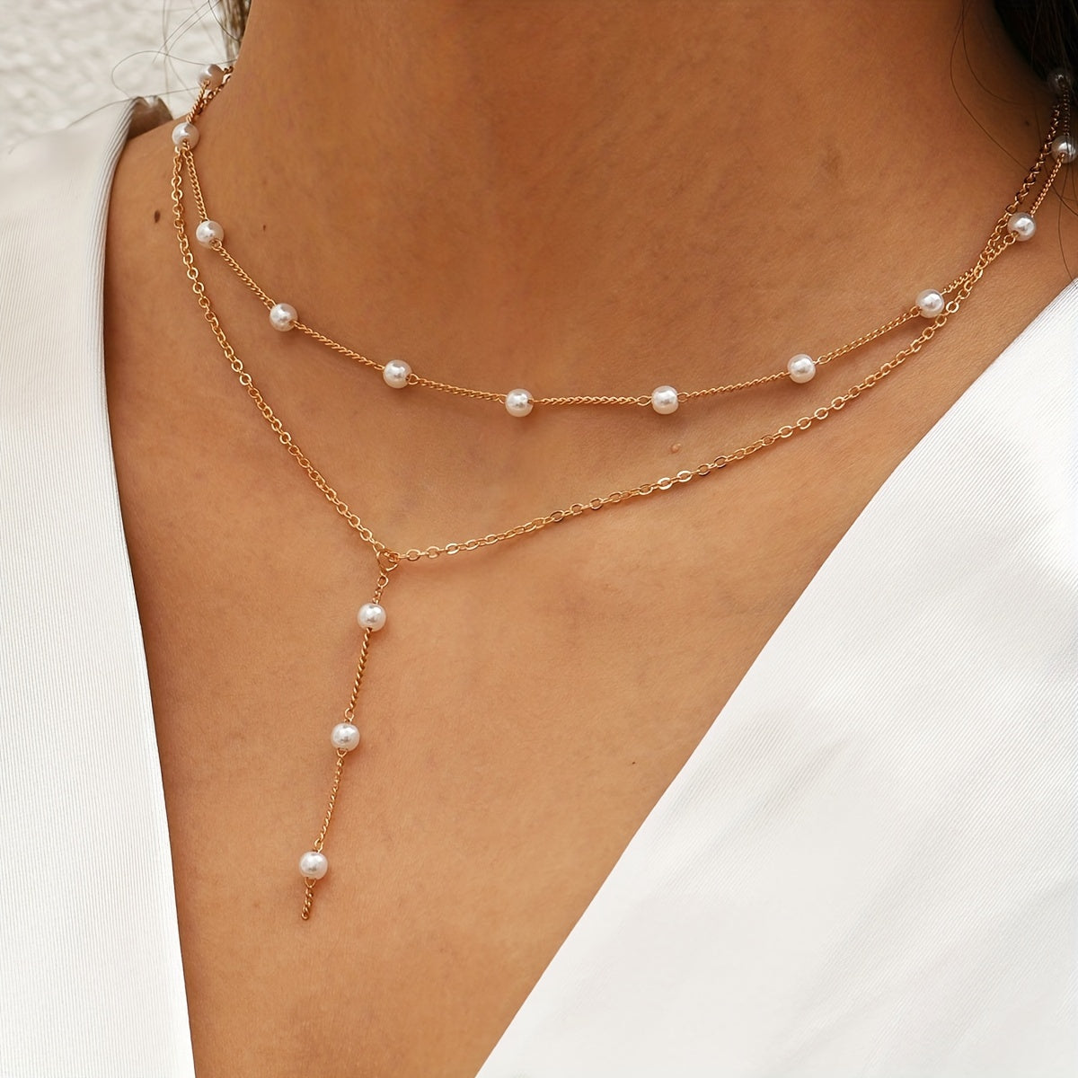 This elegant vintage faux pearl necklace features a charming Y-shaped double layer design, perfect for adding a touch of sophistication to any outfit.