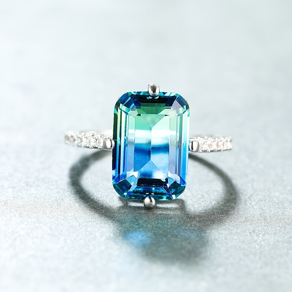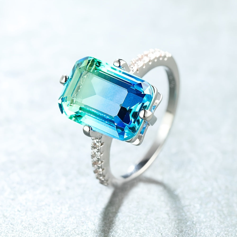 This stunning rainbow crystal stone ring is a timeless piece that adds charm to any bridal or engagement look. Made of classic silver, it exudes elegance and sophistication.