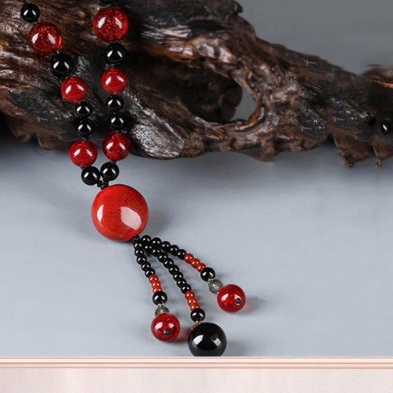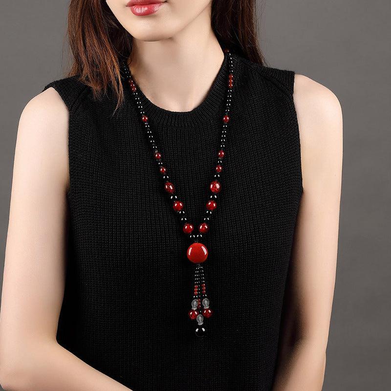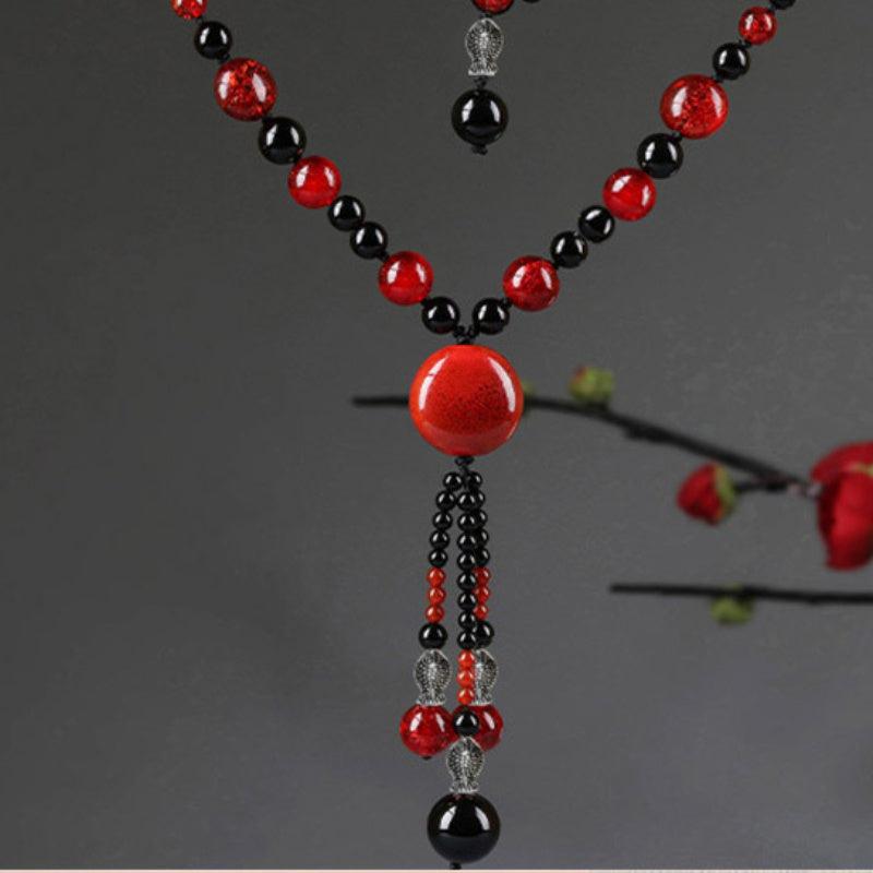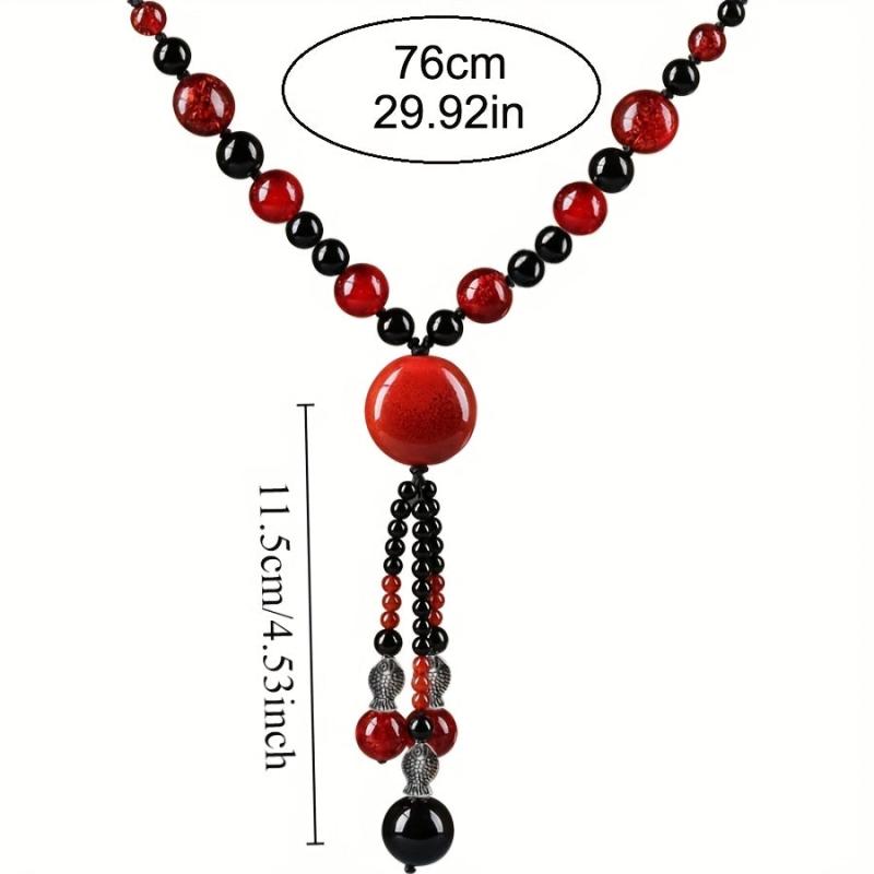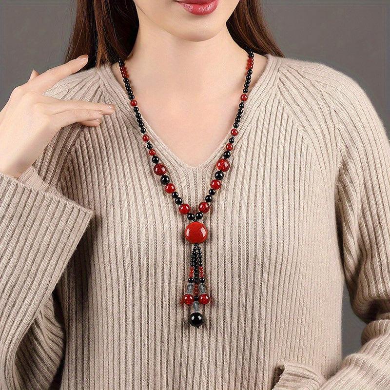 Add a touch of ethnic-inspired elegance to your autumn and winter party outfits with this vintage French style long pendant necklace featuring red beads.