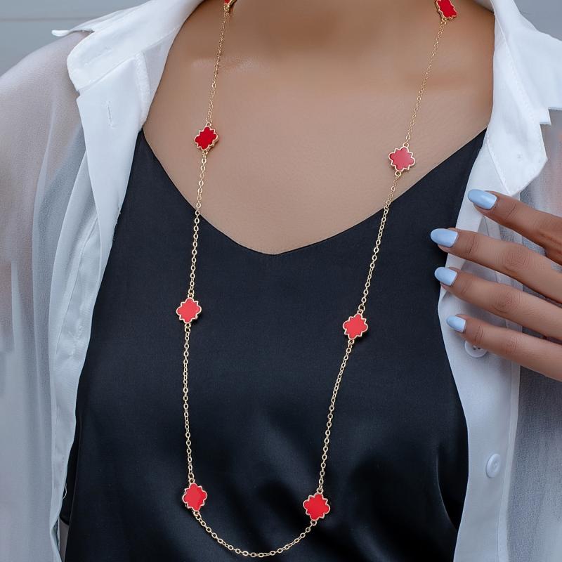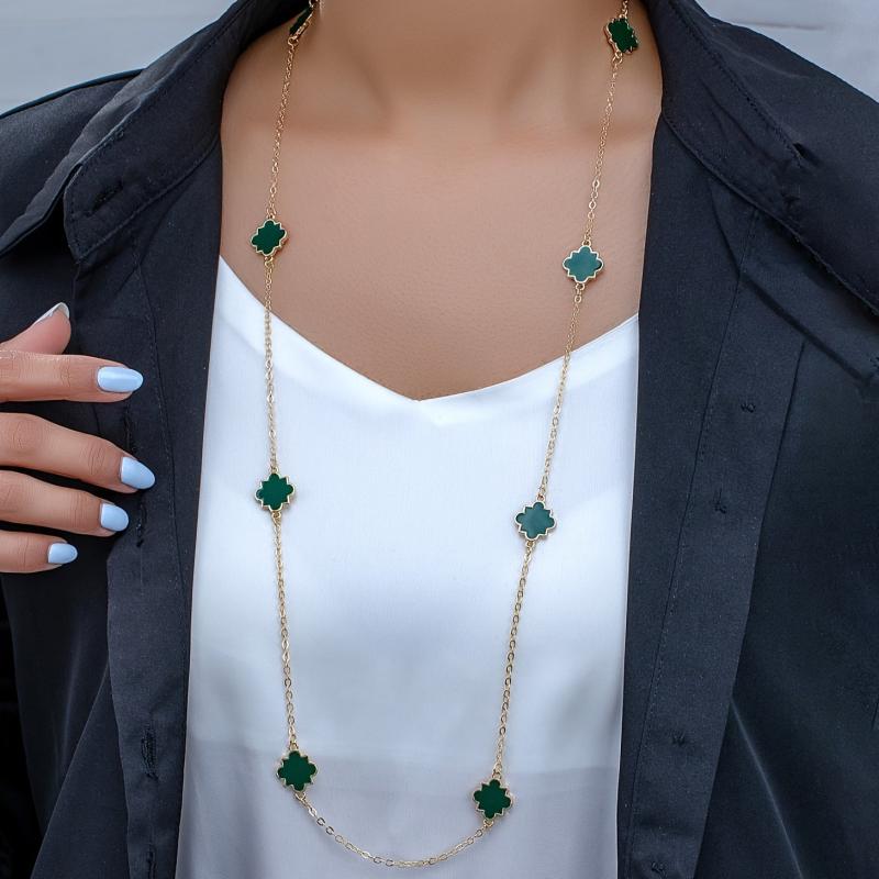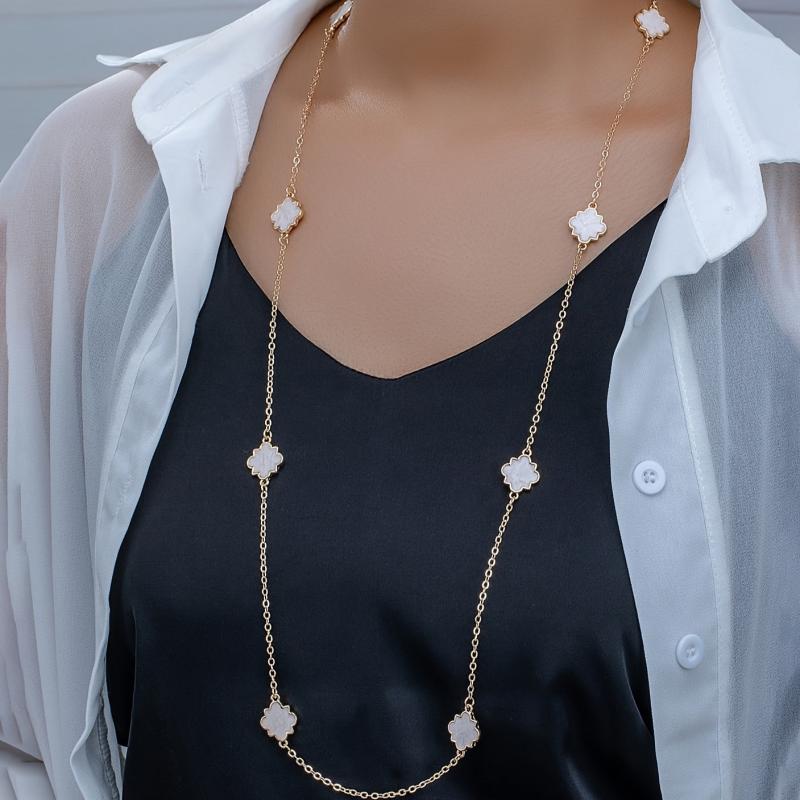 Elegantly designed vintage style long drip necklace sweater chain with a geometric flower shape pendant.