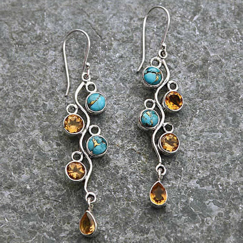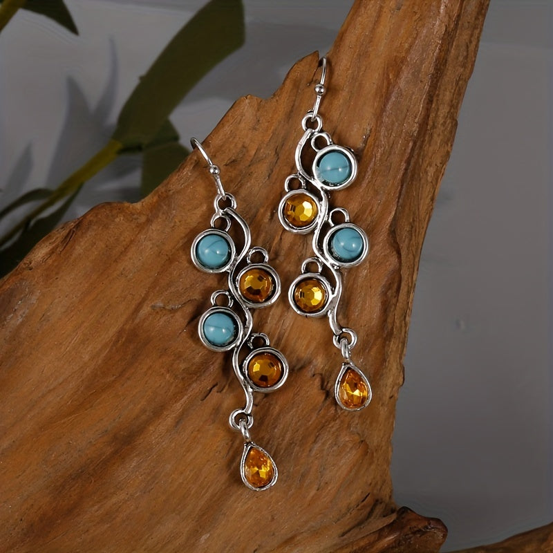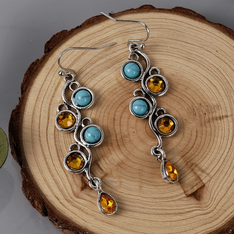 These earrings are a perfect addition to your jewelry collection. They feature a unique vintage geometric design with turquoise and zircon accents, creating a stylish look for any occasion.
