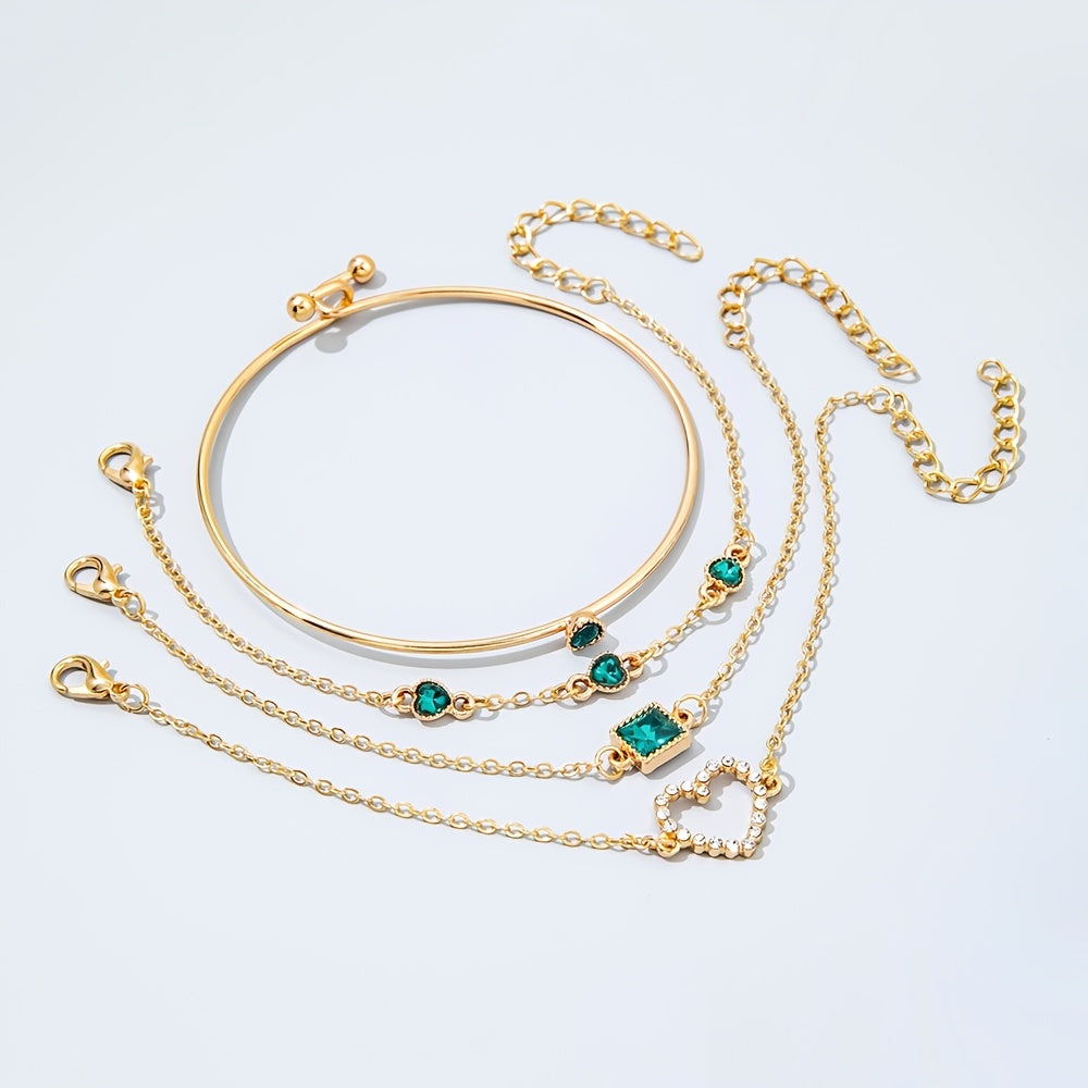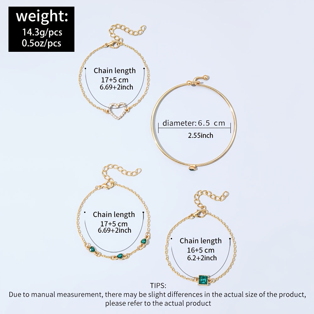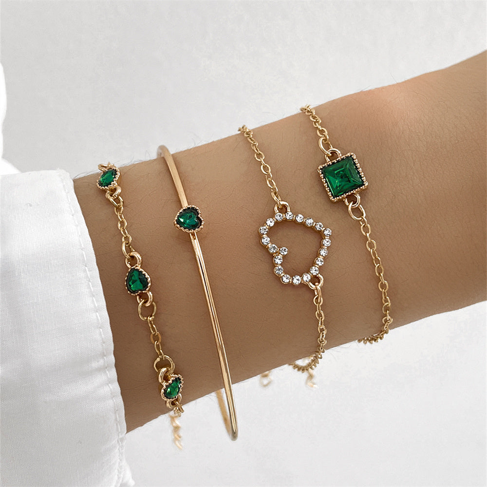 This set includes 4 delicate chain bracelets with green synthetic gemstones and hollow heart patterns. Perfect for a vintage jewelry lover or street photography enthusiast.
