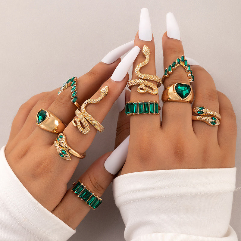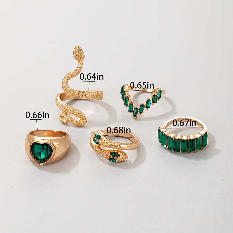 Add a touch of vintage charm to your look with this set of 5 green gemstone snake rings. Perfect for parties and special occasions.