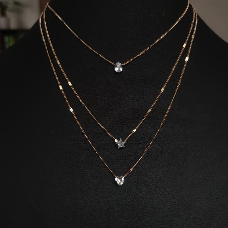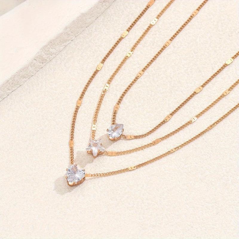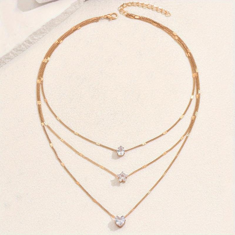 Elevate your outfit with this vintage-inspired layer necklace featuring stunning star, heart, and teardrop rhinestone pendants. Perfect for adding a touch of glamour to any look.