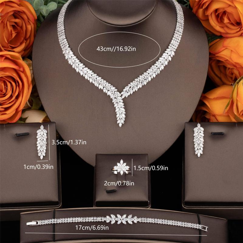 This stunning vintage wedding jewelry set features leaf-shaped cubic zirconia inlay on necklace, earrings, bracelet, and ring in a Middle Eastern style, perfect for weddings.